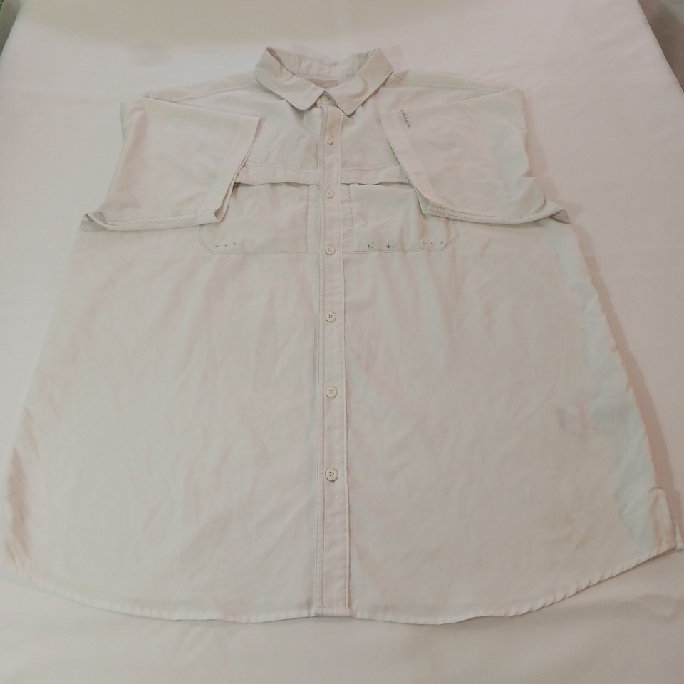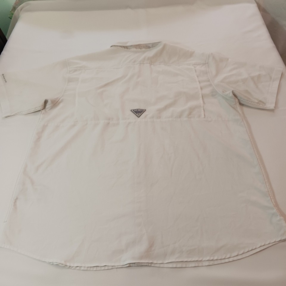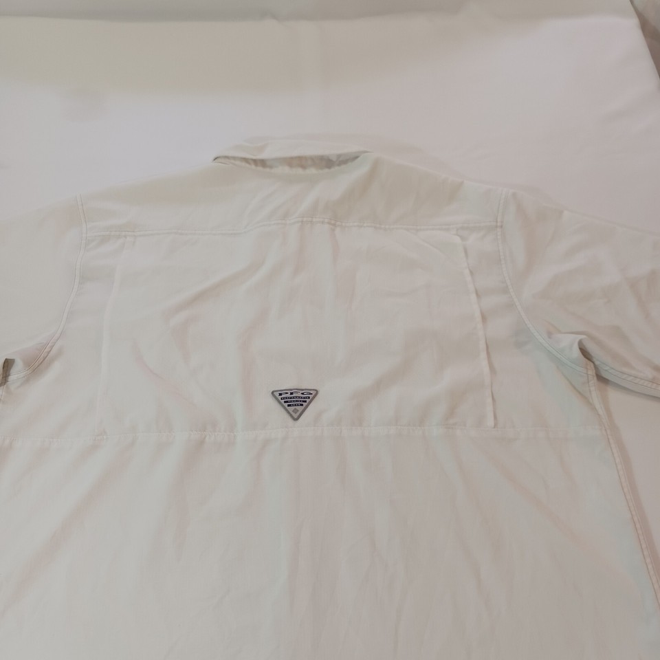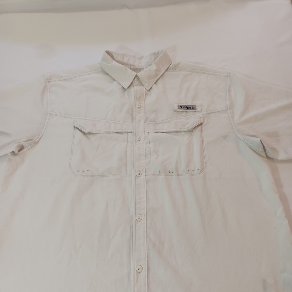Introducing a versatile and stylish button-up shirt by Columbia, perfect for any occasion. This shirt features a solid pattern, short sleeves, and a collared neckline with a button-down closure. It comes in a size L, with a relaxed fit and a chest size of 51". The shirt is machine washable, making it easy to care for.