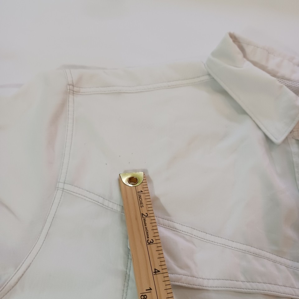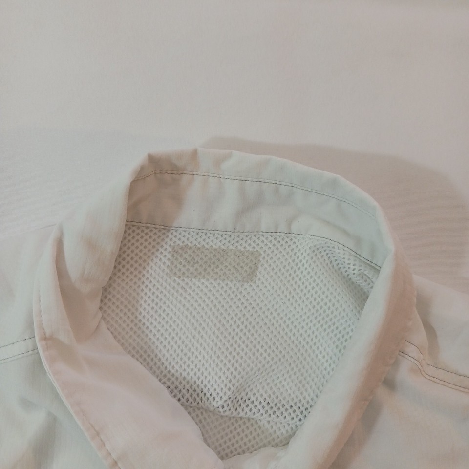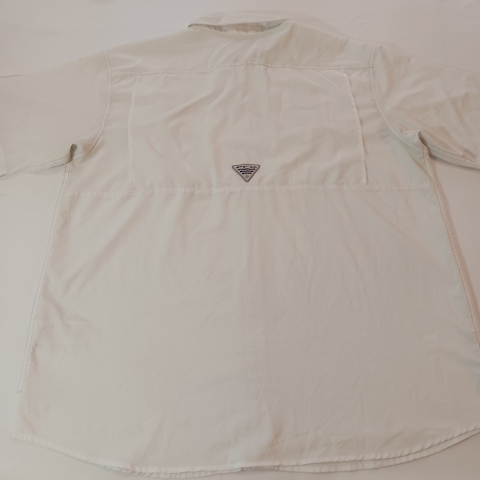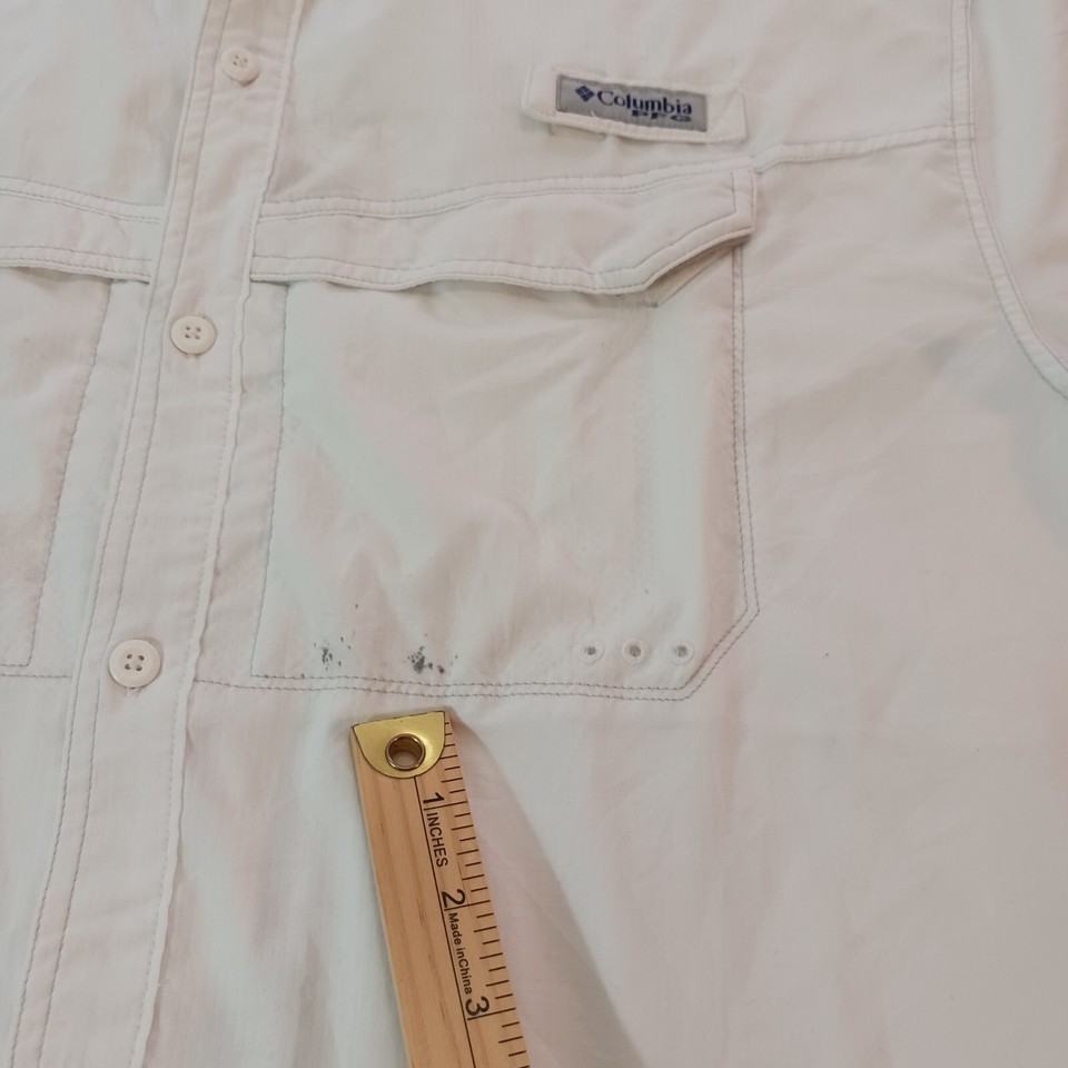 Introducing a versatile and stylish button-up shirt by Columbia, perfect for any occasion. This shirt features a solid pattern, short sleeves, and a collared neckline with a button-down closure. It comes in a size L, with a relaxed fit and a chest size of 51". The shirt is machine washable, making it easy to care for.