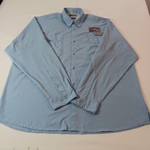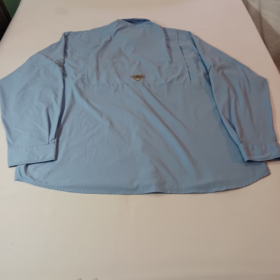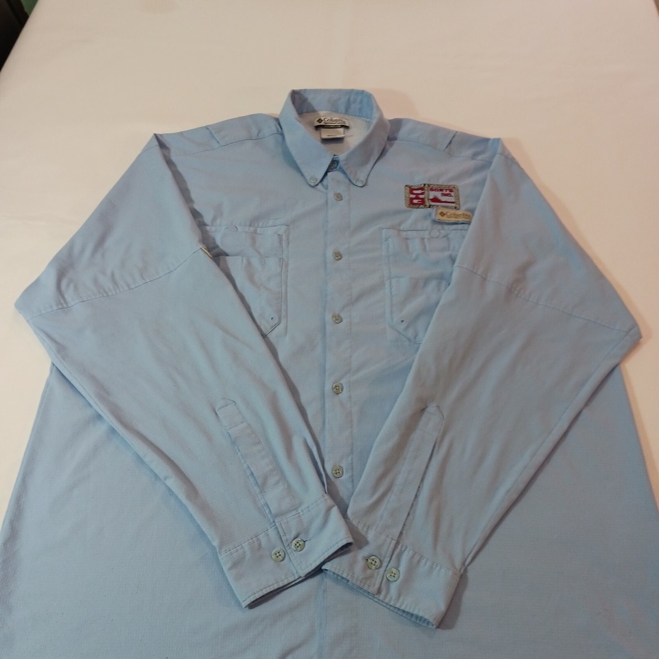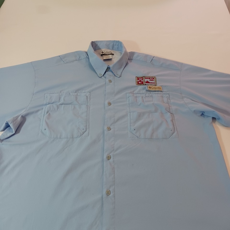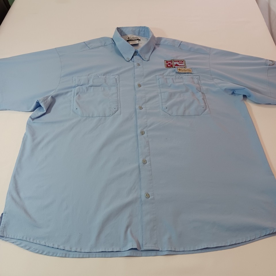 Introducing the Columbia FM7055 BOAT INC Men's Blue Button-Down Shirt, perfect for any occasion whether it be travel, casual outings, or workwear. This shirt is made with lightweight and quick-drying fabric, making it perfect for those warmer days. It also features a collared neckline and long sleeves with buttoned cuffs for added style and comfort. The shirt has a regular fit and is available in size 2XL with a chest size of 52 inches.