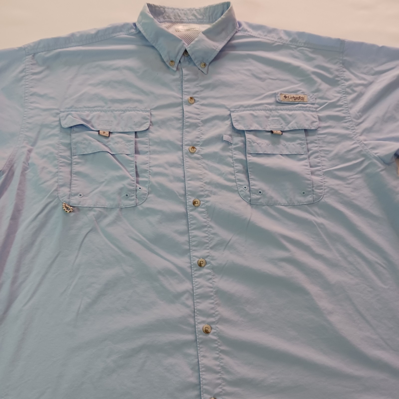 The shirt's solid blue color and subtle Columbia logo accent lend it a classic, versatile look, while the vented design and button-down collar offer breathability and a touch of style. With a chest size of 58 inches and a regular fit, it provides a relaxed and comfortable wear for the modern man. Whether you're facing the elements or simply enjoying a day out, this shirt is crafted to keep you at ease.