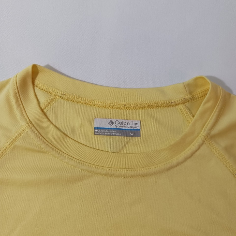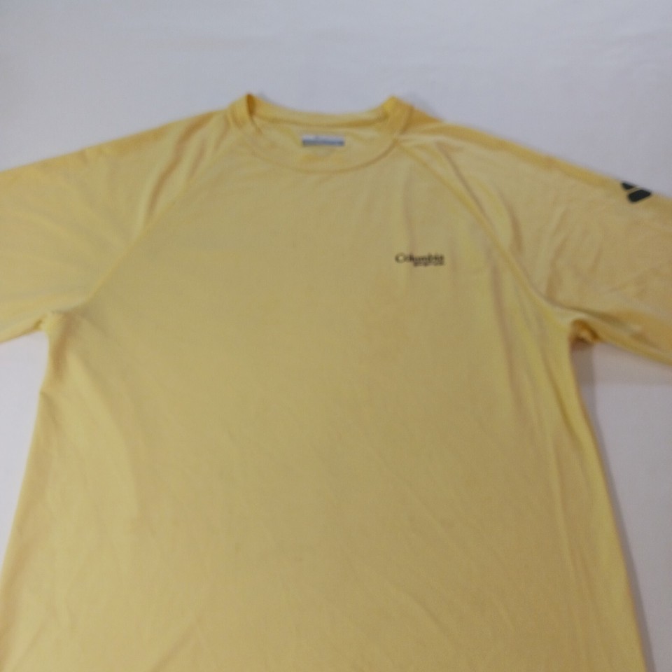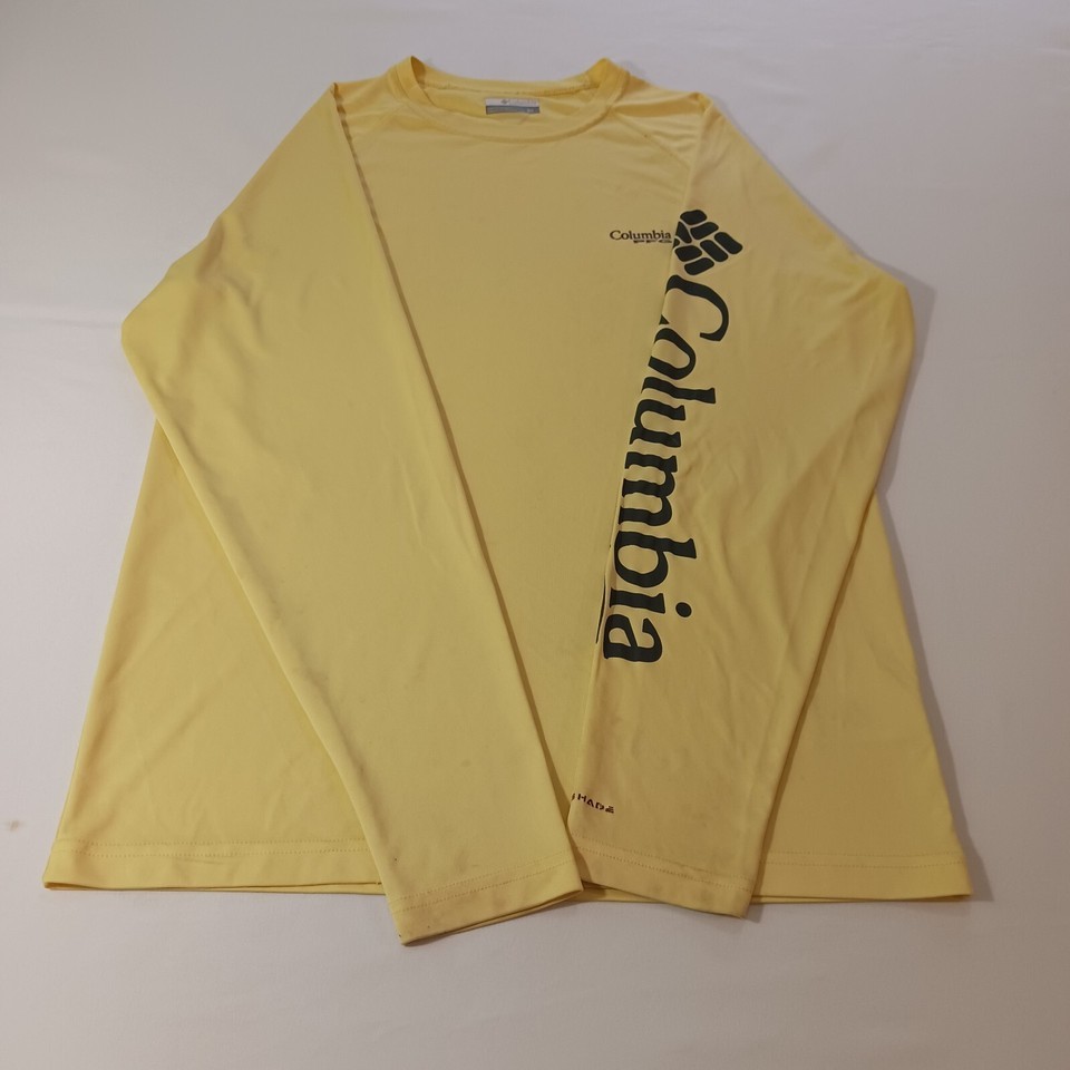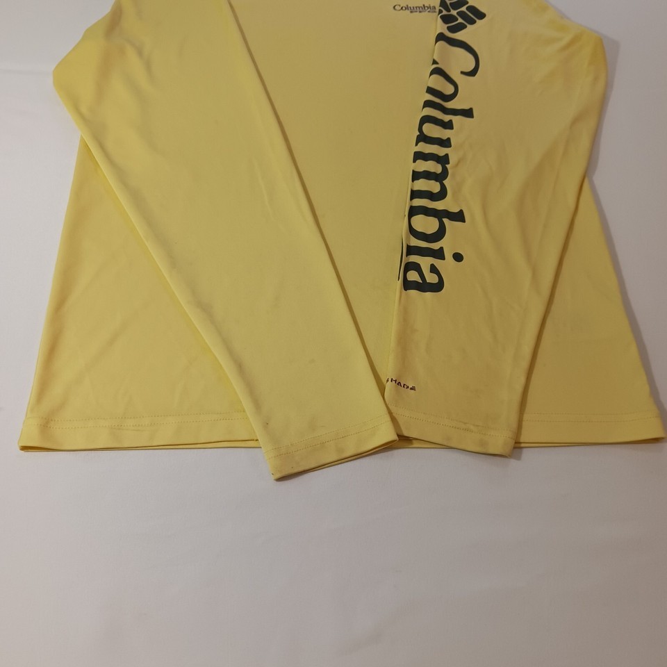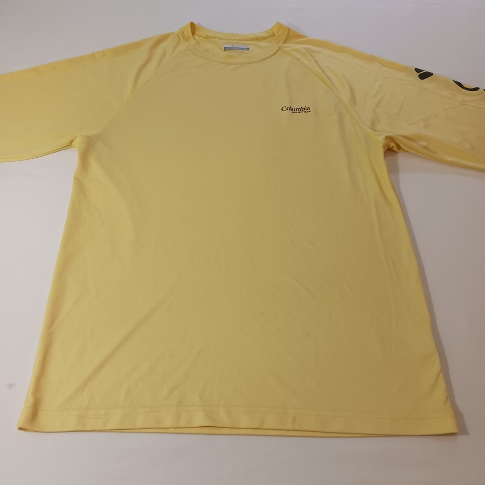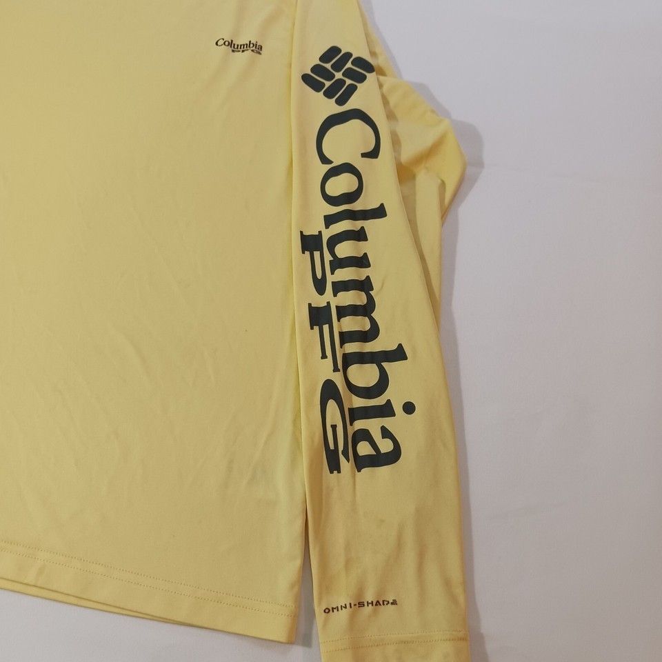 This Columbia PFG Omni-Shade button-up shirt is perfect for any occasion, whether it's for travel, casual wear, or work. The shirt features a crew neckline and long sleeves with a pullover closure. It comes in a bright yellow color with a graphic print of fish and a logo accent. The shirt is made of microfiber polyester fabric that is machine washable for easy care.
