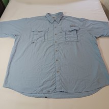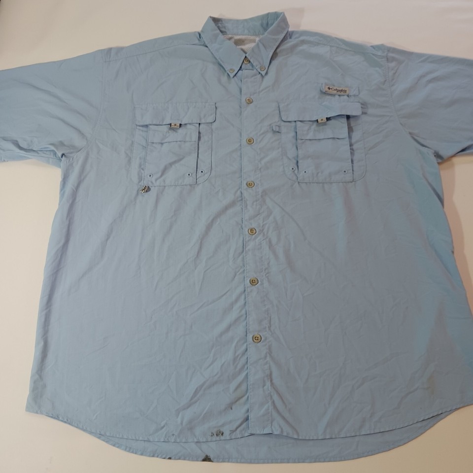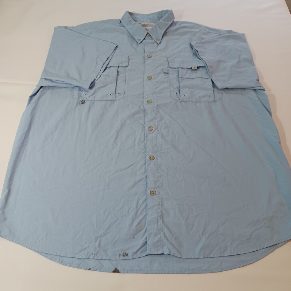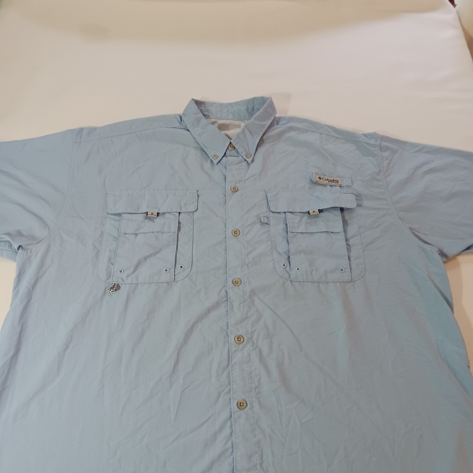 This Columbia PFG Omni Shade shirt is a classic short-sleeve button-up designed for men. It features a collared neckline with a button-down collar style, and the chest size measures 54 inches. The shirt comes in a solid blue color and is made of nylon material. The vintage status is unknown, but the brand is Columbia, known for its quality outdoor apparel. This shirt is part of the Men's Clothing department and is a regular fit size. Perfect for a casual and timeless style.