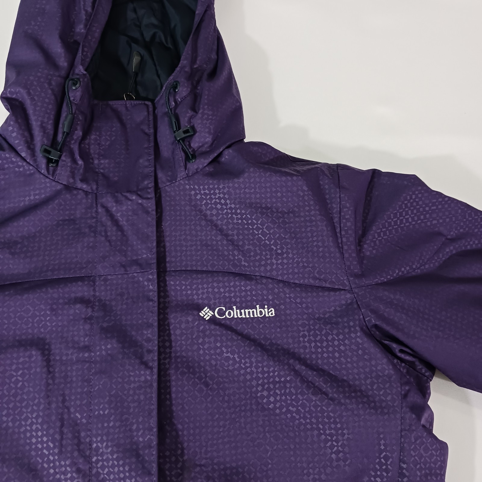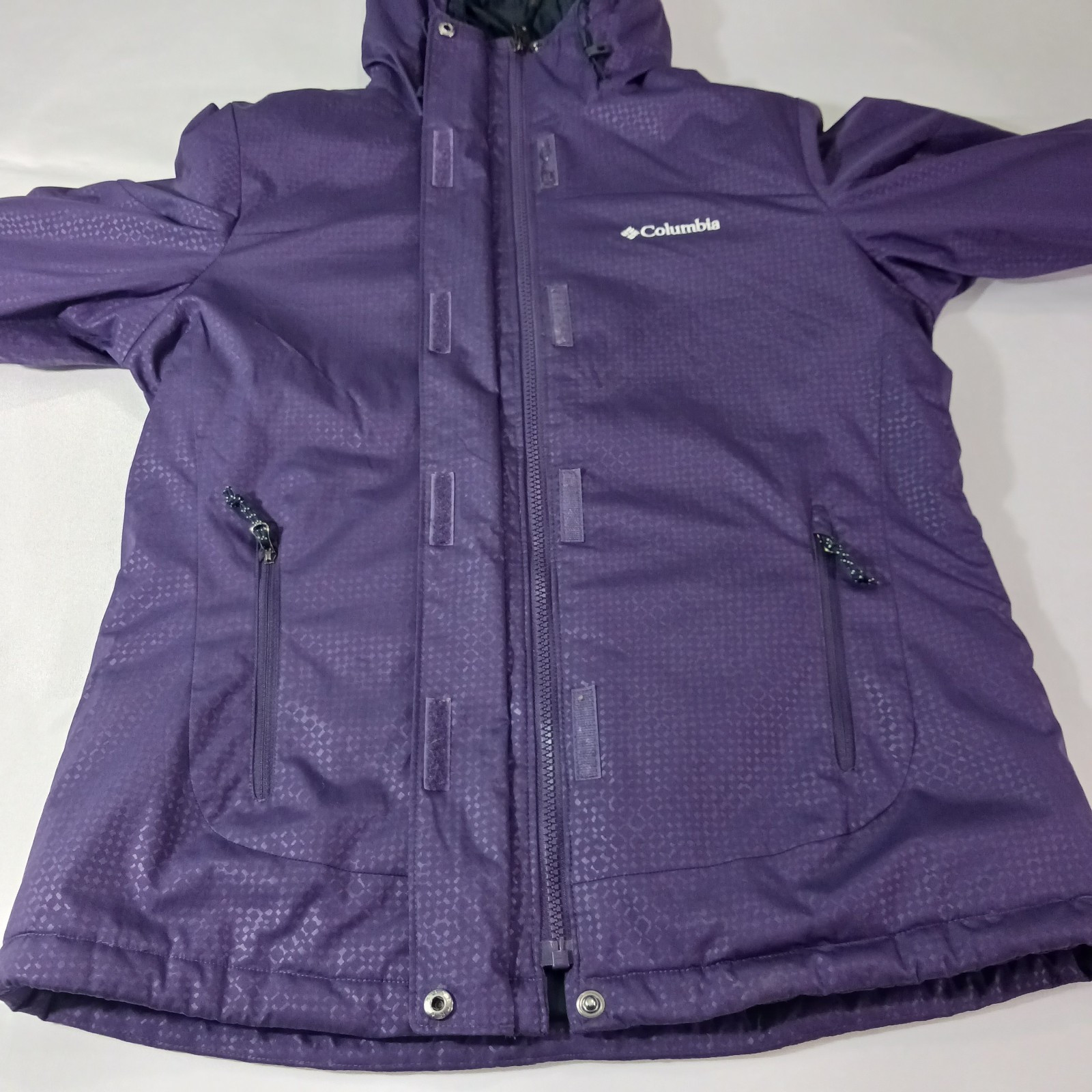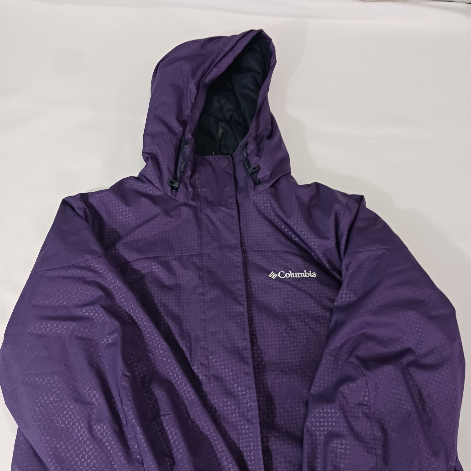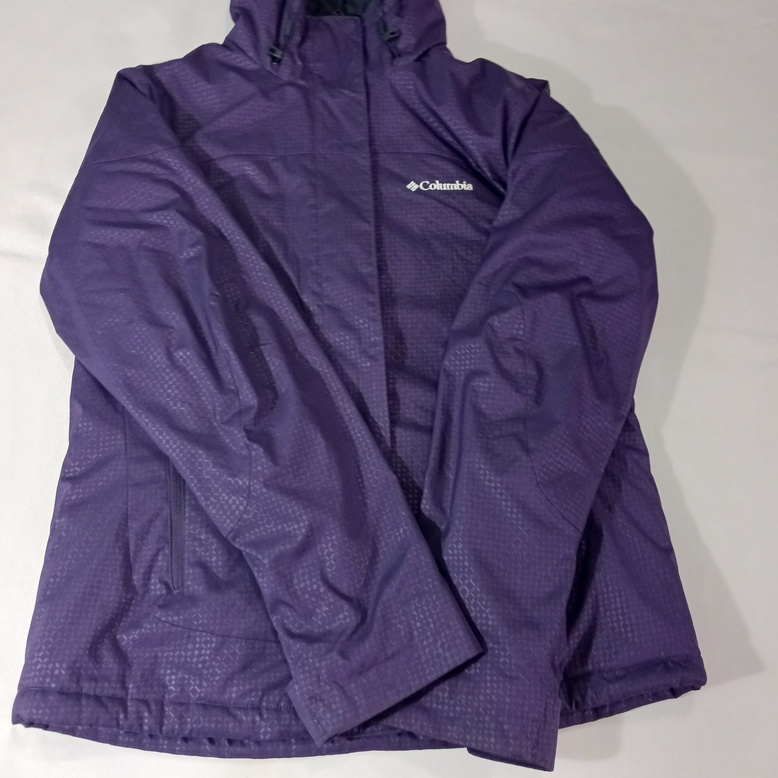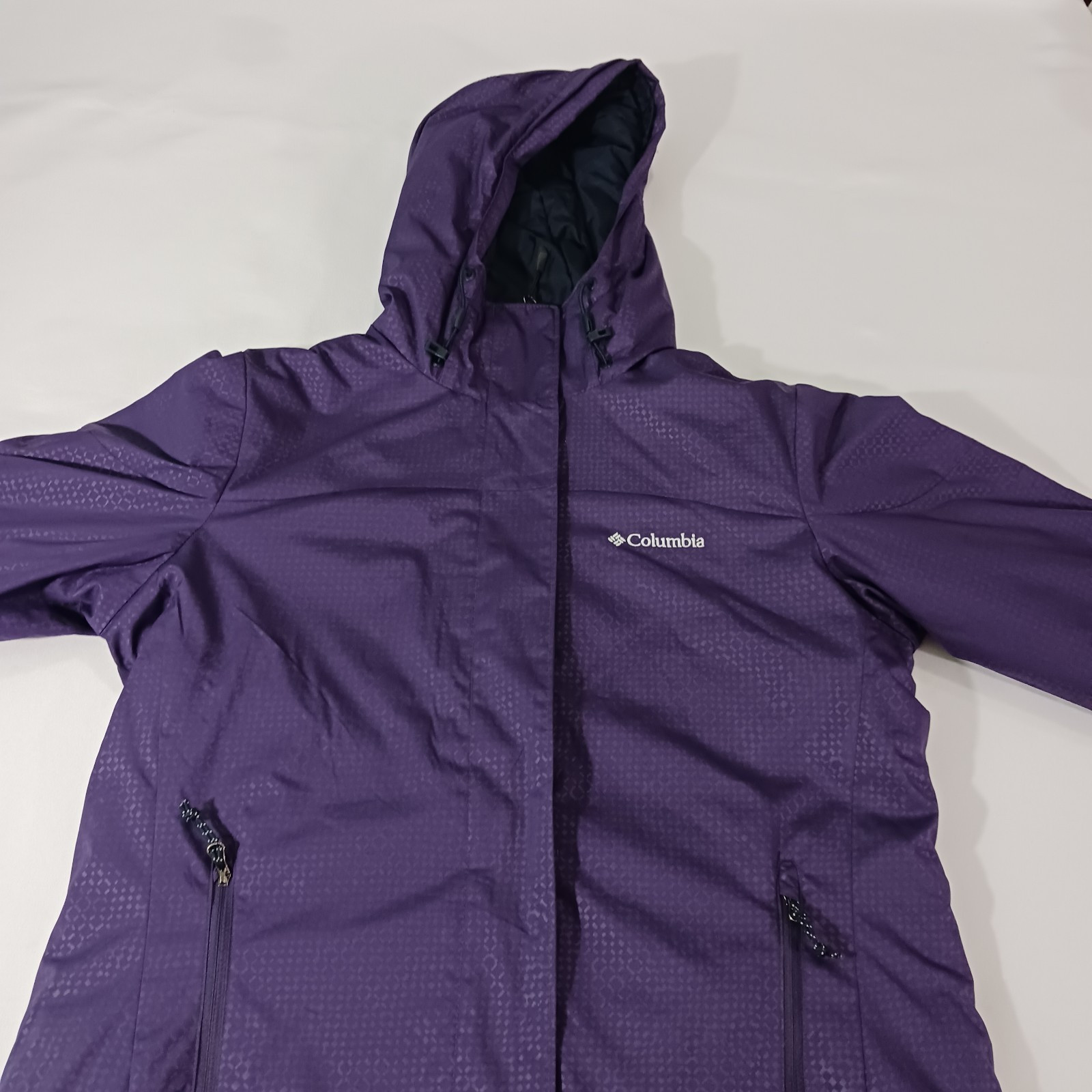 This Columbia SL5498 women's jacket in size M features a purple solid nylon outer shell with a polyester lining. The full-zip hoodie jacket has a length of 25.5 inches and is designed as a lightweight windbreaker. The Omni-Shield Advanced technology by Columbia ensures protection against the elements, making it a practical and stylish choice for outdoor activities.