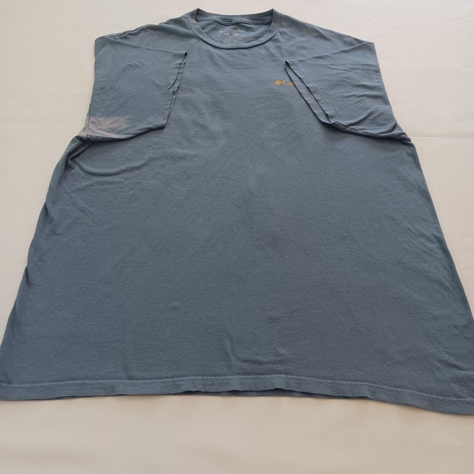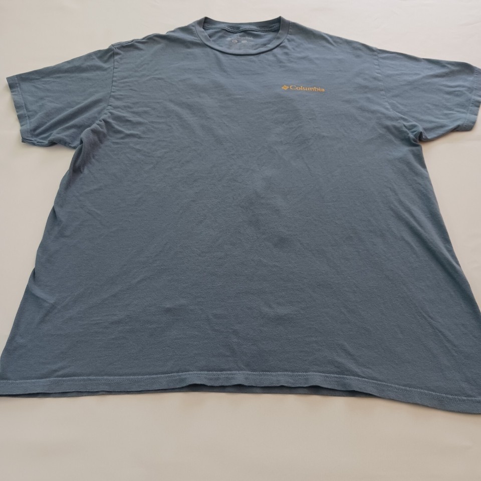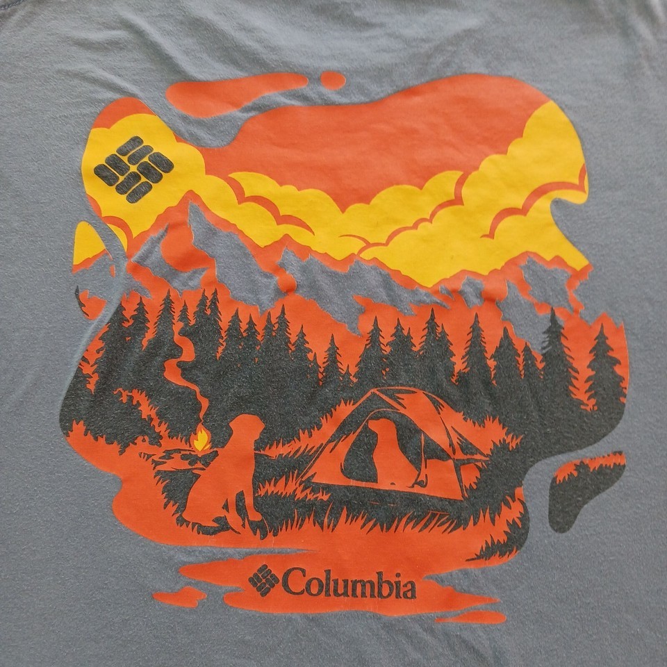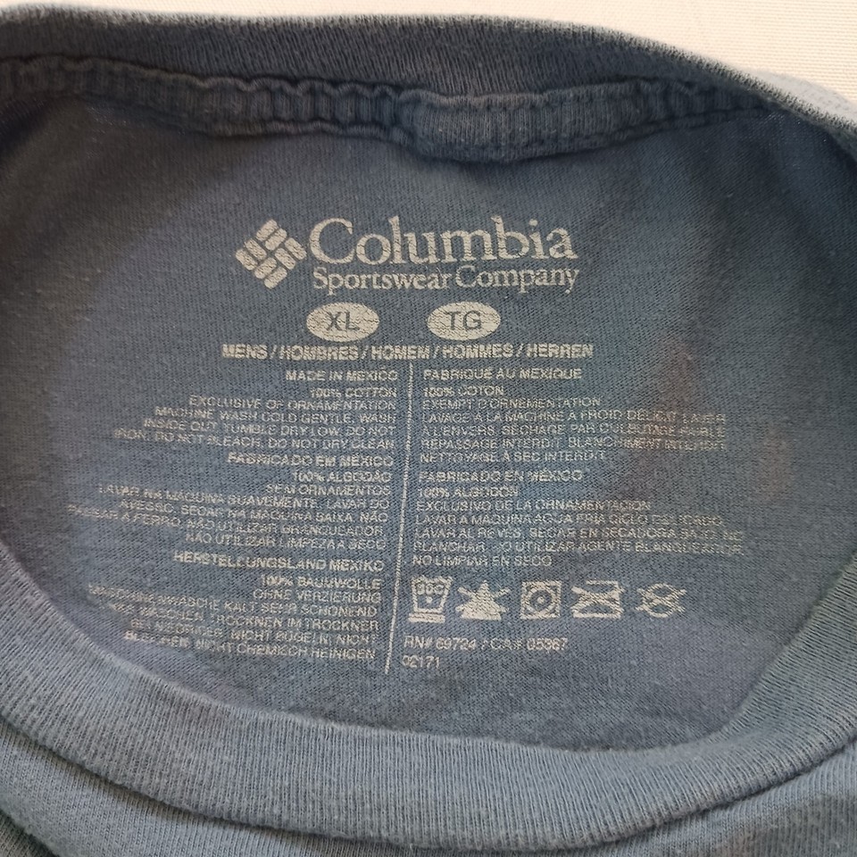 This Columbia shirt for men features a solid gray color with a graphic design, short sleeves, and a crew neck. It is made of cotton material and is available in size XL. The shirt is perfect for outdoor activities and all seasons. The brand is Columbia and the fit is regular. The shirt is designed for men and is great for any casual occasion. It is made in Mexico and is not vintage.