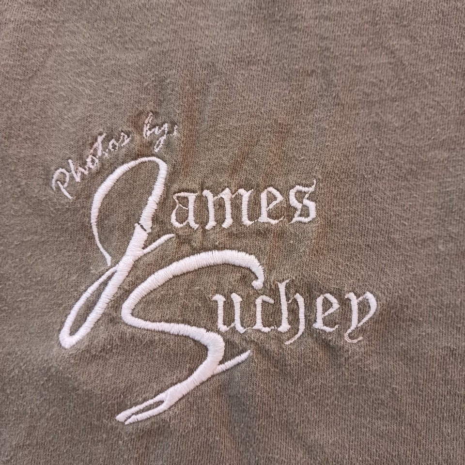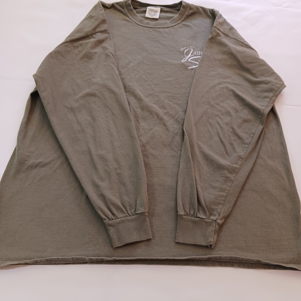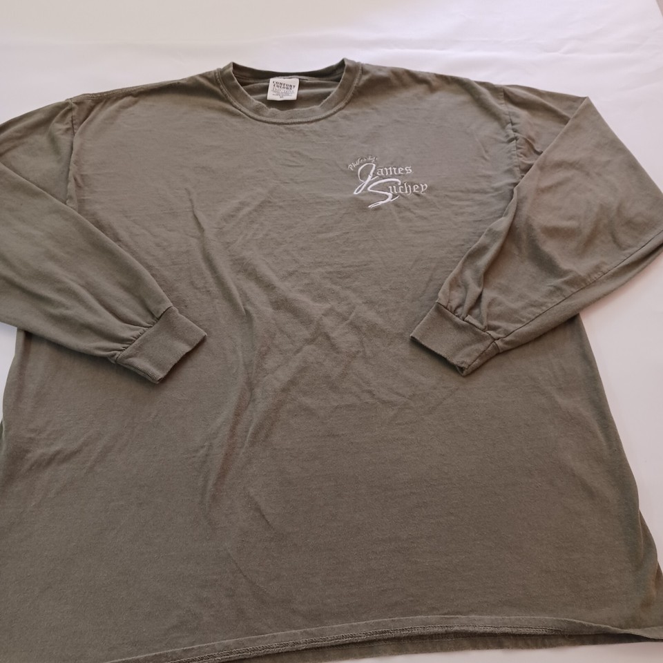 This product is a pre-owned Comfort Colors Chouinard T-Shirt for men in size XL. It features long sleeves and a gray color with a colorful theme. The shirt is made of preshrunk cotton and was manufactured in Honduras. The brand is Comfort Colors and the shirt is part of the James Suchen collection.