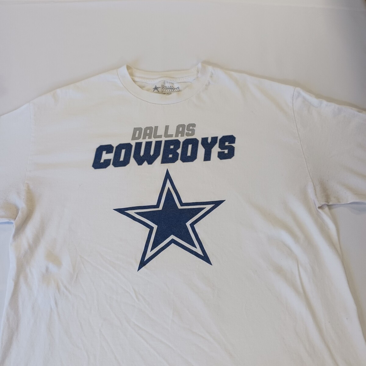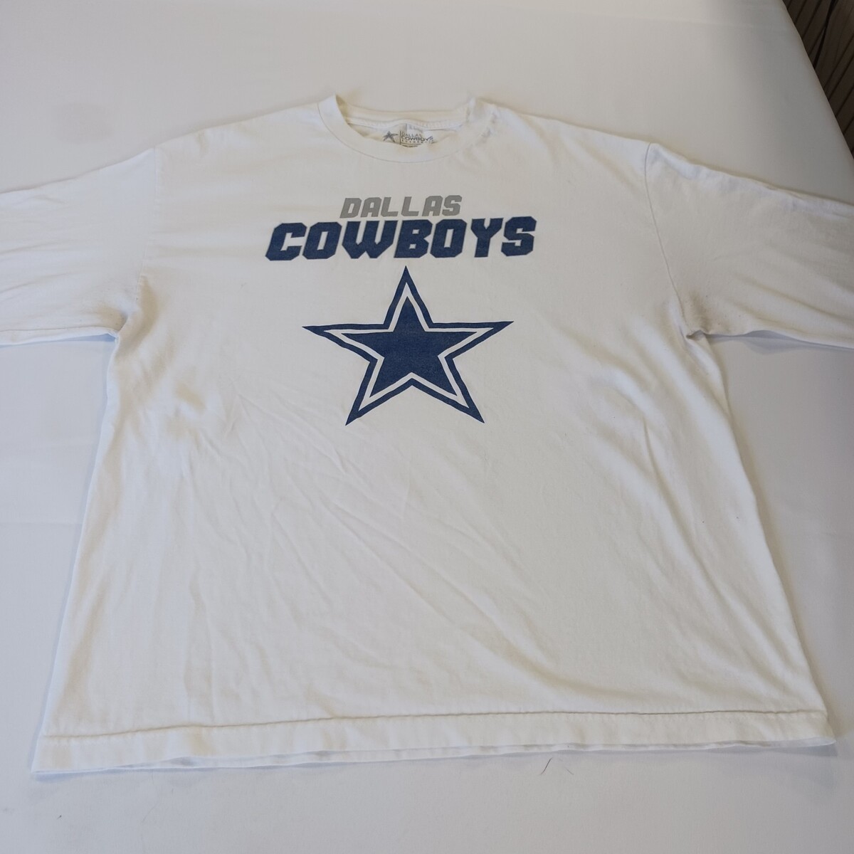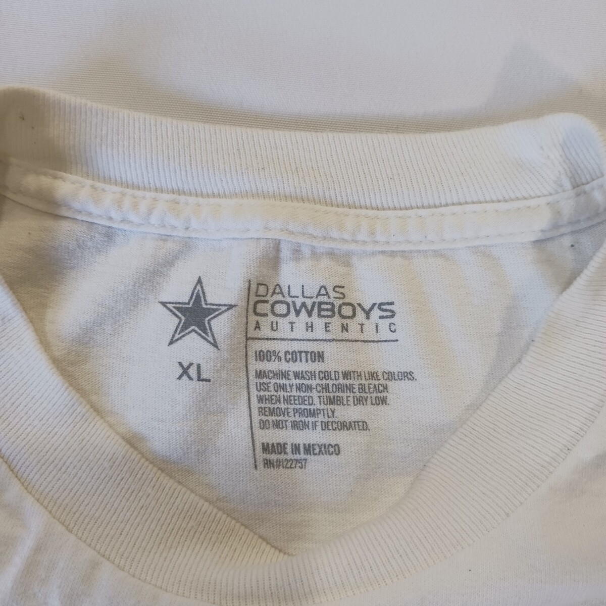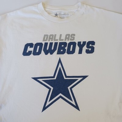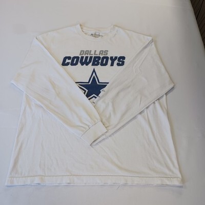 This product is an authentic Dallas Cowboys men's white long sleeve graphic t-shirt in size XL. It is officially licensed by the National Football League (NFL) and features the iconic team logo. Made of cotton, this shirt is perfect for football fans looking to show their support for the Dallas Cowboys in style. Made in Mexico, this shirt is a must-have for any fan of the team looking to represent their favorite team at NFL events or games.
