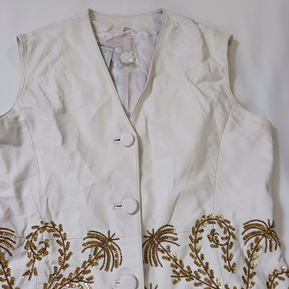 • Darshi Women's White Flower Design Real Leather Button Vest Jacket Size 16 image 14