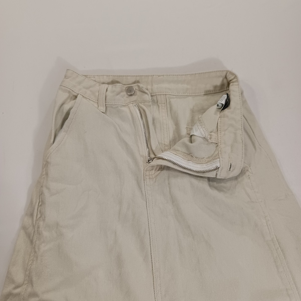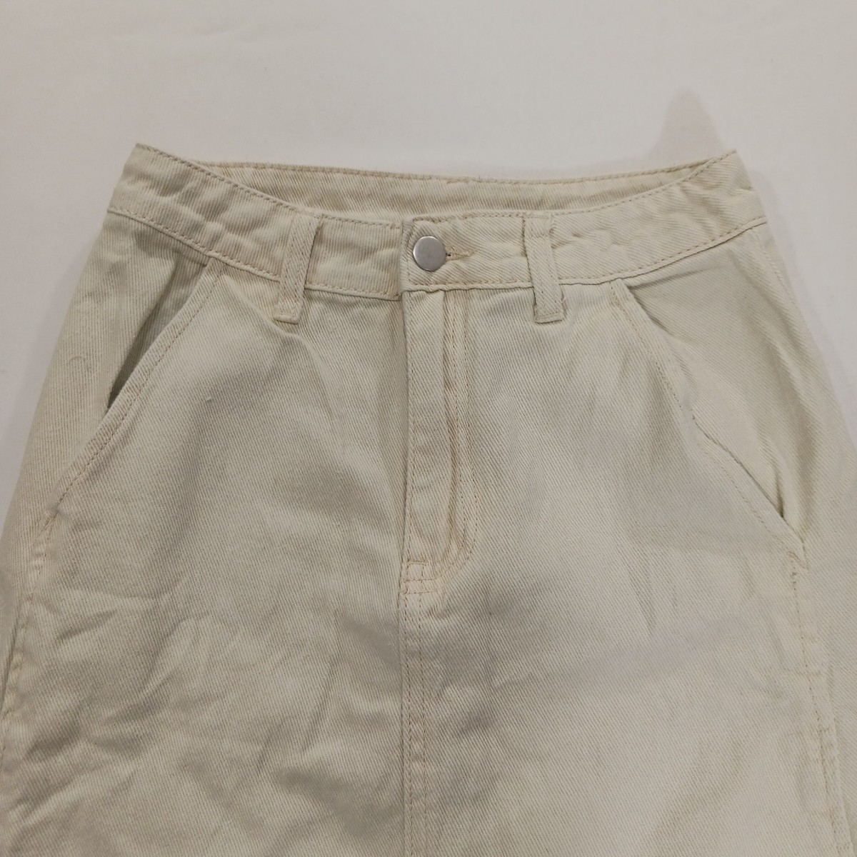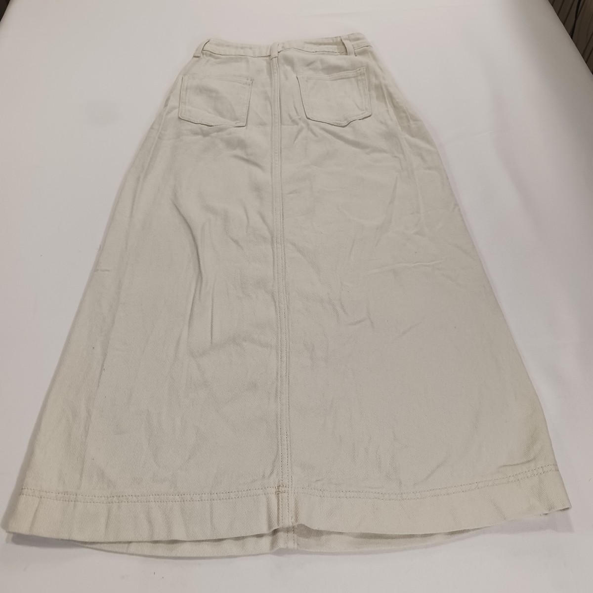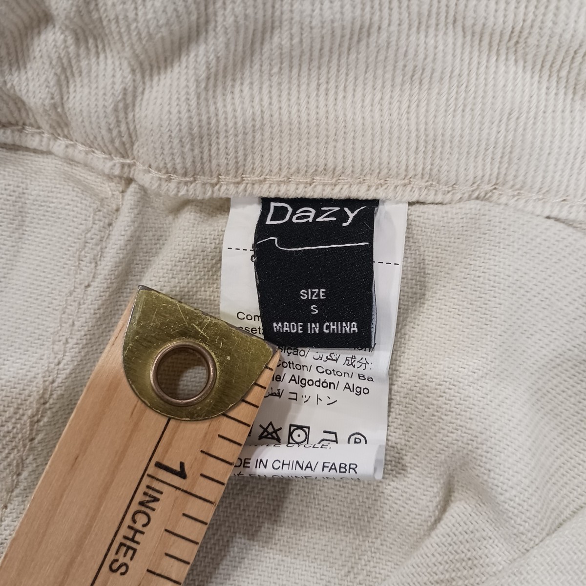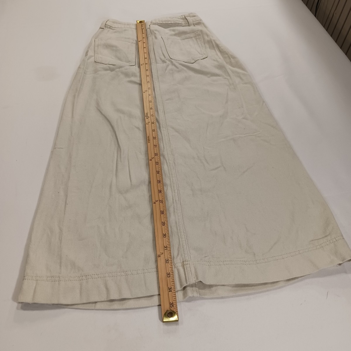 The Dazy Women's Beige/Cream Front Zipper Pull-On Skirt is a stylish and versatile piece perfect for party or casual occasions. Made from comfortable cotton material, this A-line skirt features a front zipper closure and pockets for added convenience. With a waist size of 24 inches and a skirt length of 35 inches, this size small skirt is easy to care for with machine washable instructions. The neutral beige color and solid pattern make it a classic addition to any woman's wardrobe, while the elastic waist ensures a comfortable fit.