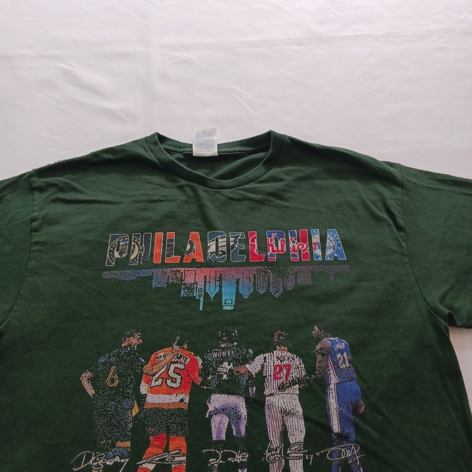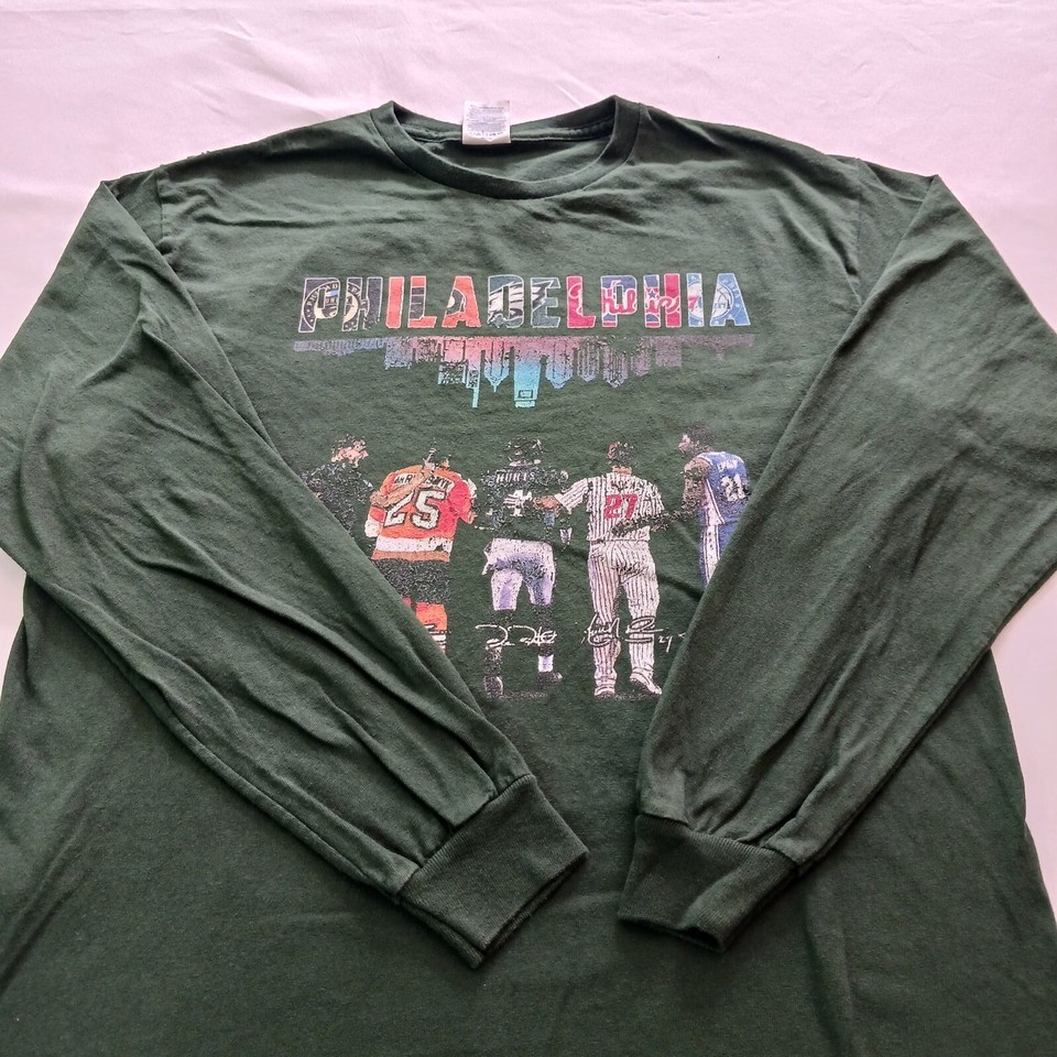 Show your love for Philadelphia sports with this green Delta Pro Weight T-Shirt. Made from comfortable cotton, this shirt features a solid pattern with a crew neckline and long sleeves. It has a logo accent and graphic print, perfect for any sports fan. The shirt is preshrunk and available in size L, making it a great addition to any wardrobe. Whether it's for winter, fall, or spring, this shirt is a must-have for any Philadelphia sports fan.