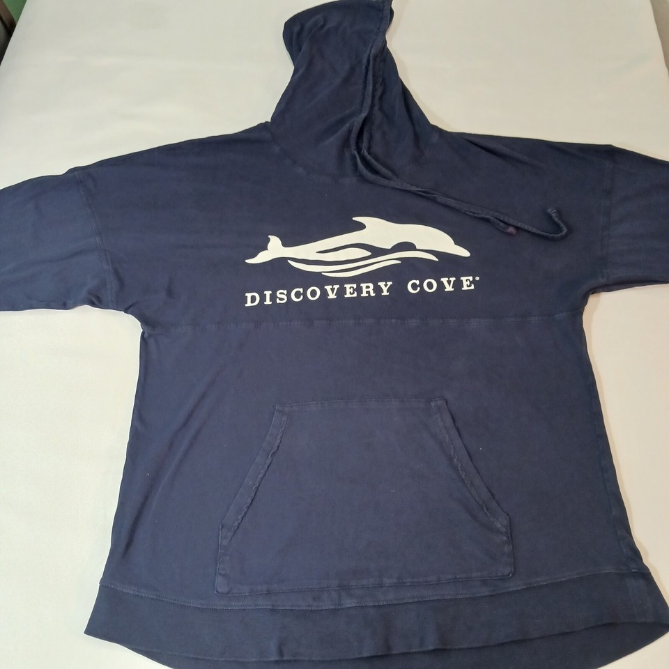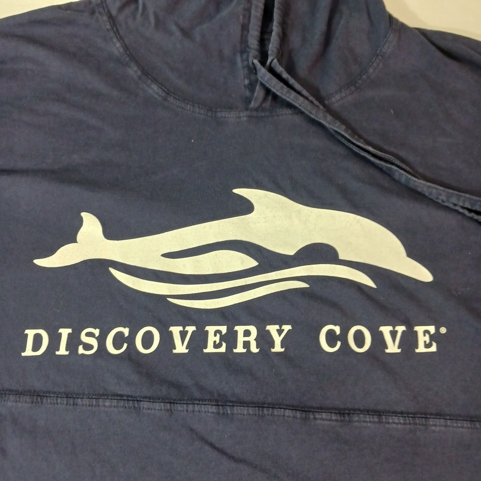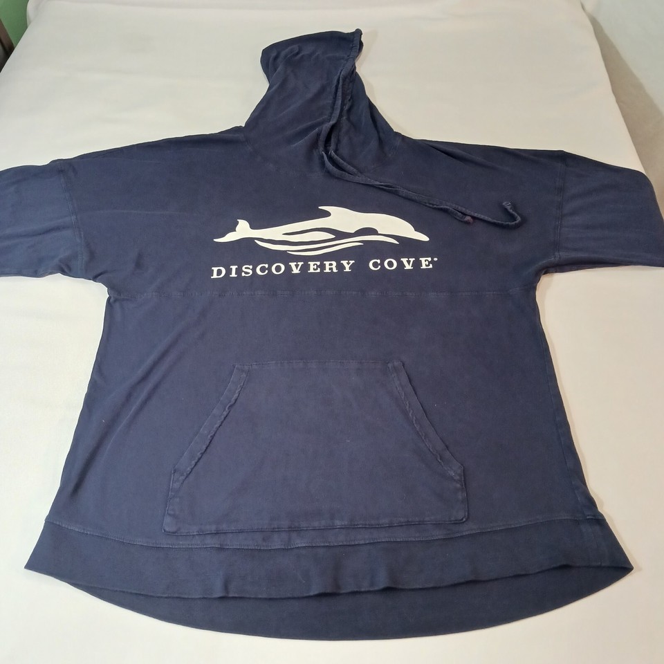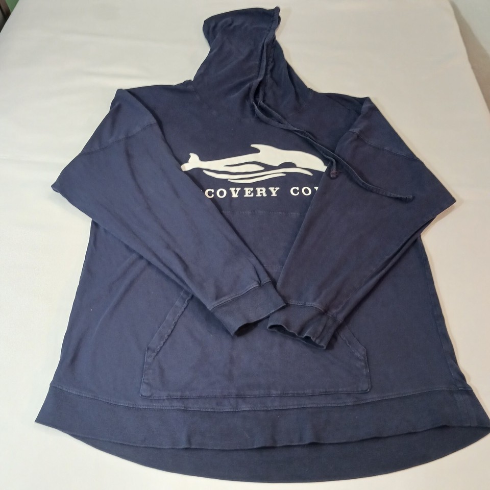 This is a Discovery Cove men's blue hoodie sweatshirt in regular size with a solid pattern. It features a drawstring closure, long sleeves, and a pullover style suitable for all seasons. Made of polyester and cotton blend, this unisex adult sweatshirt has a measured chest size of 48 inches. Perfect for casual wear, this sweatshirt combines comfort and style for a versatile addition to any wardrobe.