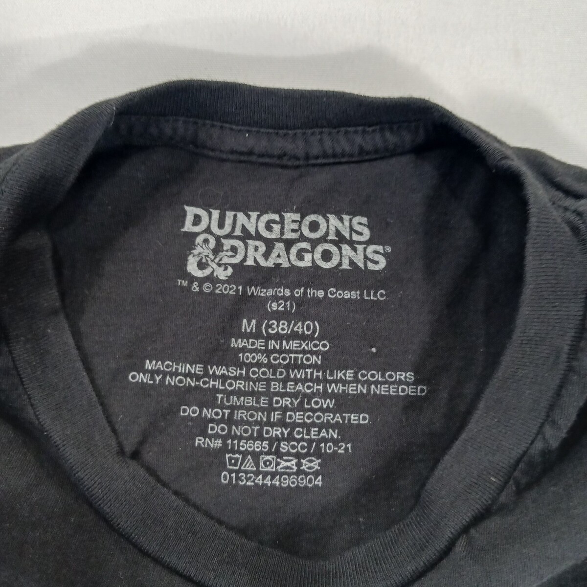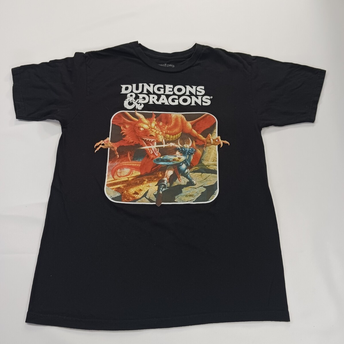 The Dungeons & Dragons RN#115665 Men's M (38/40) Black Cotton Short Sleeve Graphic T-Shirt is a stylish retro-themed shirt made from soft cotton material. The shirt features a classic Dungeons & Dragons logo on the front, perfect for fans of the iconic tabletop role-playing game. With a regular fit and short sleeves, this shirt is comfortable to wear for both casual outings and gaming sessions. The black color adds a sleek and versatile touch to the overall design, making it a great addition to any fan's wardrobe.