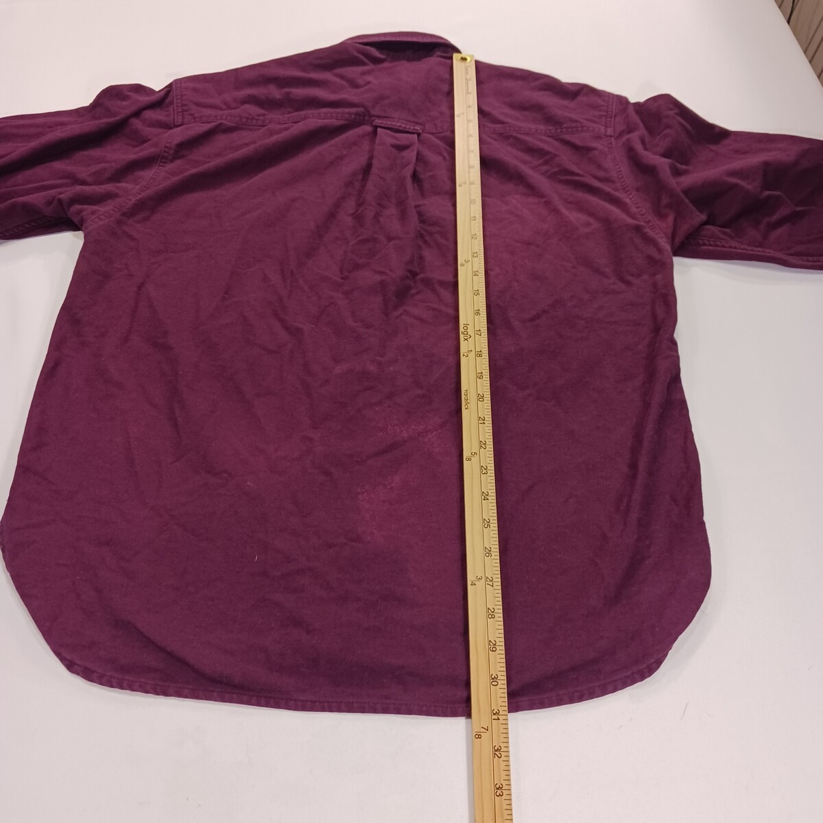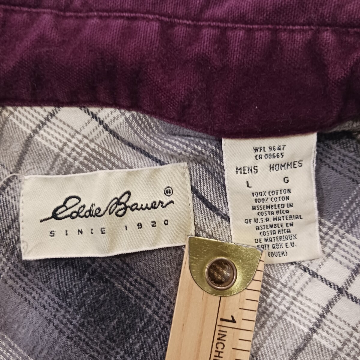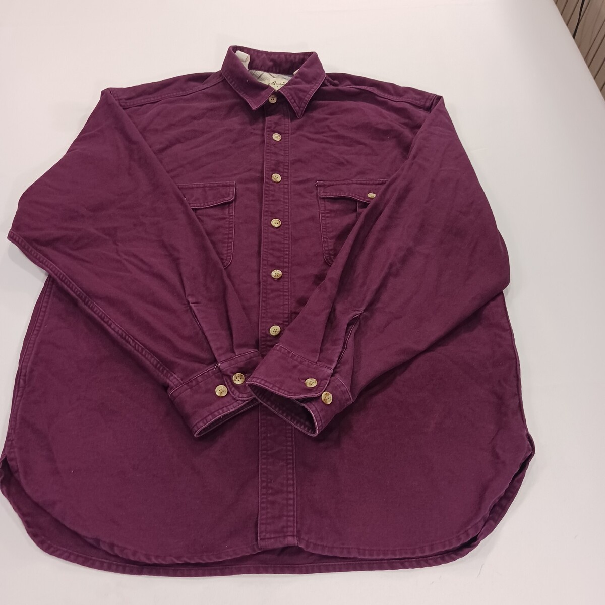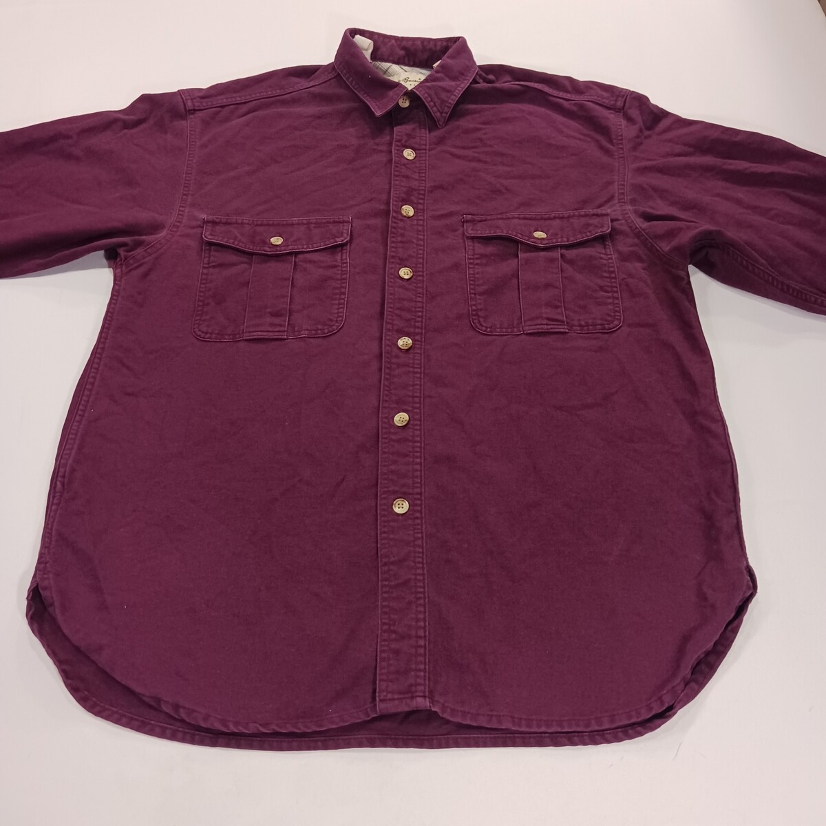 The product is a vintage Eddie Bauer men's red heavyweight cotton long sleeve shirt in size large. This button-up shirt features a solid red color with a collared neck and pleated accents. Made from flannel fabric, it is machine washable and perfect for outdoor, casual, or workwear occasions. With a regular fit and chest size of 48 inches, this shirt also includes pockets and is ideal for the winter, fall, and spring seasons. Made in Costa Rica, it is a versatile and stylish addition to any man's wardrobe.