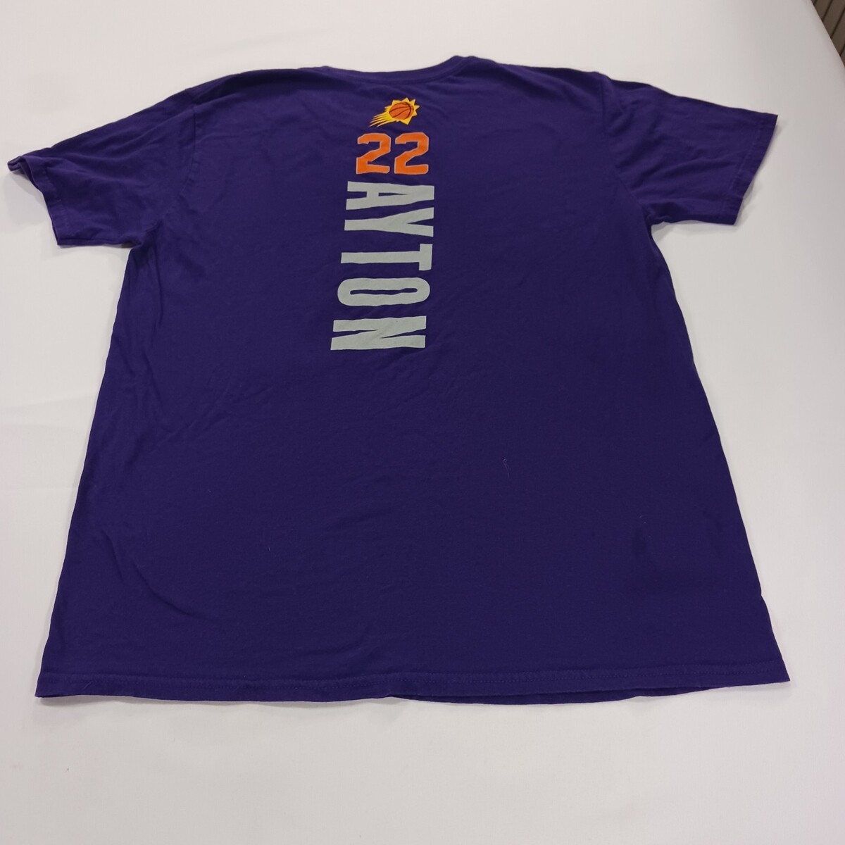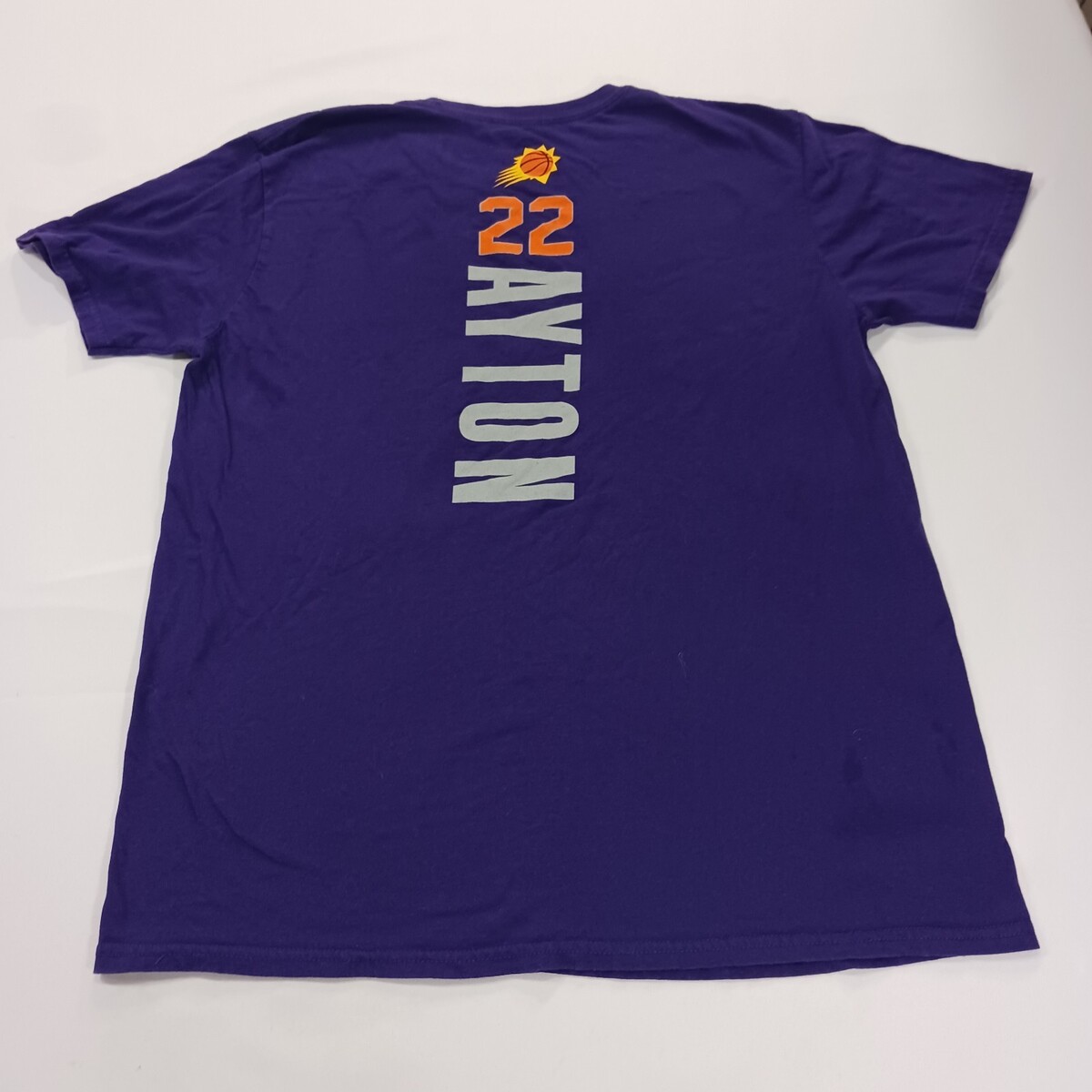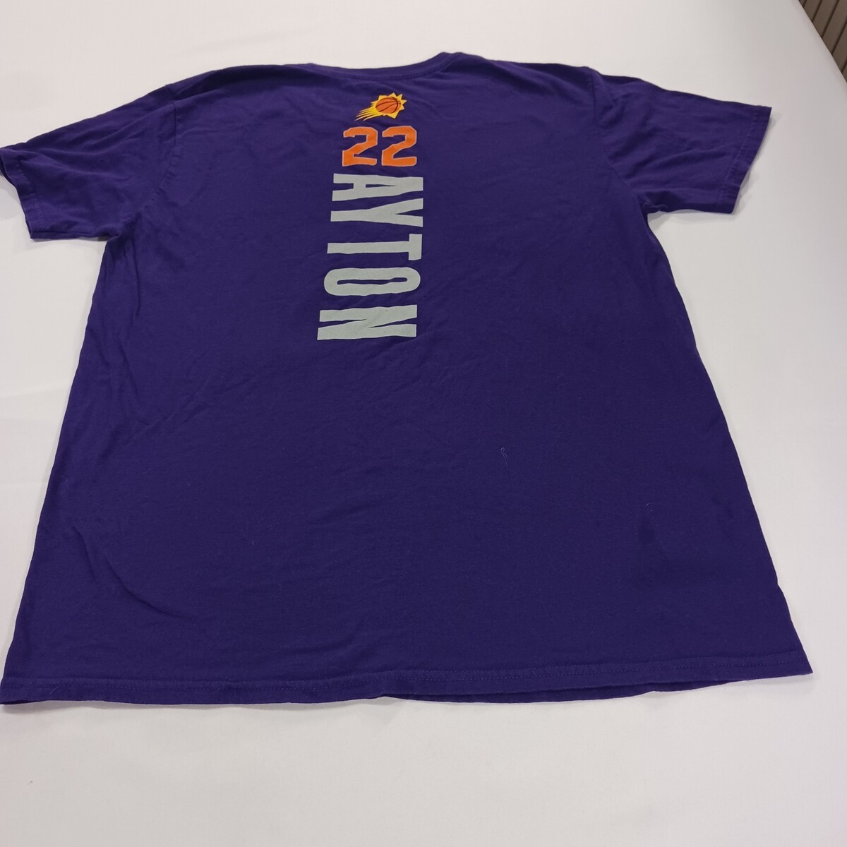 This product is an officially licensed NBA Deandre Ayton #22 Phoenix Suns men's purple graphic T-shirt by Fanatics. The shirt is made in Nicaragua and features the player's name and team logo, perfect for any basketball fan looking to show their support. With a size L and a focus on the National Basketball Association, this shirt is a must-have for fans of both Ayton and the Phoenix Suns.