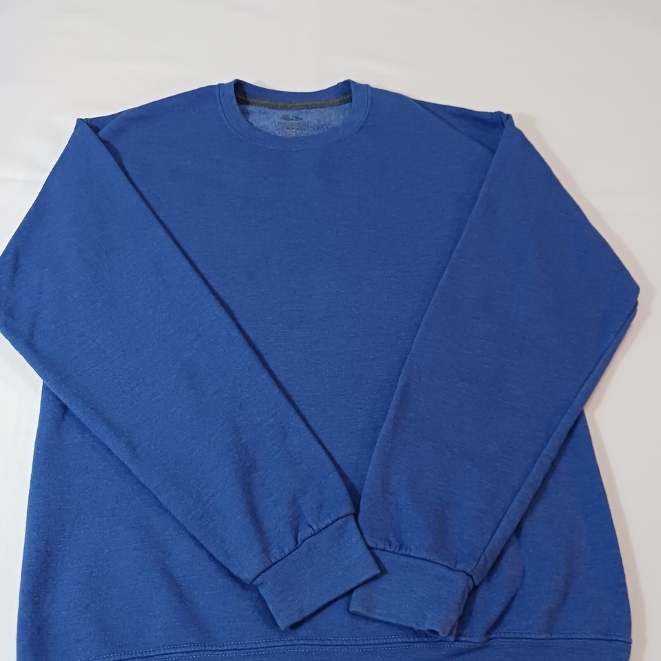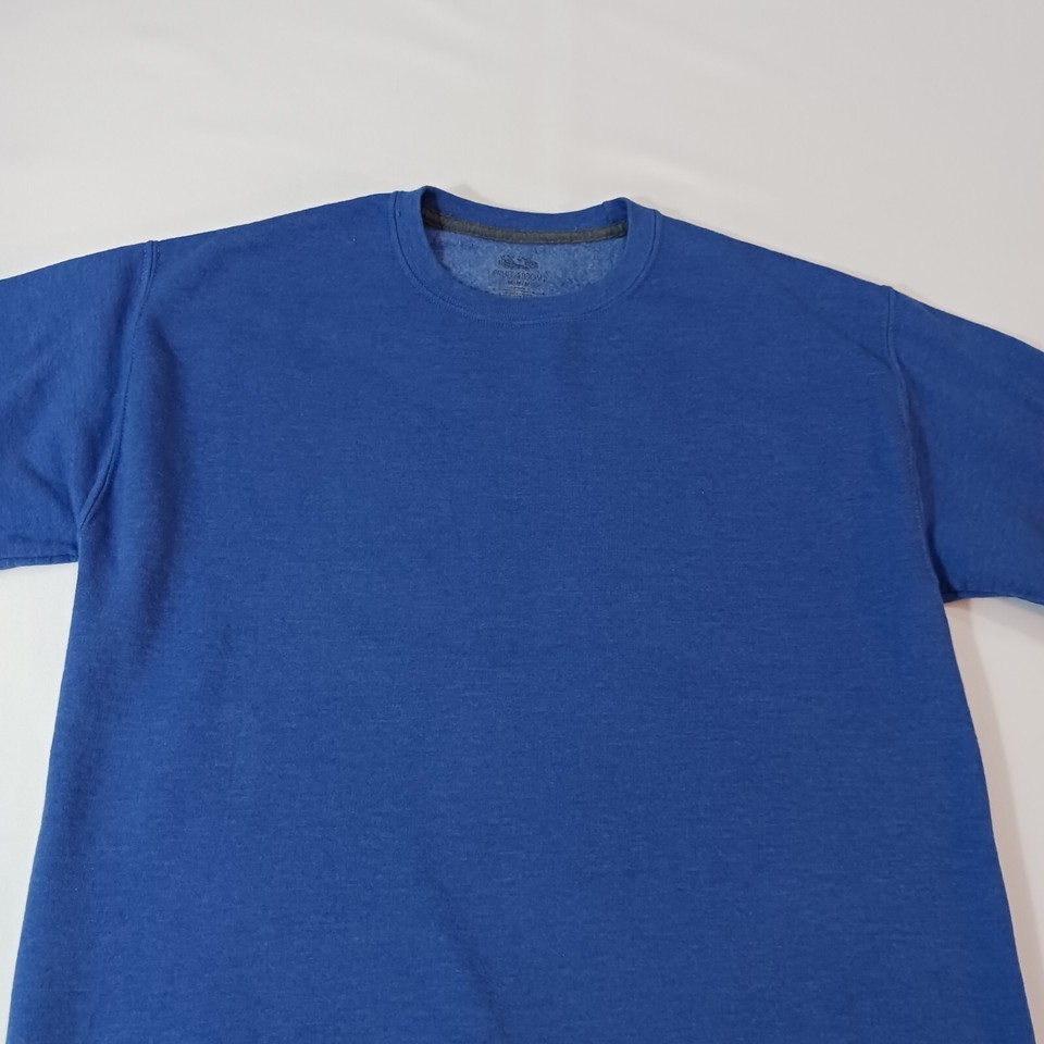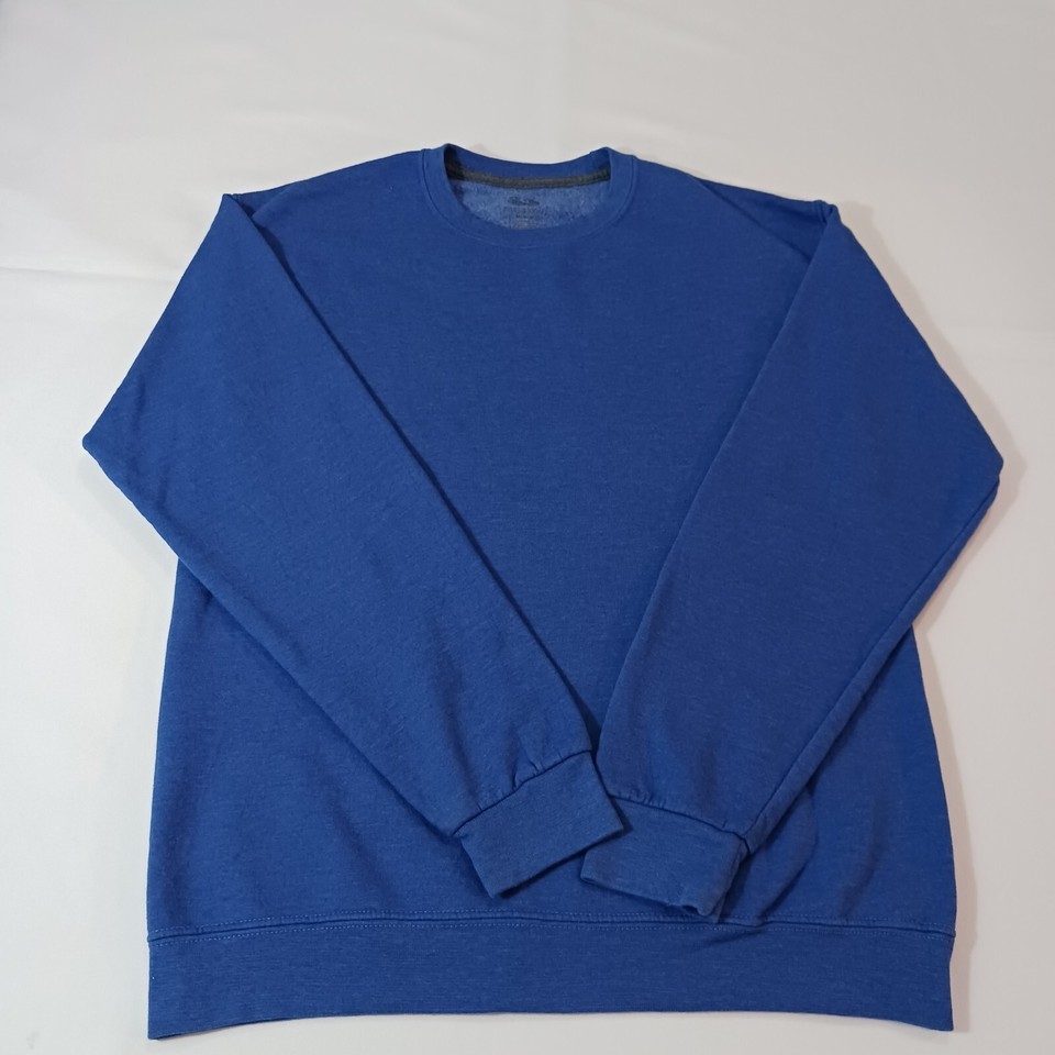 The Fruit of the Loom Men's Blue Cotton Blend Pullover is a comfortable sweatshirt in size M. It features a regular fit with long sleeves and a round neckline, ideal for casual wear. Made from a cotton blend fabric, this gray sweatshirt is designed as a pullover style with a fleece interior, providing warmth and versatility for everyday use.