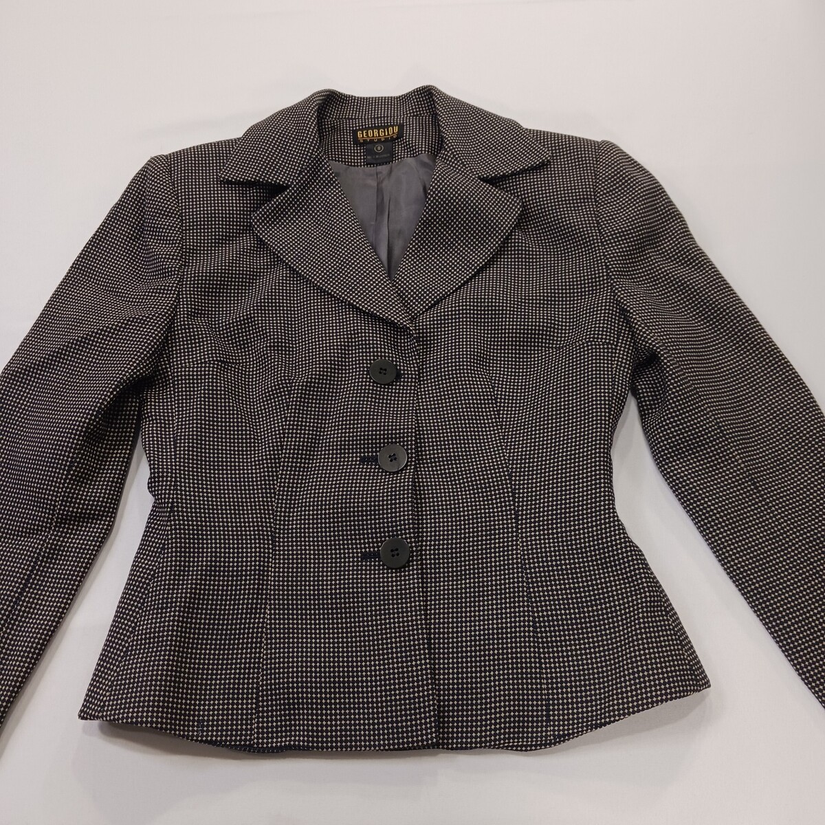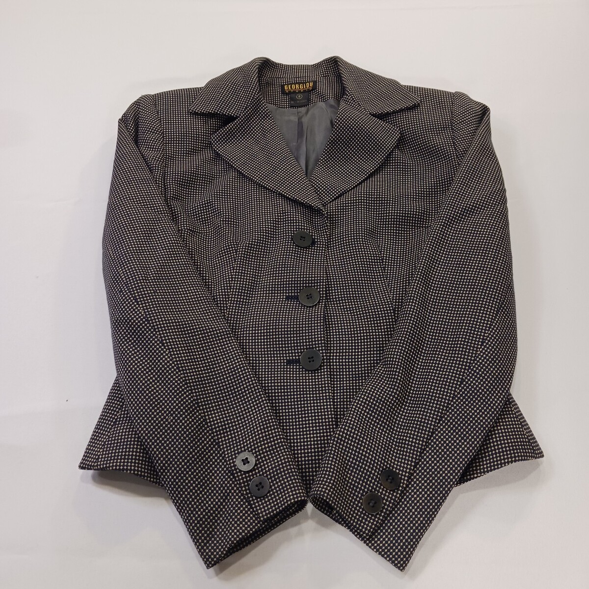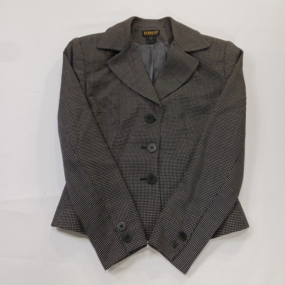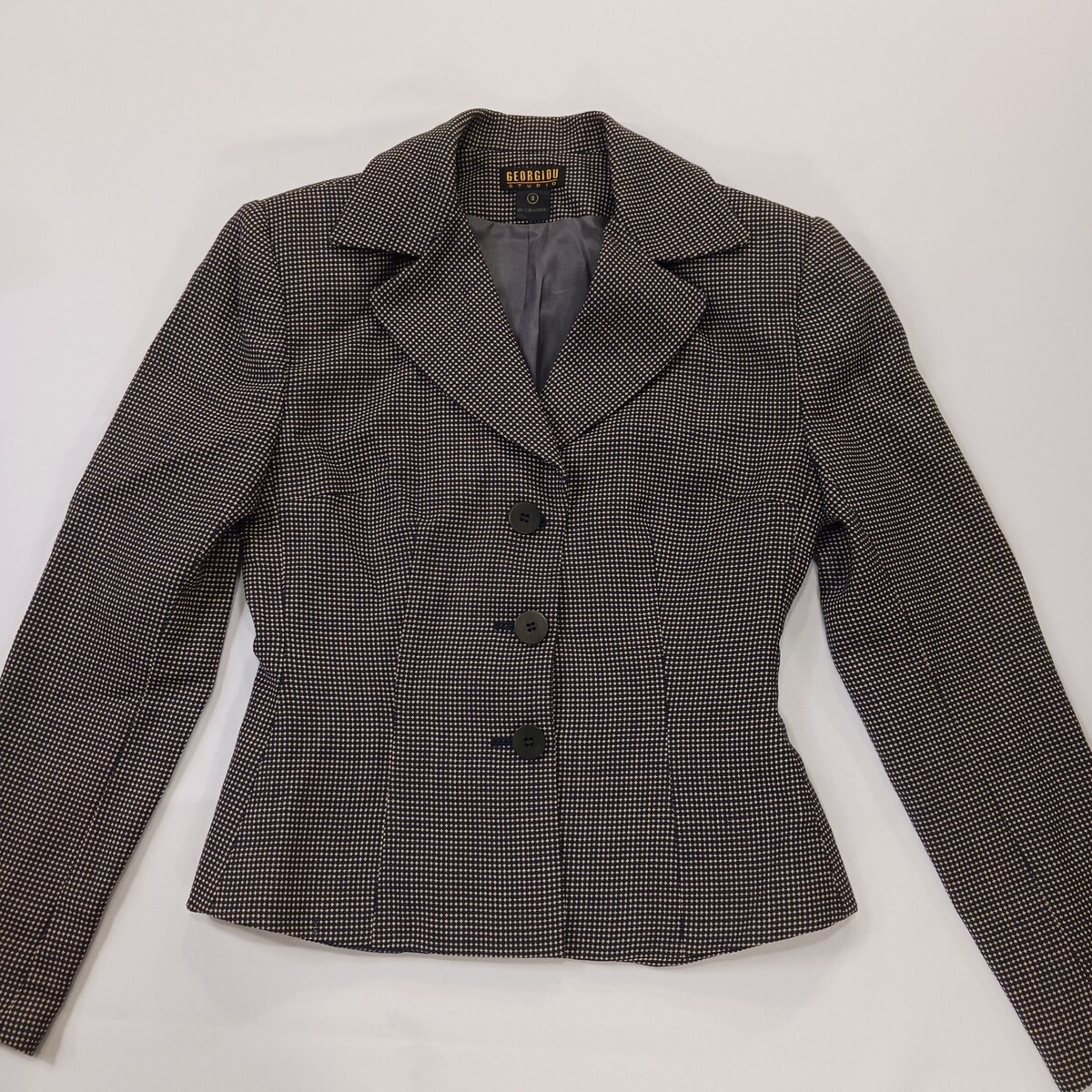 The Georgiou Studio Woman’s Gray 3-Button Collar Wool Blend Blazer Jacket in size 0 is a stylish and versatile outerwear piece perfect for casual or business occasions. Made from a comfortable wool blend with a polyester lining, this mid-length jacket features a plaid pattern, long sleeves, and a button closure. The collared design and pleated accents add a touch of sophistication to this basic jacket from the brand Georgiou, offering a regular fit for a flattering silhouette. Ideal for the modern woman looking for a classic yet trendy statement piece in a neutral gray color.