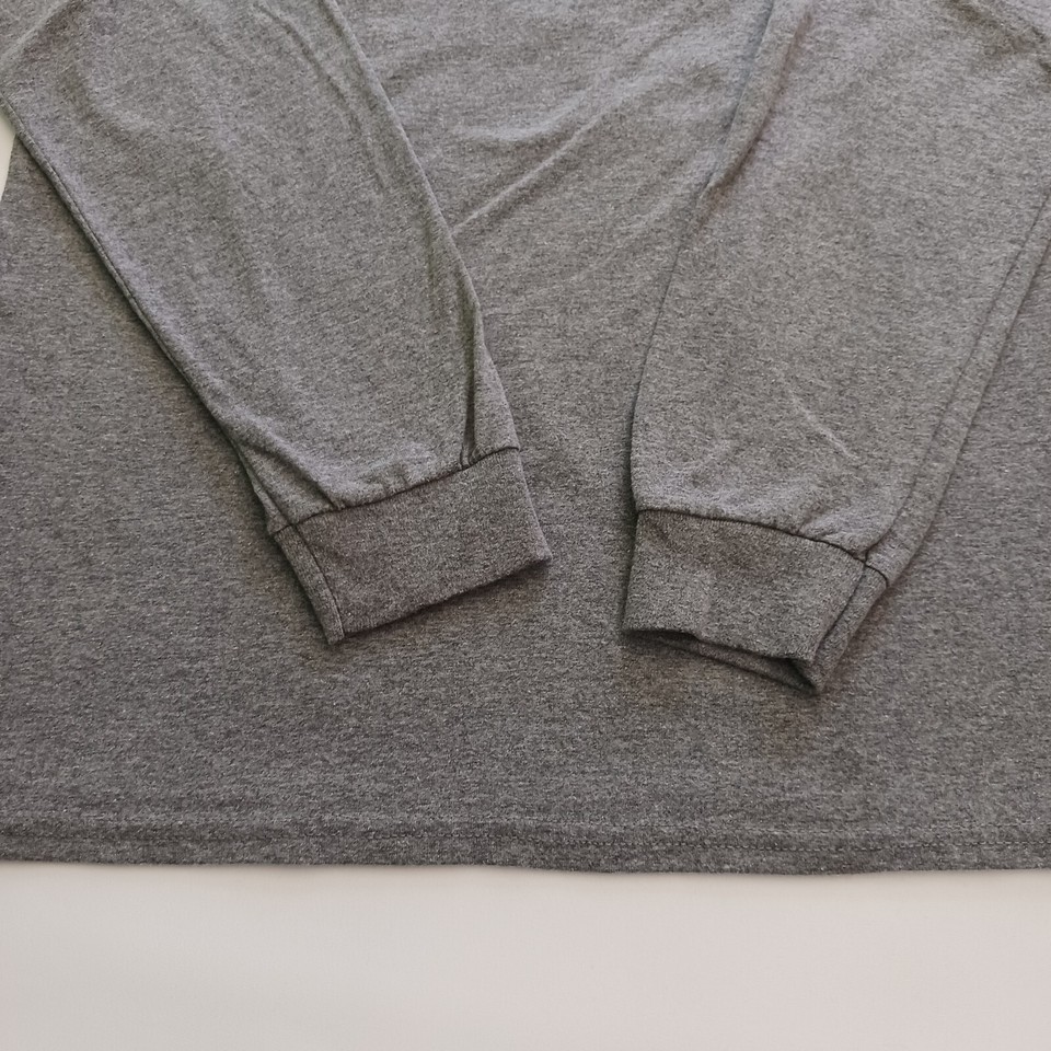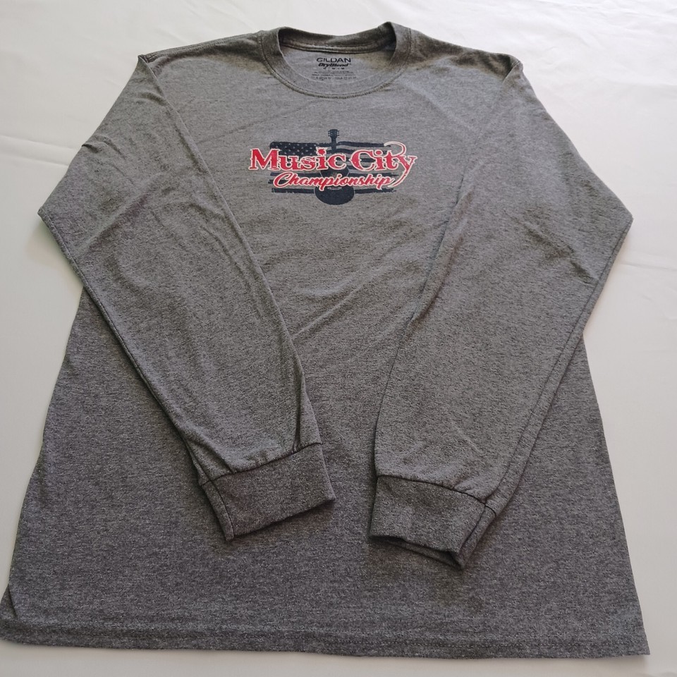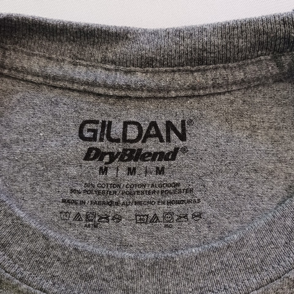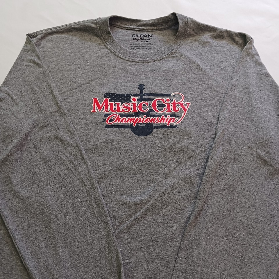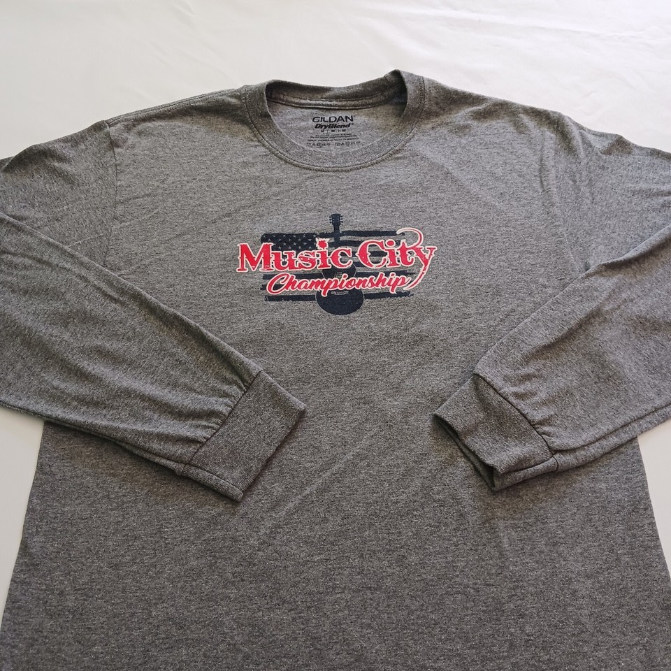 This is a pre-owned Gildan Dryblend T-shirt for men in gray, size M. It has a crew neck and long sleeves, and is made of a blend of polyester and cotton. The shirt is machine washable and has a regular fit. It features a graphic design with the words "Music City Championship 2019" and accents of a logo. The shirt is part of the Gildan Dryblend product line and was made in Honduras. It is suitable for wear in the summer, fall, and spring, and has a theme of music, city, and championship.