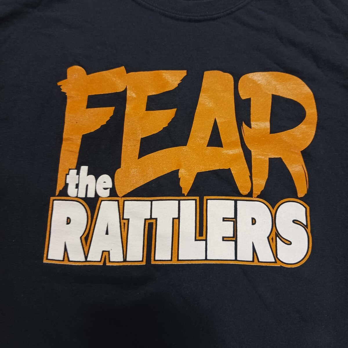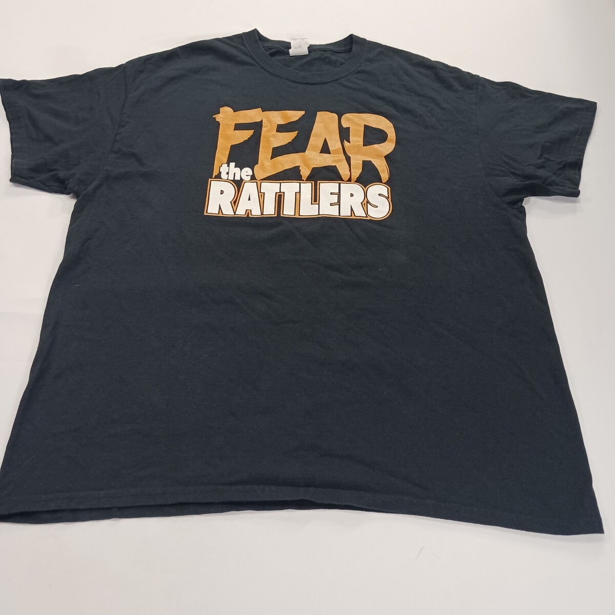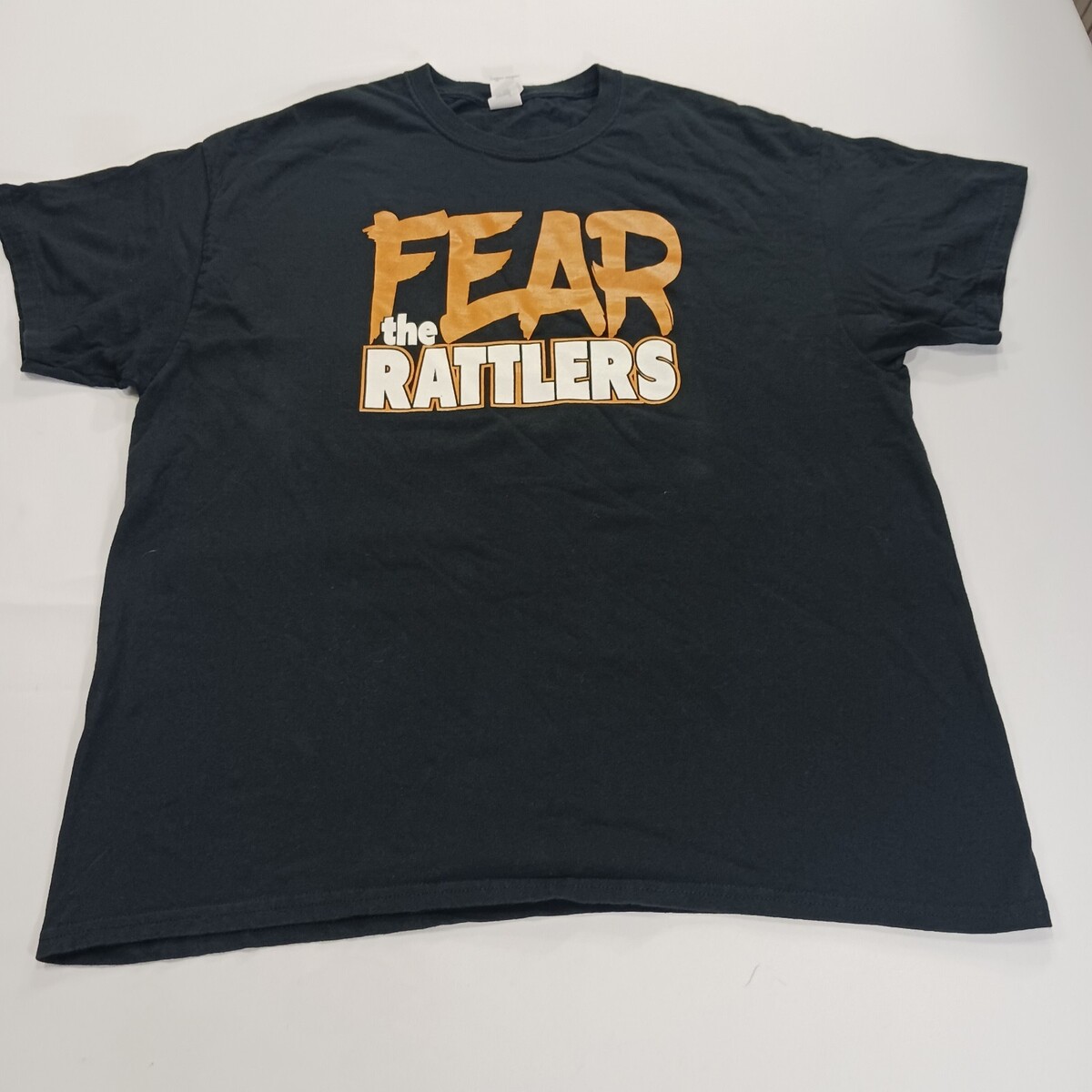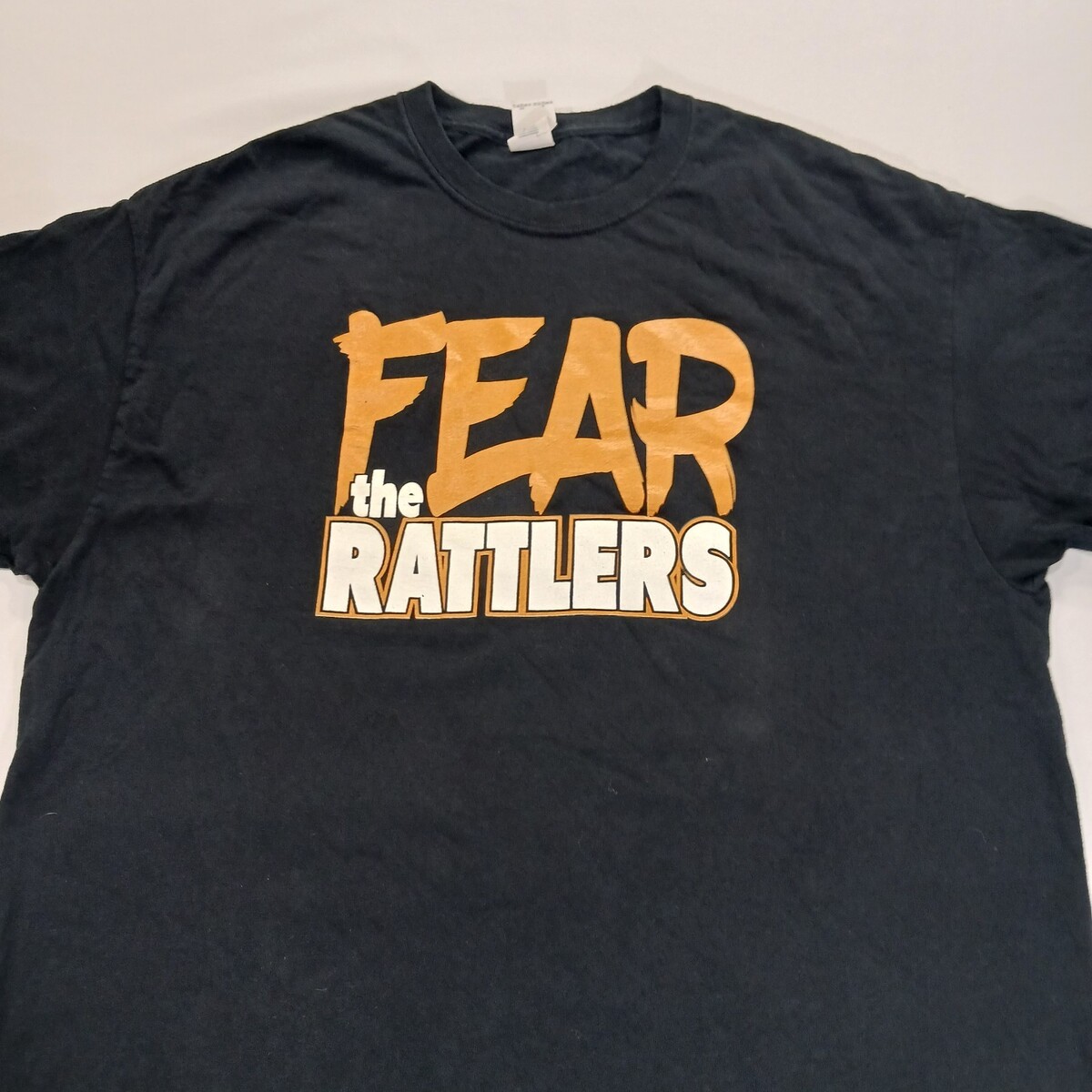 The Gildan Ultra Cotton Fear The Rattlers Men Black Graphic T-Shirt in size XL is a solid black shirt made from cotton with a crew neck and short sleeves. It is part of the Gildan Ultra Cotton product line and is designed for men. The shirt is printed with a graphic featuring "Fear The Rattlers" and is made in Honduras. This high-quality t-shirt is perfect for casual wear and showcases the iconic Gildan brand.