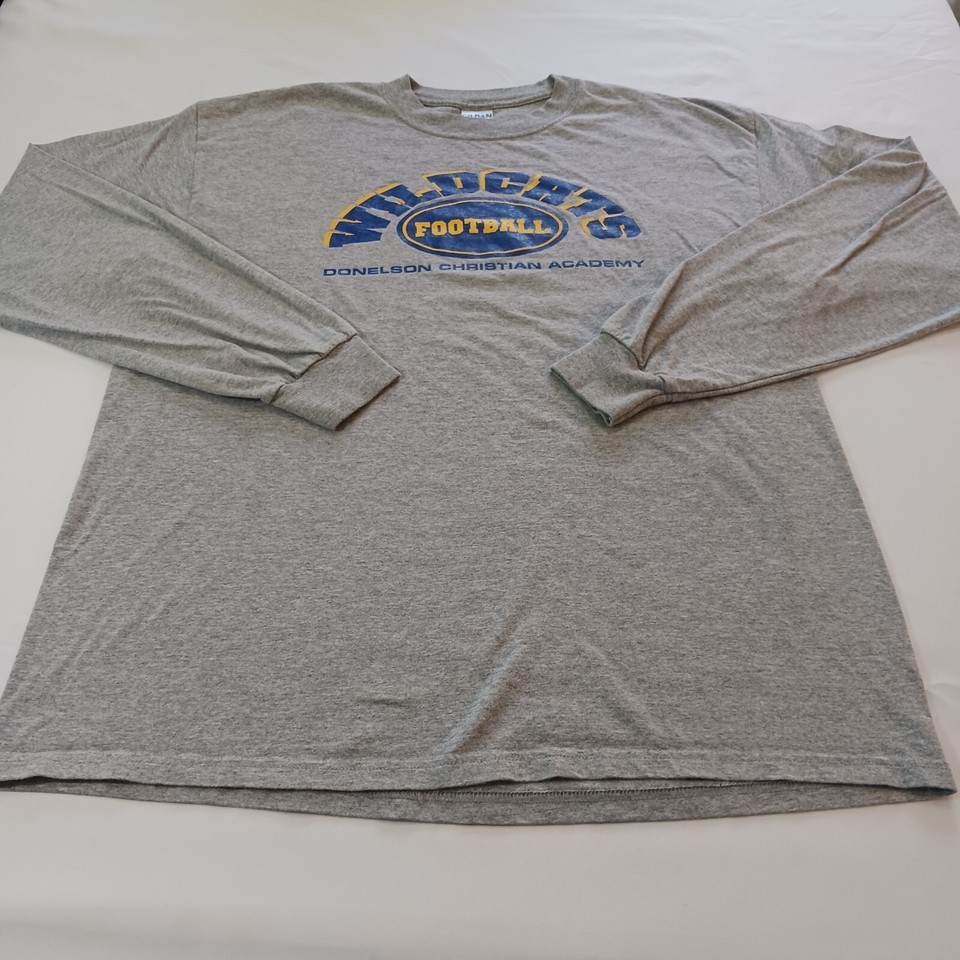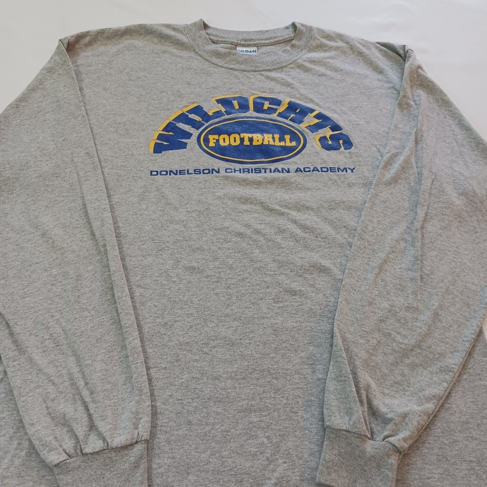 The Gildan Ultra Cotton Wildcats Football Donelson Academy Men's Gray T-Shirt XL is a pre-owned men's shirt made of cotton. It features a crew neck, long sleeves, and a solid pattern in gray color. The shirt is part of the Gildan Ultra Cotton product line and was manufactured in El Salvador. It is designed for regular size and has the Donelson, Wildcat, Football, and Christian Academy themes. The shirt also has the Ultra Cotton feature and is branded by Gildan.