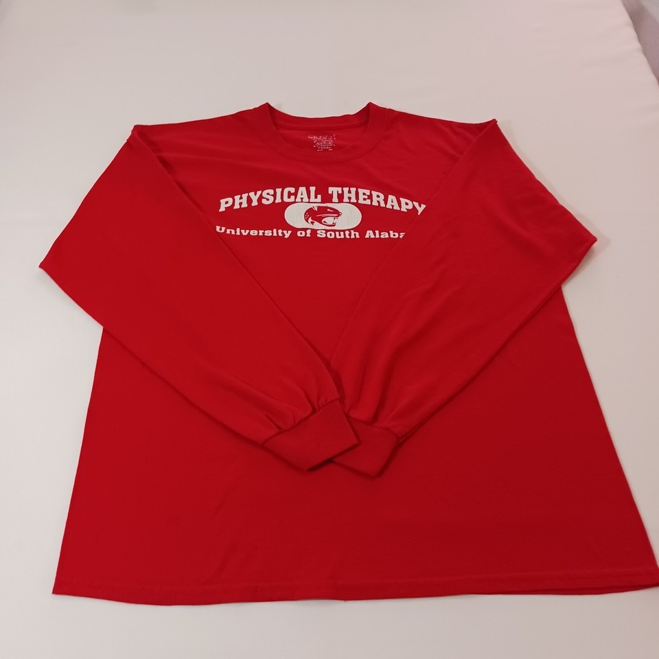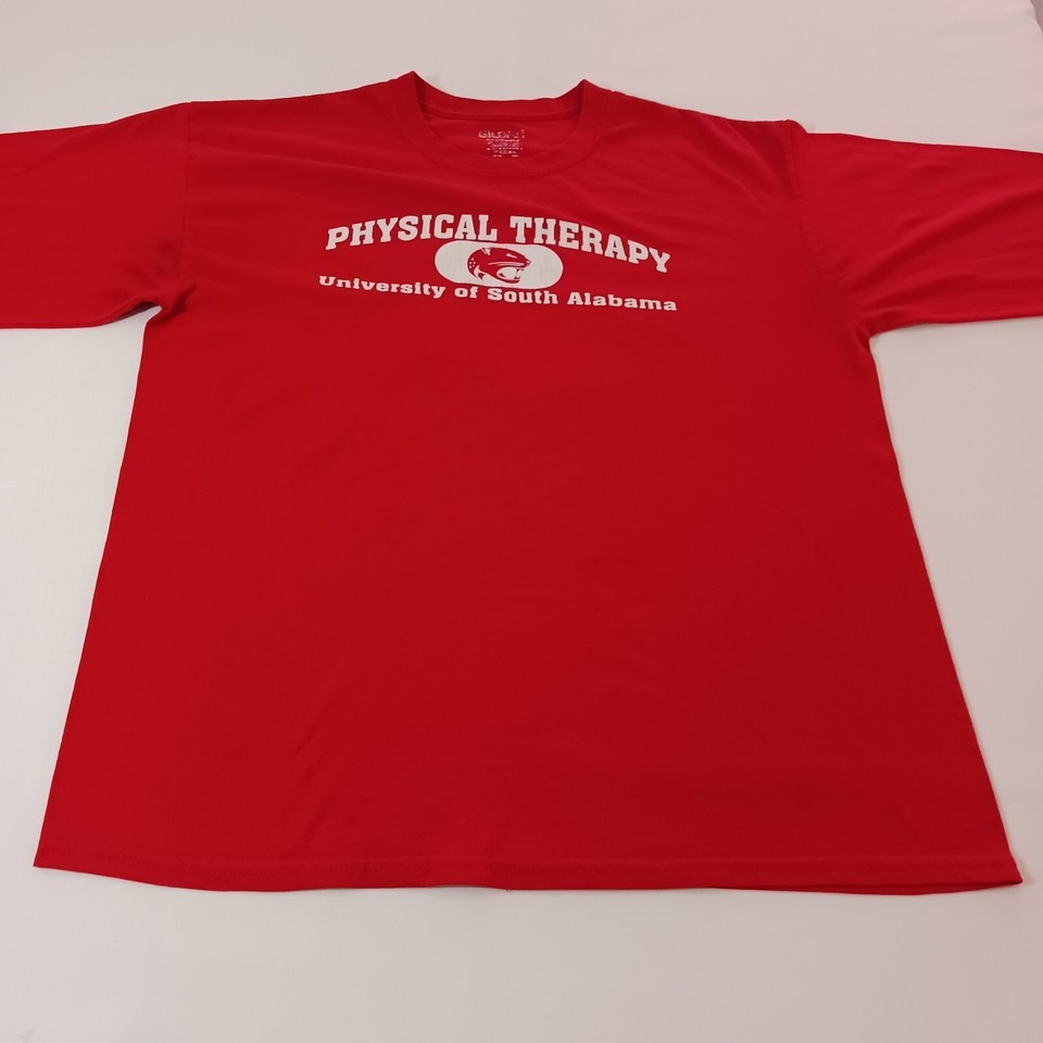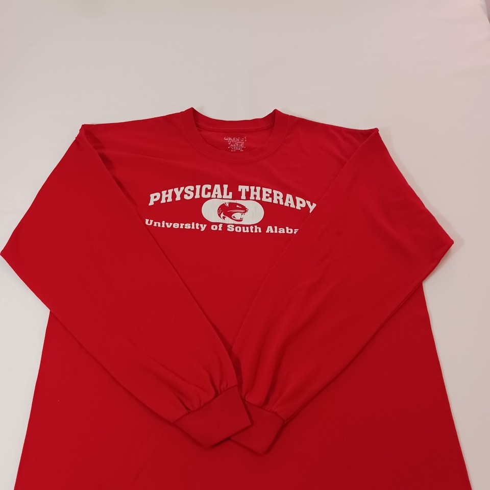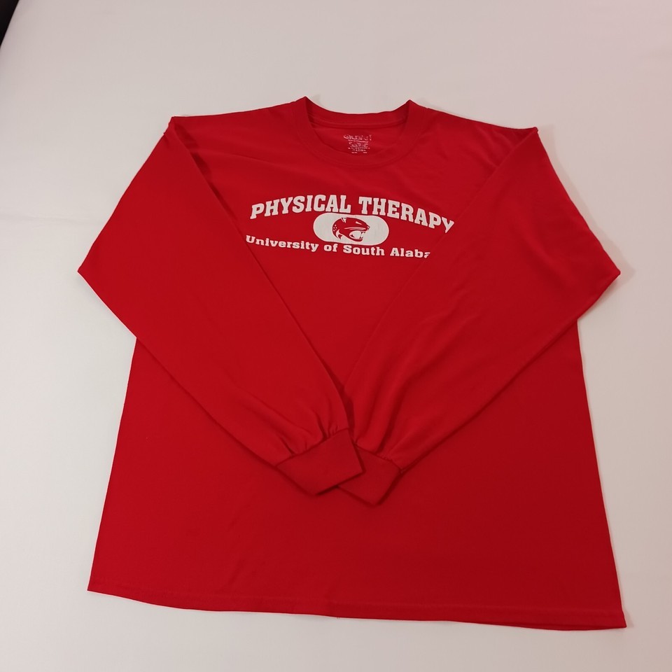 This Gildan University of South Alabama men's hoodie in red features long sleeves with a button accent. Made of polyester and cotton blend with a regular fit, it has a measured chest size of 44 inches. The pullover shirt is suitable for winter, summer, fall, and spring seasons, ideal for activities like cycling, cross training, and CrossFit. The hoodie bears the Gildan brand and is not personalized or vintage, making it a versatile and comfortable activewear option for men.