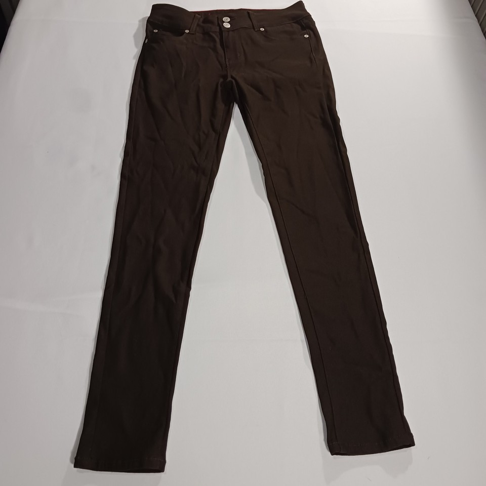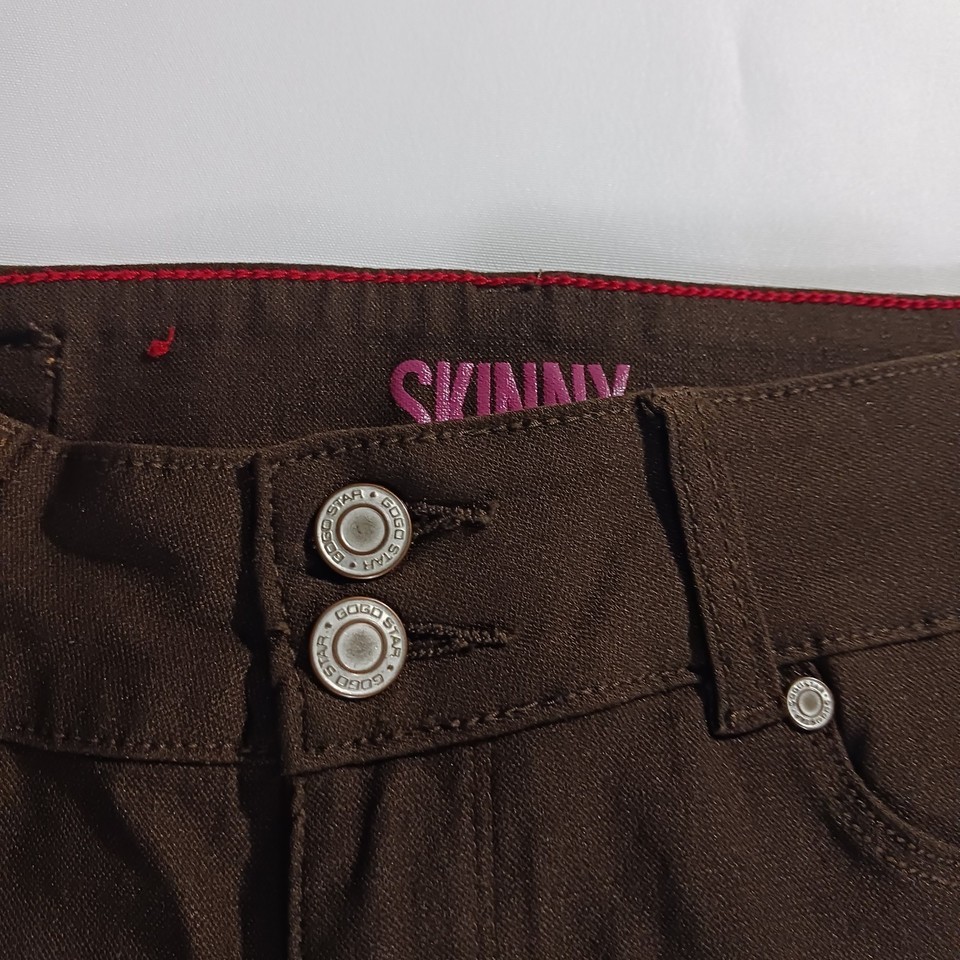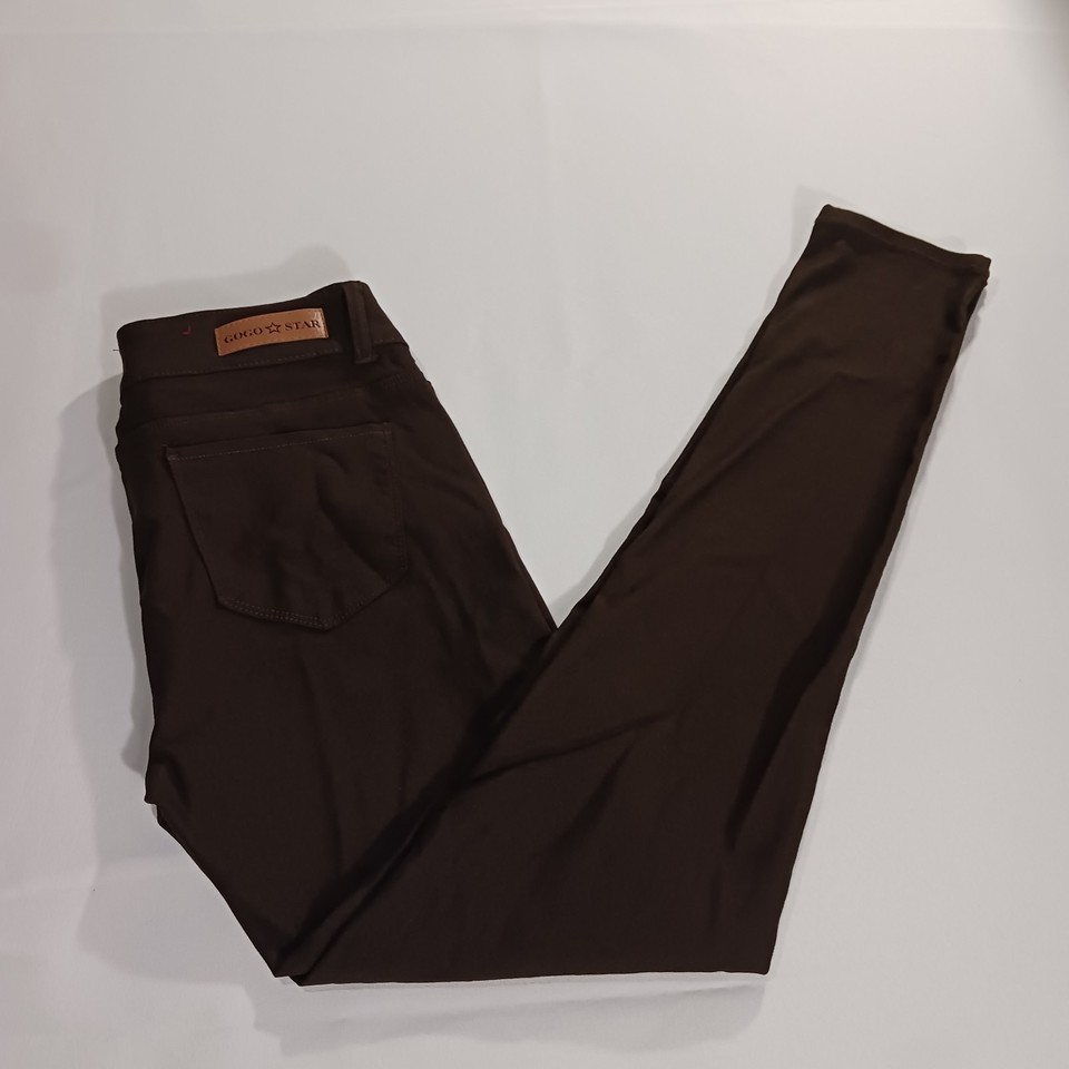 The GoGo Star Mid-Rise RN#121773 Women's Brown Stretch Skinny Jeans in size L (28×30) are a stylish and comfortable choice for any season. Made of a blend of polyester, spandex, and rayon, these jeans feature a mid-rise fit with a straight leg style. The brown color and solid pattern add a versatile touch to your wardrobe, while the 5-pocket design and stretch fabric ensure both functionality and a flattering silhouette. Perfect for everyday wear or a casual outing, these jeans are machine washable for easy care and maintenance.
