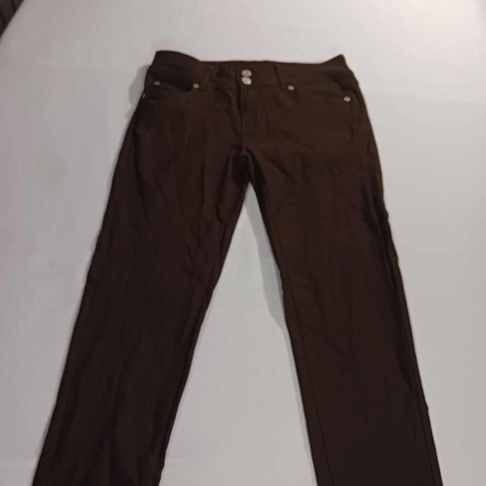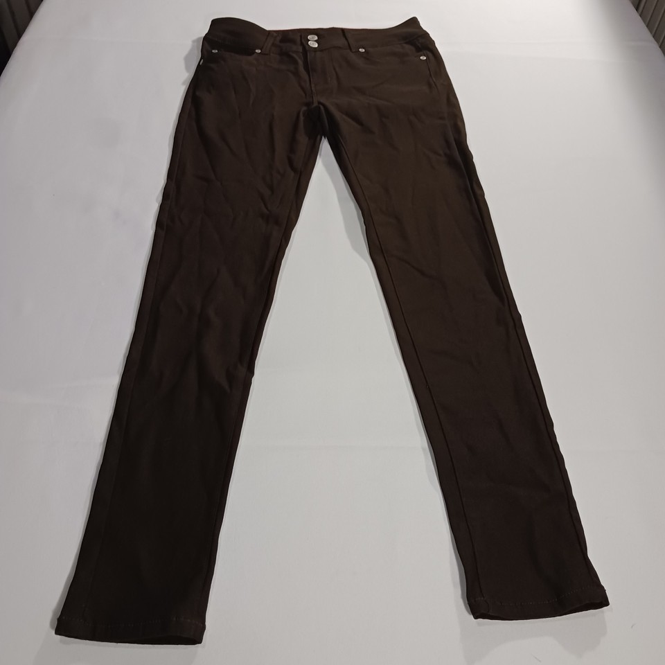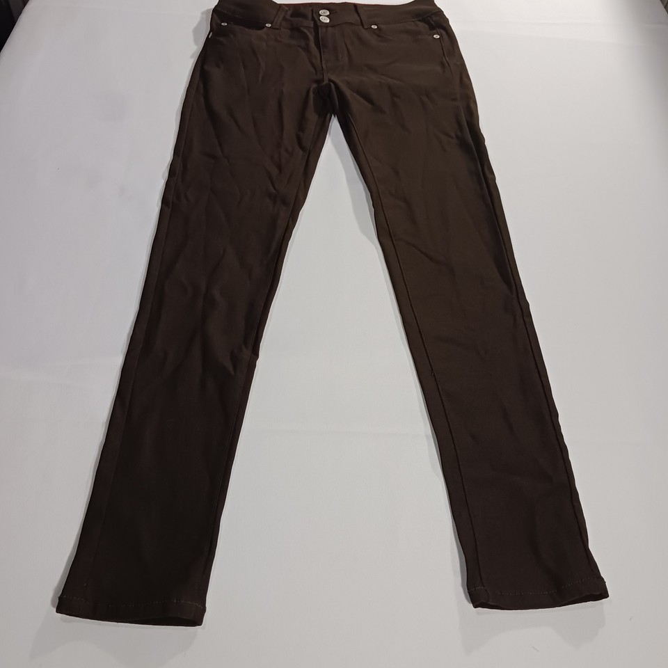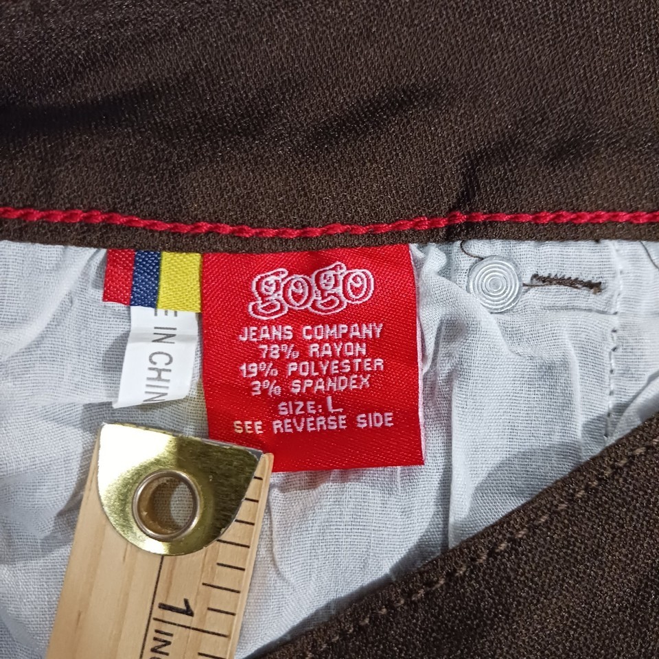 The GoGo Star Mid-Rise RN#121773 Women's Brown Stretch Skinny Jeans in size L (28×30) are a stylish and comfortable choice for any season. Made of a blend of polyester, spandex, and rayon, these jeans feature a mid-rise fit with a straight leg style. The brown color and solid pattern add a versatile touch to your wardrobe, while the 5-pocket design and stretch fabric ensure both functionality and a flattering silhouette. Perfect for everyday wear or a casual outing, these jeans are machine washable for easy care and maintenance.