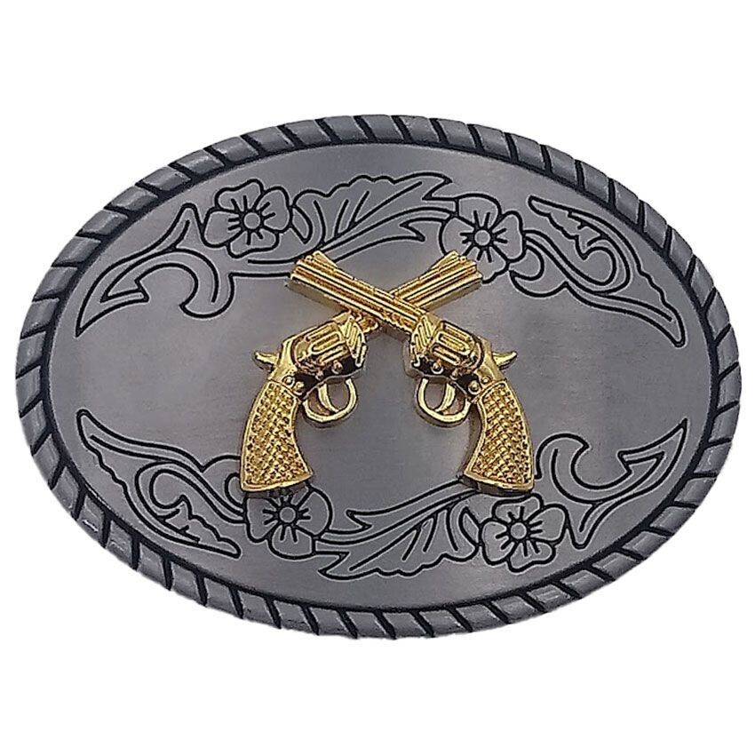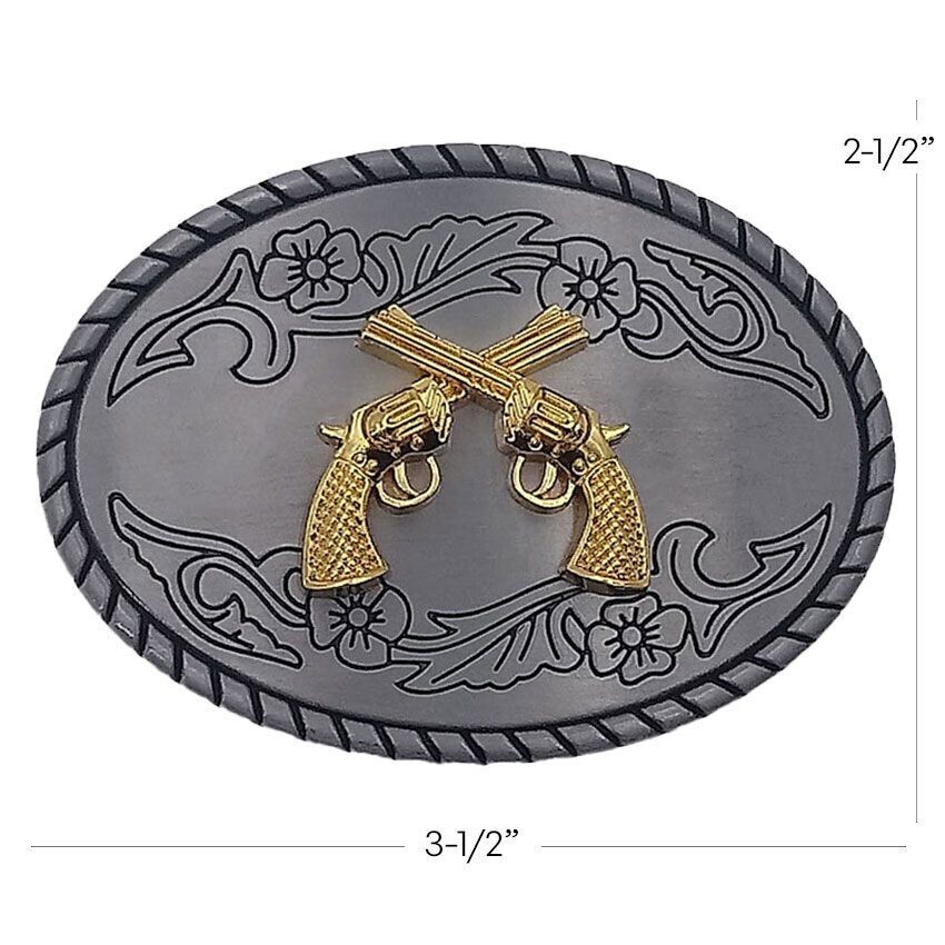 Add some style to your outfit with this vintage silver metal belt buckle featuring a unique and intricate crossed guns design. The buckle is accented with a buckle closure and is perfect for men looking to add a touch of sophistication to their wardrobe. Made from high-quality metal, it is durable and long-lasting, making it an ideal accessory for everyday wear. The silver finish adds a subtle touch of elegance to your outfit. Fits 1-1/2 inches belt.