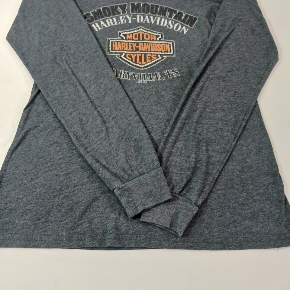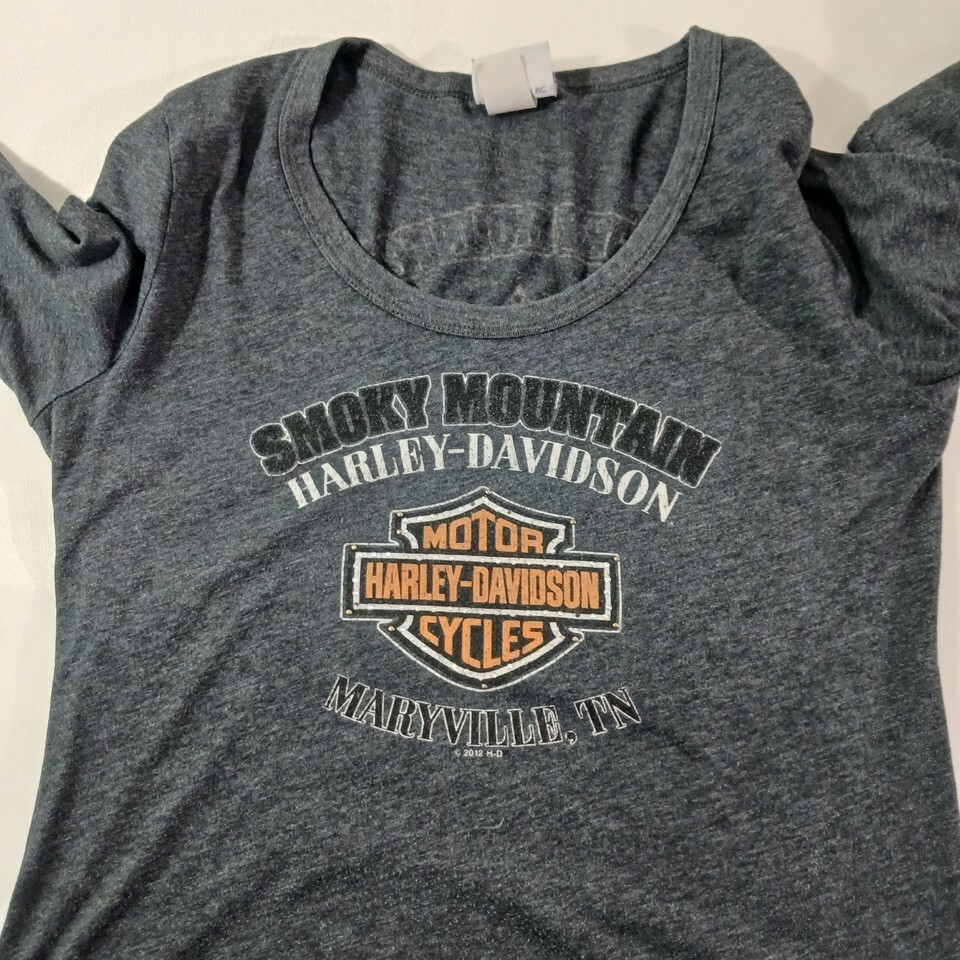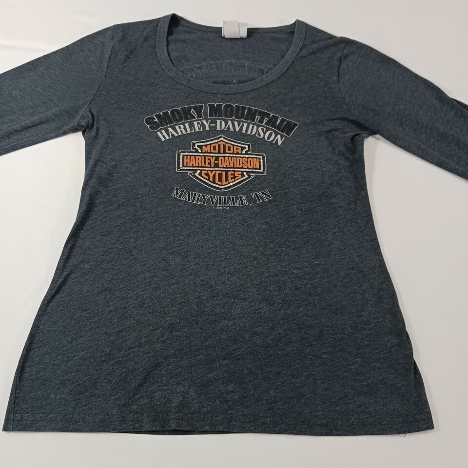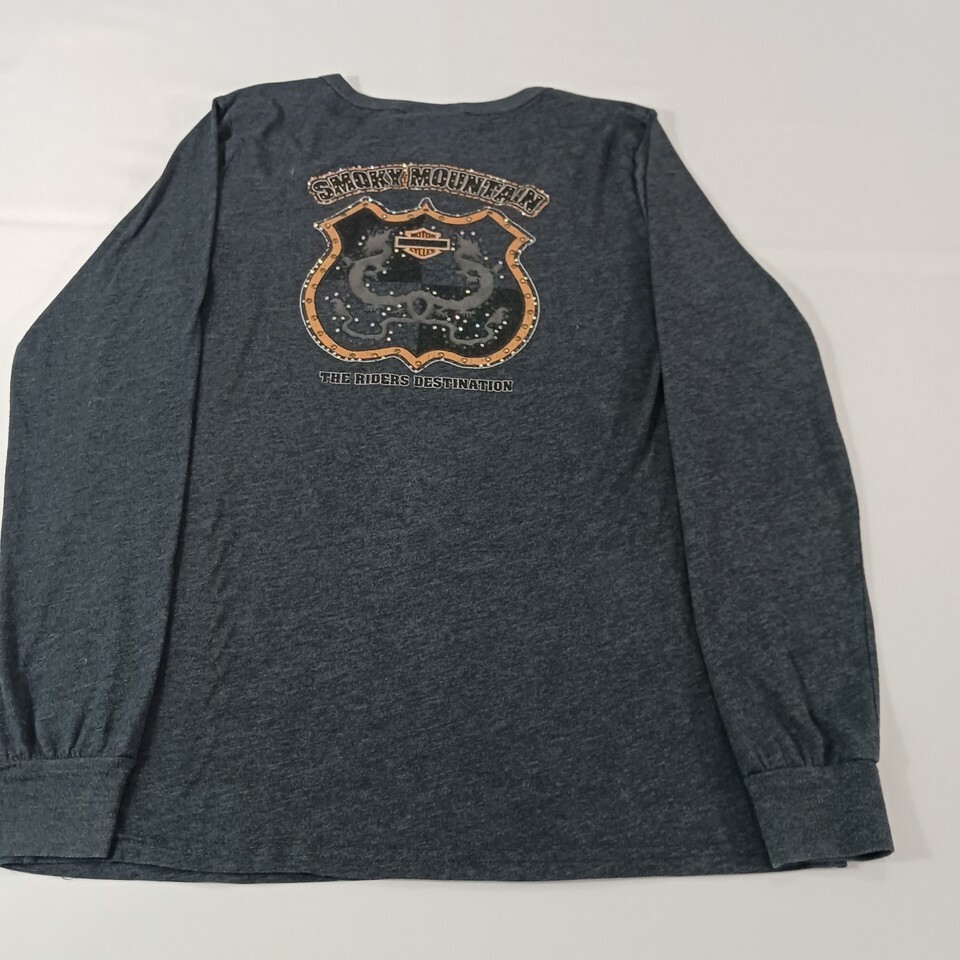 This is a gray women's Harley-Davidson T-shirt in size L. It has a scoop neckline and long sleeves. The shirt is made of a knit blend of cotton, polyester, and cotton blend fabrics, with stretch and double-sided features. It is machine washable and has a rhinestone accent. The shirt is suitable for travel and casual occasions, and is part of the biker, motorcycle, USA, transportation, outdoor, and classic themes. It is a basic style with a solid pattern and a pullover closure. The shirt is from the Smoky Mountain Tennessee area and is made in Mexico.