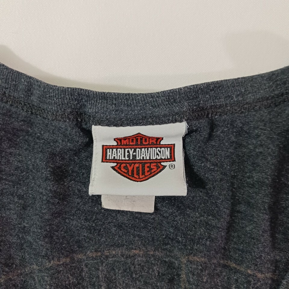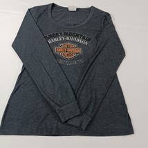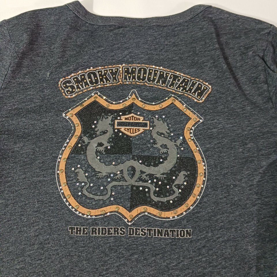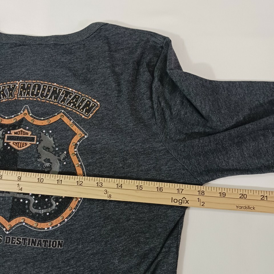 This is a gray women's Harley-Davidson T-shirt in size L. It has a scoop neckline and long sleeves. The shirt is made of a knit blend of cotton, polyester, and cotton blend fabrics, with stretch and double-sided features. It is machine washable and has a rhinestone accent. The shirt is suitable for travel and casual occasions, and is part of the biker, motorcycle, USA, transportation, outdoor, and classic themes. It is a basic style with a solid pattern and a pullover closure. The shirt is from the Smoky Mountain Tennessee area and is made in Mexico.