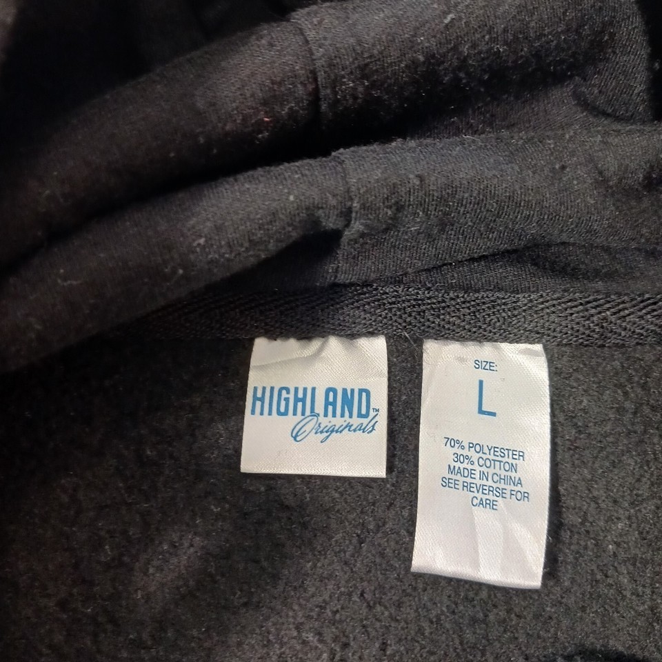 Elevate your wardrobe with this stylish and comfortable Highland Originals Men's Black Cotton Blend Pullover Hoodie Sweatshirt in size Large. The hoodie features a solid pattern, long sleeves, and a drawstring closure. It is made of a blend of polyester, cotton, and cotton blend materials, making it durable and perfect for any occasion. The hoodie also comes with a hood, adding an extra layer of warmth and protection.