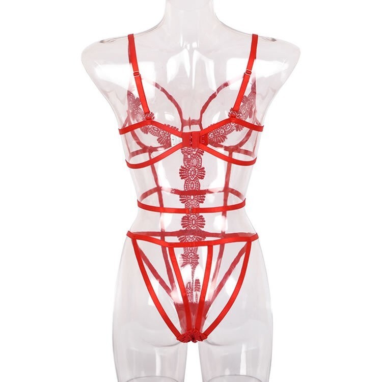 Put your love on display in this bare-all seductive teddy featuring open underwire cups with an embroidered overlay, adjustable spaghetti straps, a strappy cut-out bodice with an embroidered center panel, an open strappy back, a hook and eye closure, and a caged open back.