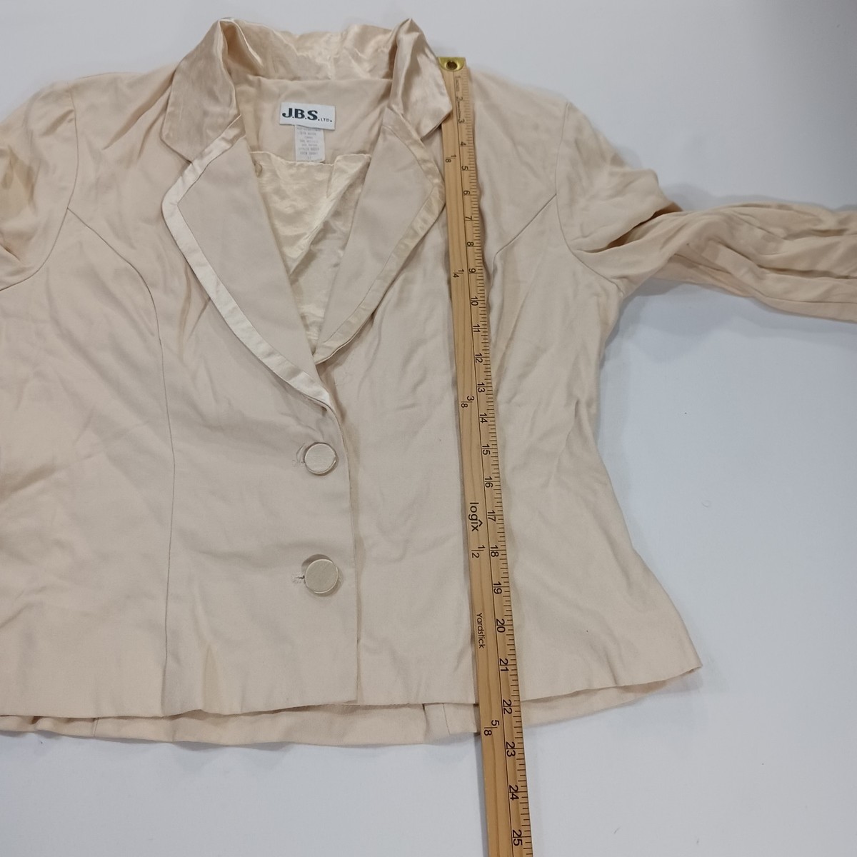 This JBS LTD women's blazer jacket in tan/beige is a stylish and versatile addition to any wardrobe. Made from a comfortable rayon blend with a acetate lining, this 2-button blazer features a solid pattern and long sleeves, perfect for a party or cocktail occasion. The vintage design adds a touch of elegance, while the designer brand ensures quality and style. The 23-inch jacket length and size 12 make it a flattering and on-trend choice for women looking for a chic outerwear option.