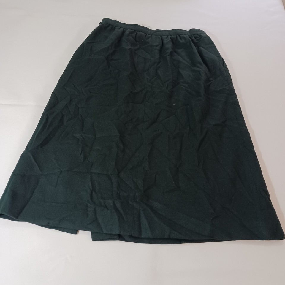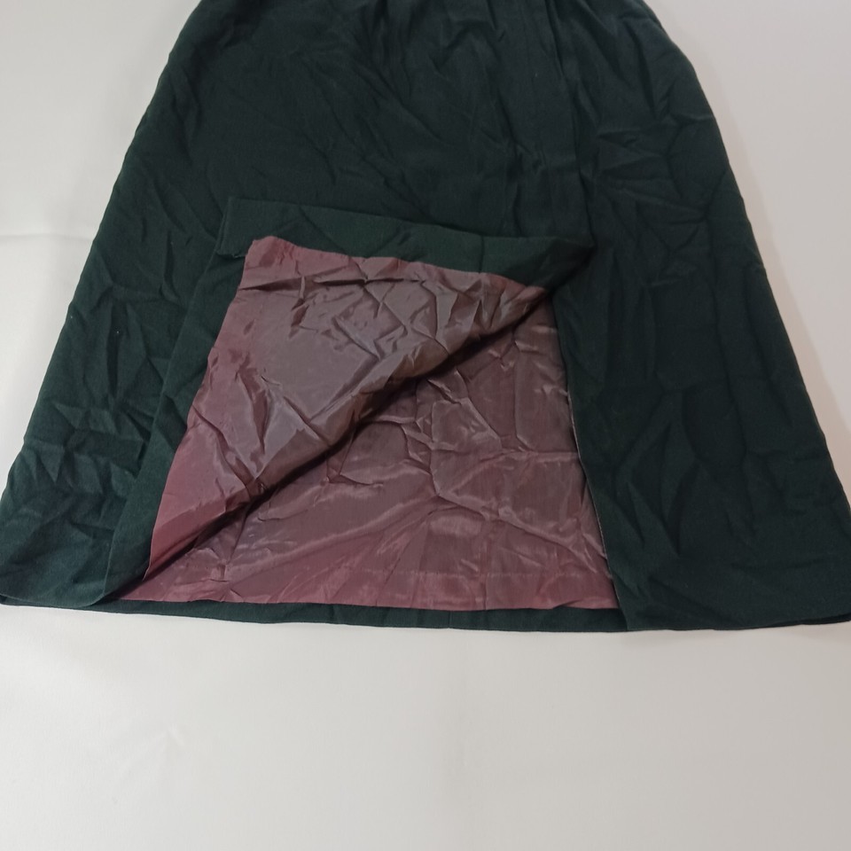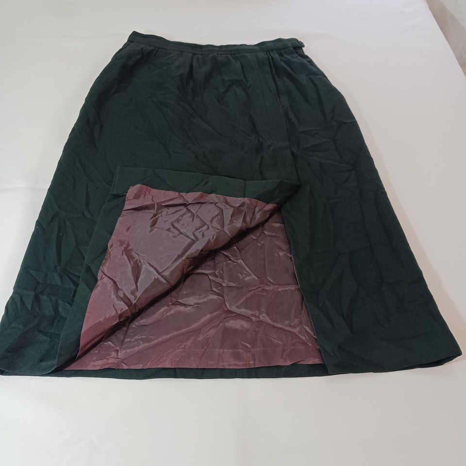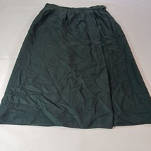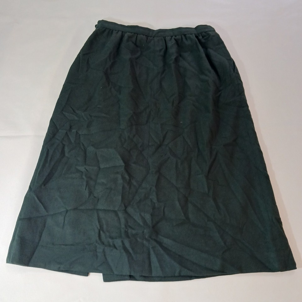 This JH Collectibles skirt is a vintage green tweed A-line midi skirt made from a blend of wool and polyester. It features a solid pattern with button closure and is suitable for various occasions like travel, parties, casual wear, formal events, and business settings. The skirt is in size 14 (SM) and needs to be dry cleaned only. It has a lining, back slit, and pockets, adding functionality to its classic design. Made in the United States, this skirt exudes American city style with a touch of 90s charm.