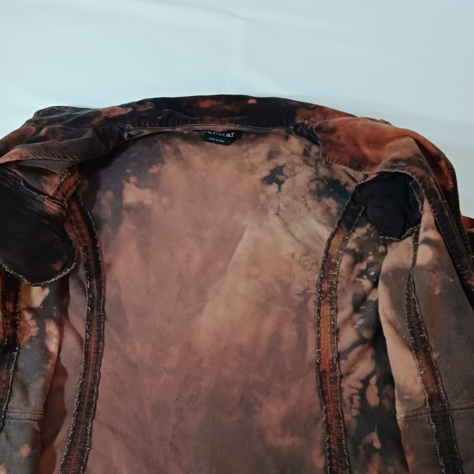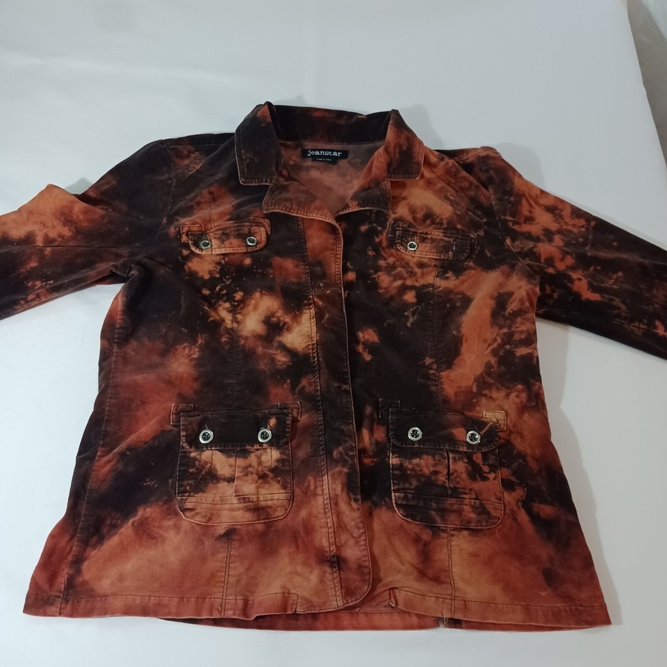 This Jeanstar Women's Jacket in size XL features a unique black and orange dyed color scheme made from a cotton blend fabric with a corduroy texture. The jacket has a classic blazer style with long sleeves, a button closure, and a length of 26.5 inches. It is designed for casual, party, work, or date occasions and is suitable for all seasons due to its spandex lining material. With a Western, Hippie, Bohemian, and Cowgirl theme, this jacket also includes practical pockets and a collar for added style.