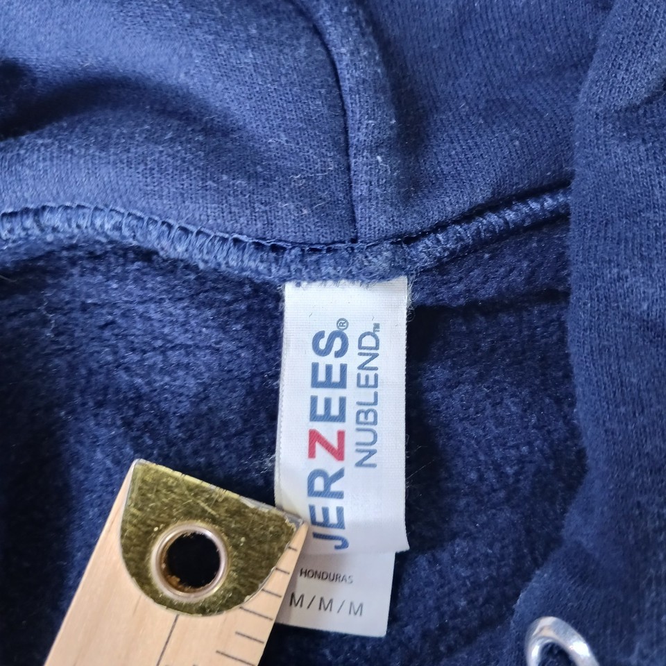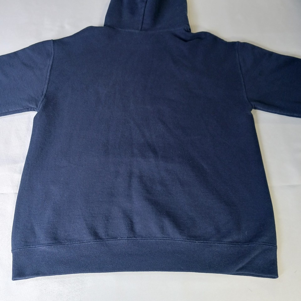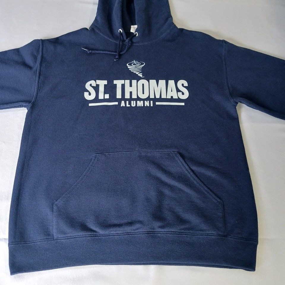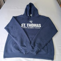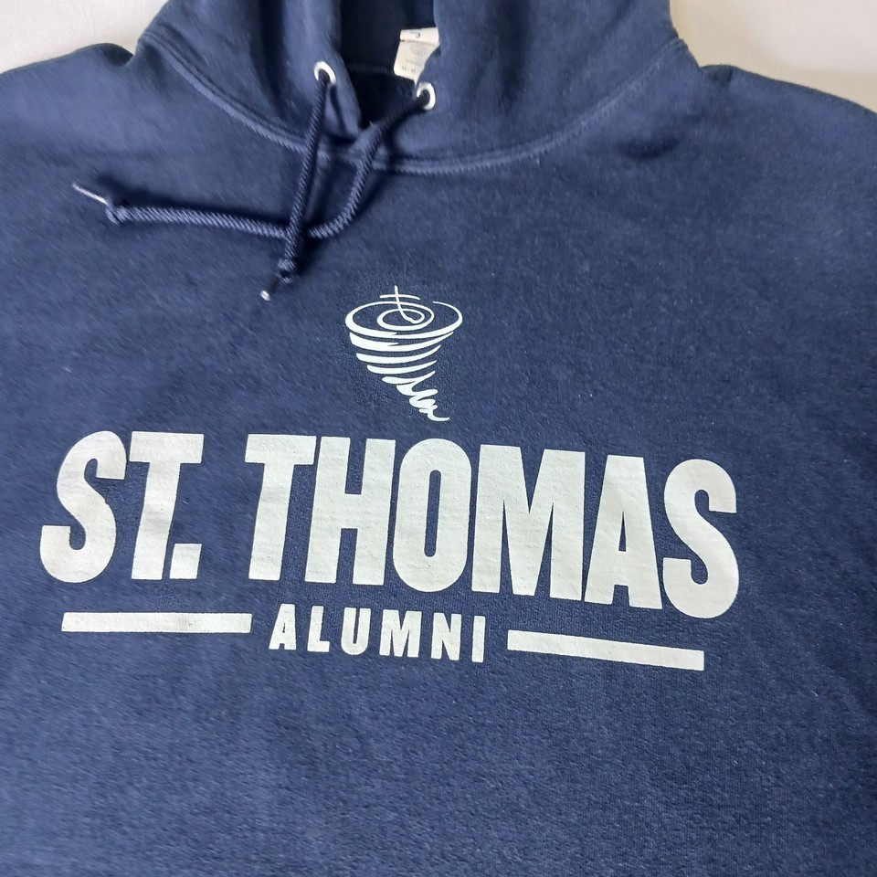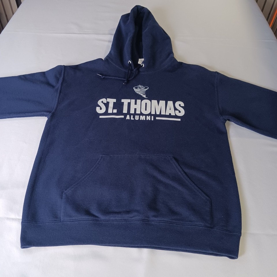 The Jerzees Nublend St Thomas Alumni Men's Hoodie Pullover Sweatshirt in size medium is a comfortable and stylish piece of activewear. Made from breathable cotton material, this hoodie features a solid blue color with a graphic print of the Tommy character. The pullover style, hooded design, and crew neck neckline make it perfect for various activities such as gym training, walking, or running. With its personalized logo accents and machine washable care instructions, this hoodie is a versatile and practical addition to any man's wardrobe.