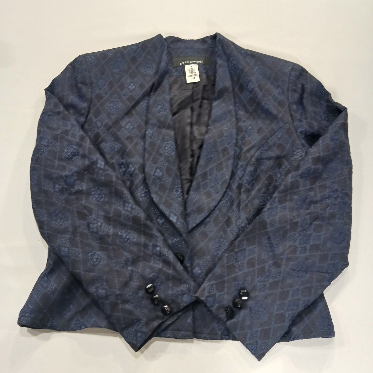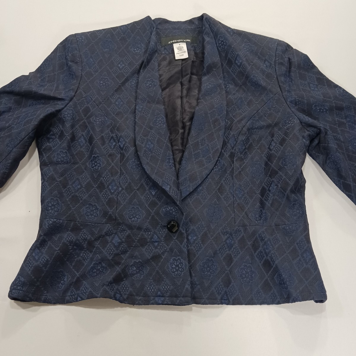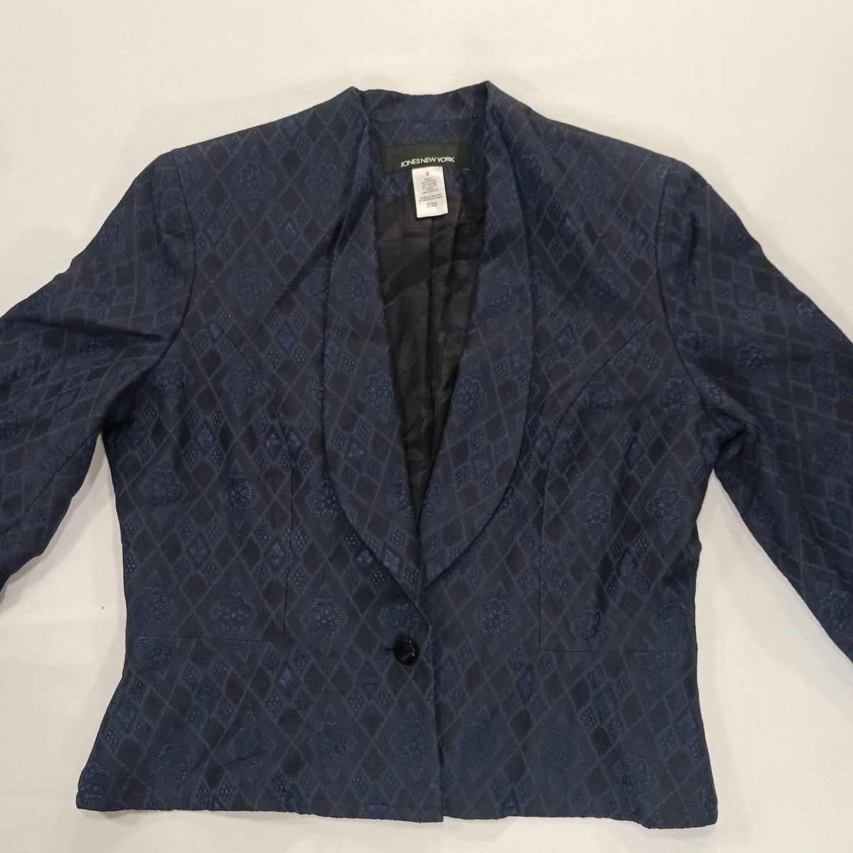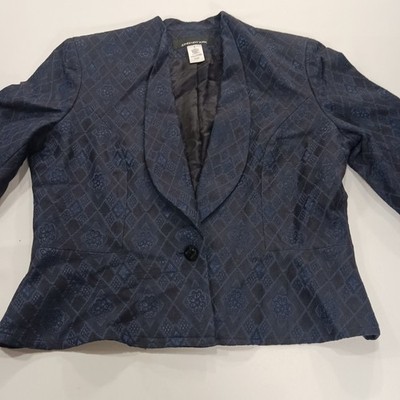 The Jones New York RN#54050 Women's Blue/Black One-Button Blazer Jacket in Size 8 is a classic and stylish piece perfect for business occasions. Made from a blend of viscose, acetate, and cotton, this jacket features long sleeves, a regular fit, and a lined interior for added comfort. The one-button design adds a touch of sophistication, making it a versatile option for the winter, fall, and spring seasons. Designed by the reputable brand Jones New York, this blazer jacket is sure to add a chic and polished element to any woman's wardrobe.