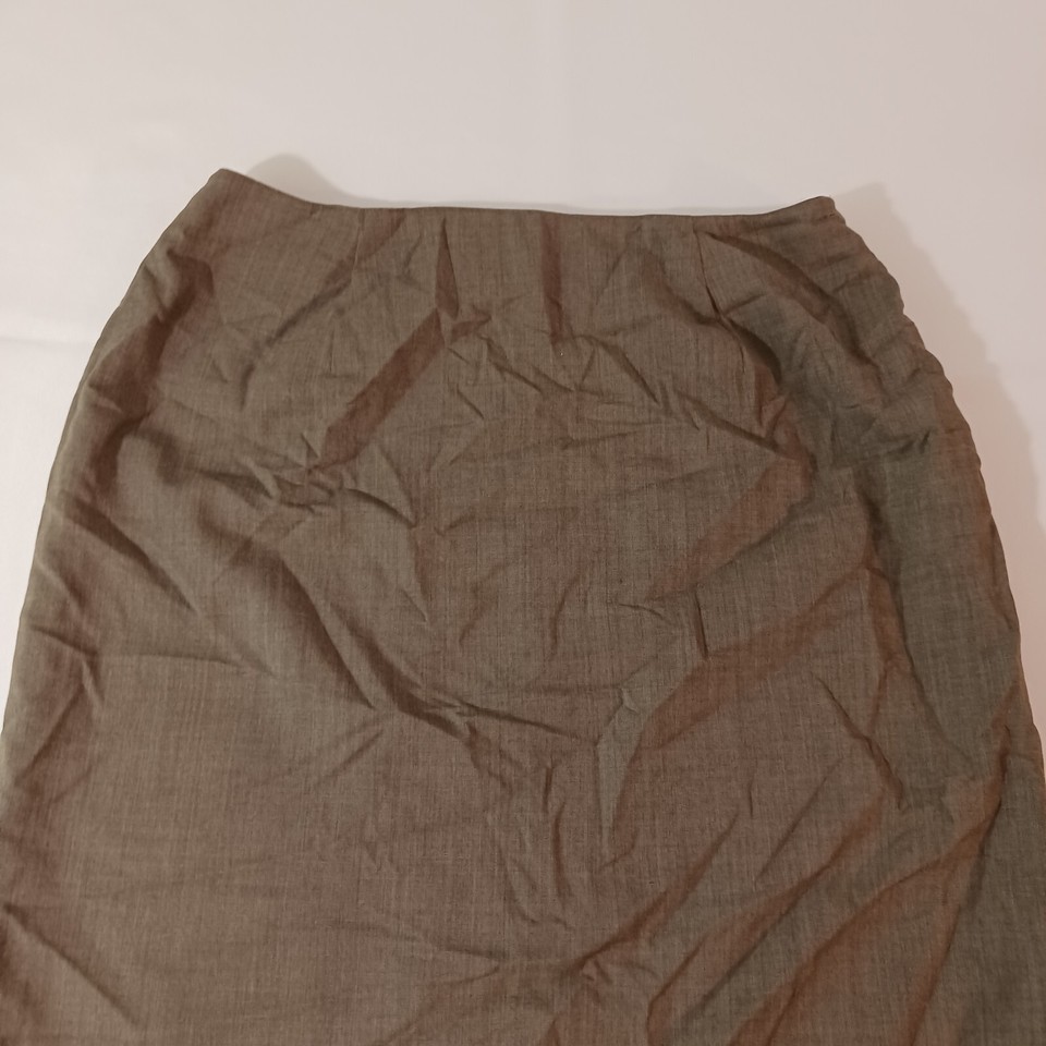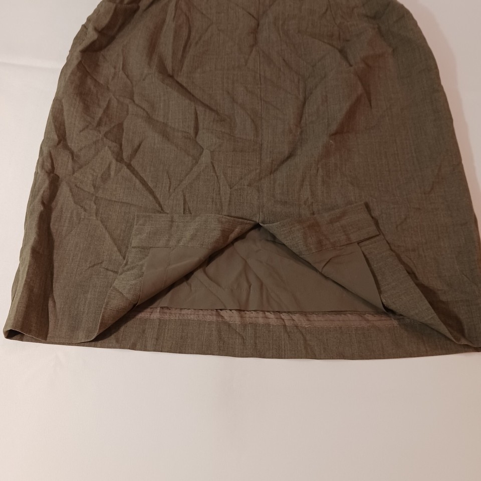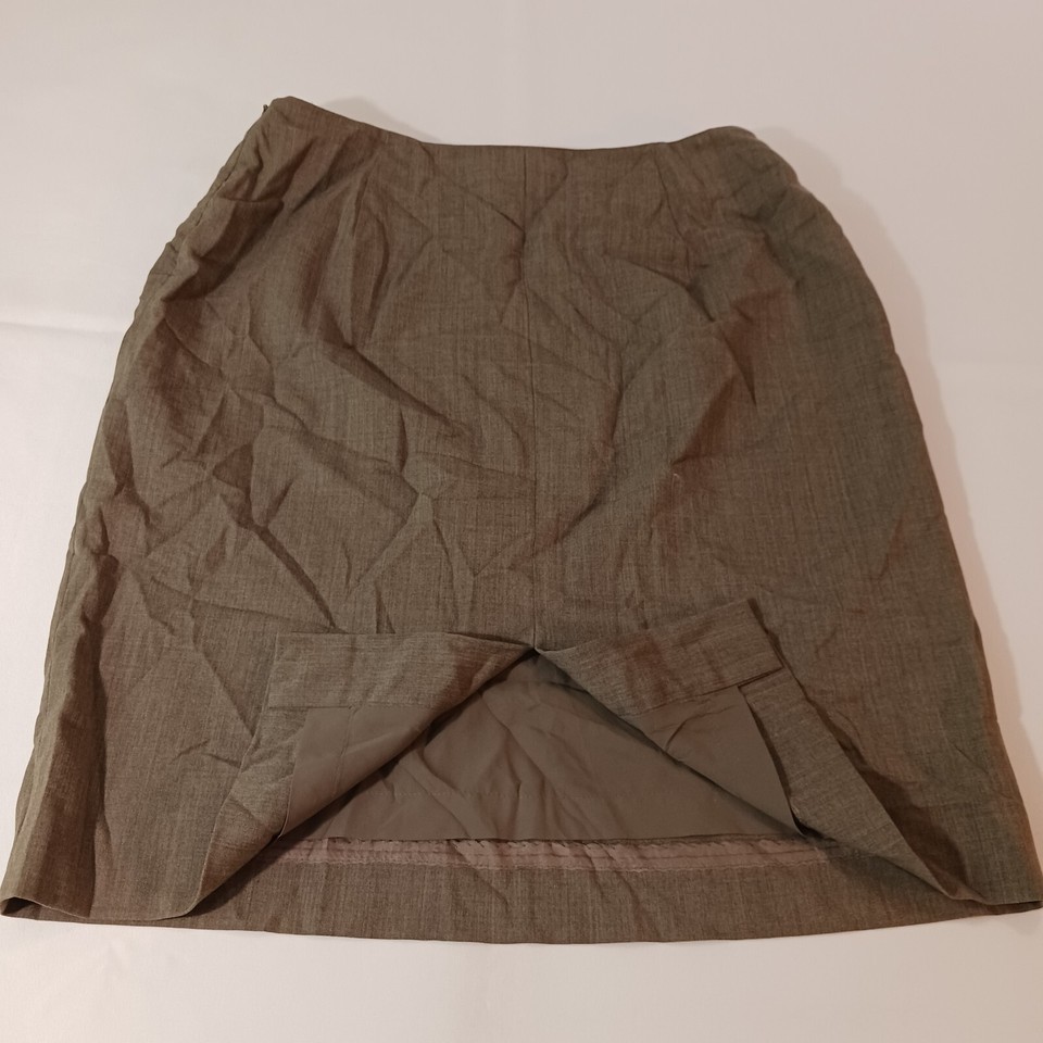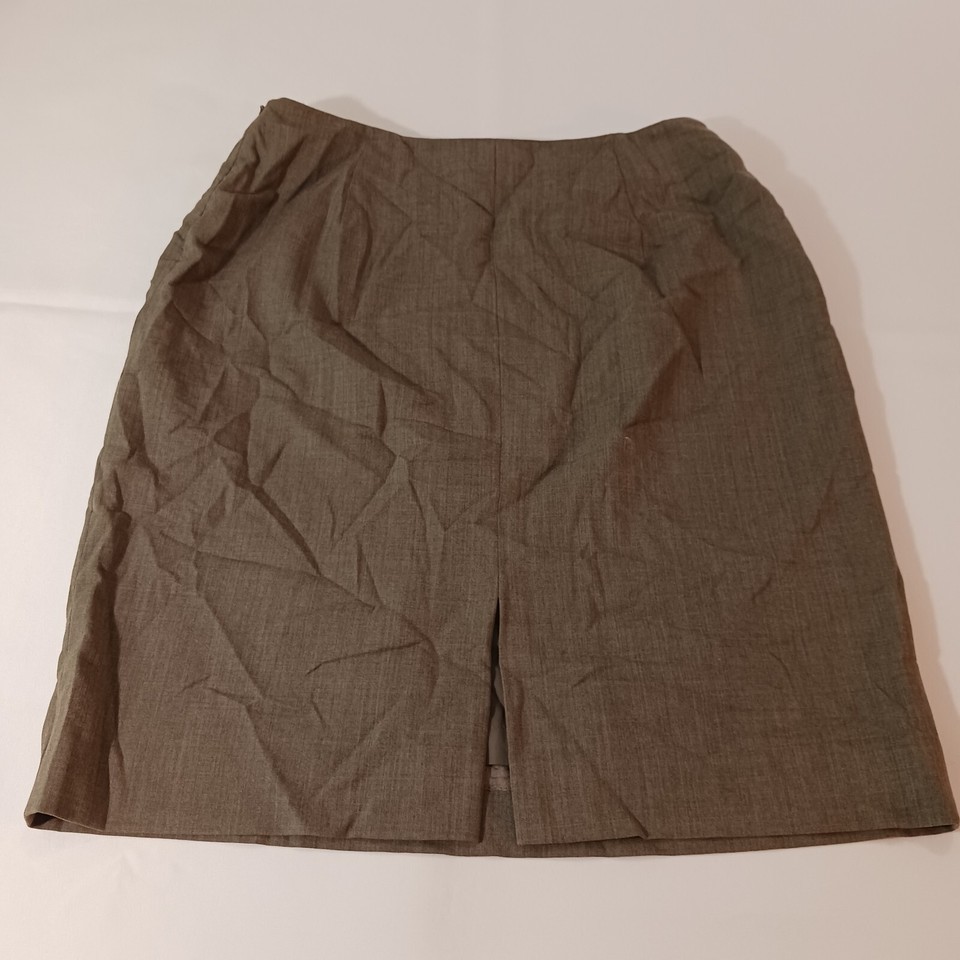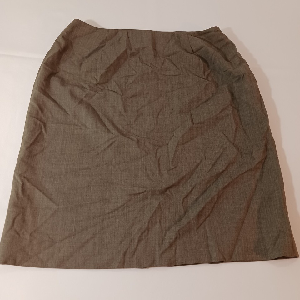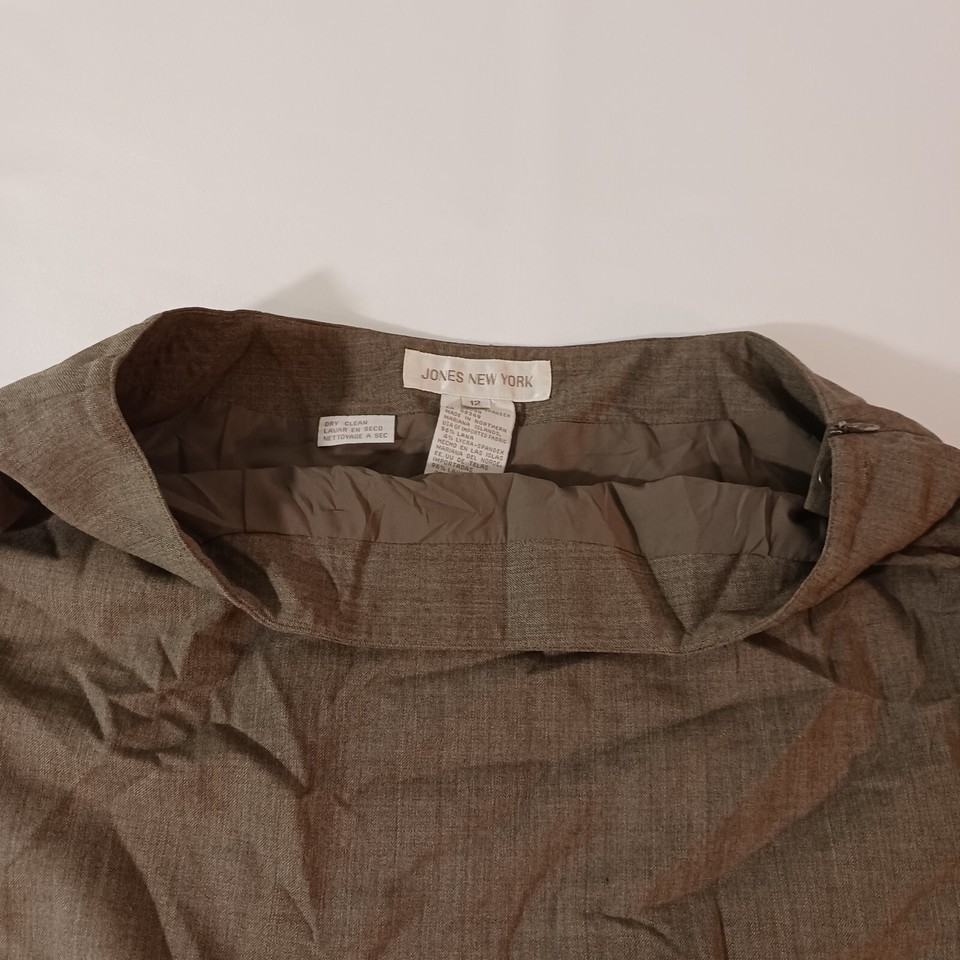 The Jones New York Women's Brown Wool Blend Lined Pencil Skirt in size 12 is a stylish and sophisticated choice for any wardrobe. This straight and pencil style skirt features a solid brown color, a 22-inch length, and a pull-on design for easy wear. Made of a blend of wool, Lycra, and Spandex, this skirt is both comfortable and flattering, with a zip closure for added convenience. Perfect for work or special occasions, this skirt combines classic elegance with modern comfort.