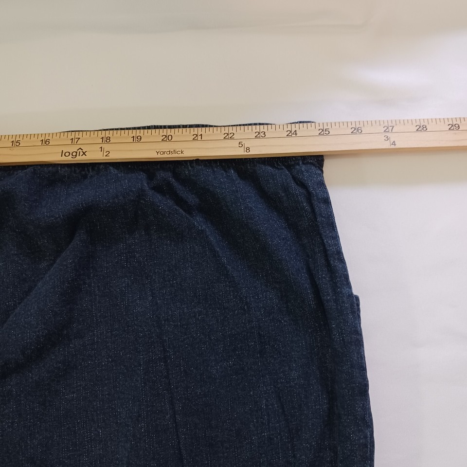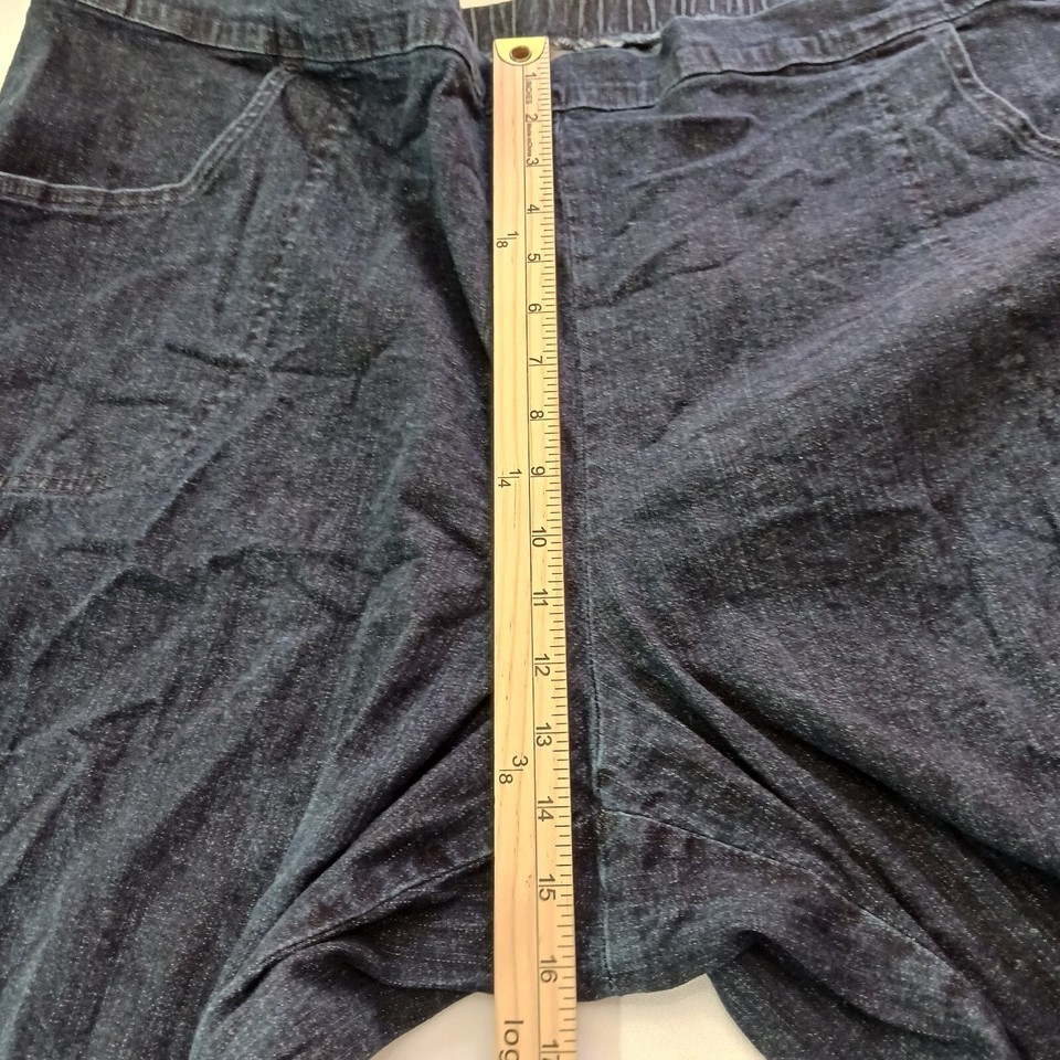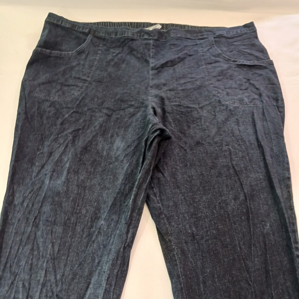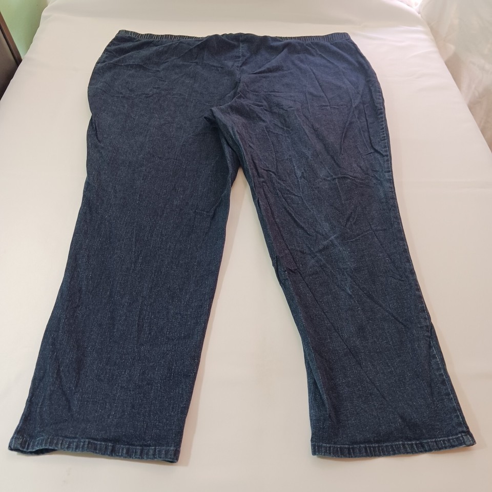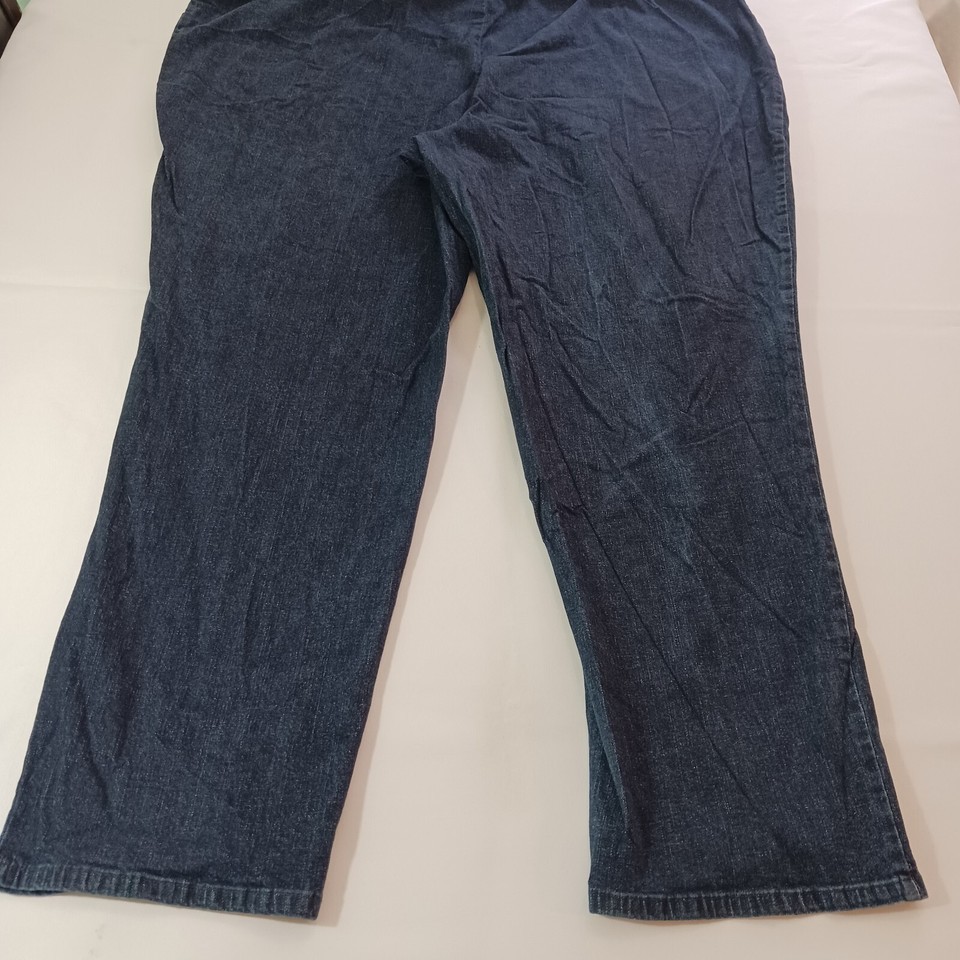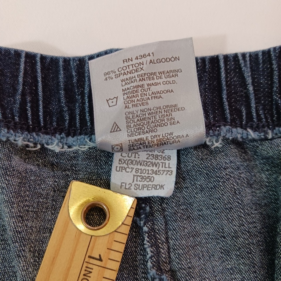 This is a pair of Just My Size women's denim jeans in a size 5X tall with a 50-inch waist and 30.5-inch inseam. The jeans feature a solid pattern in a classic blue color, with a zip closure and elastic waist for easy pull-on style. Made of a blend of spandex, cotton, and cotton blend fabric with a denim texture, these straight-fit jeans have a high rise and button accents. The design includes an American theme and is suitable for plus-size women seeking a comfortable and stylish wardrobe staple.