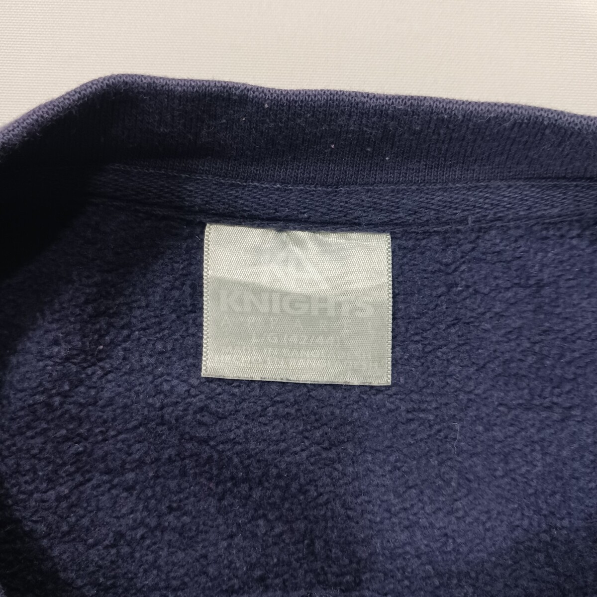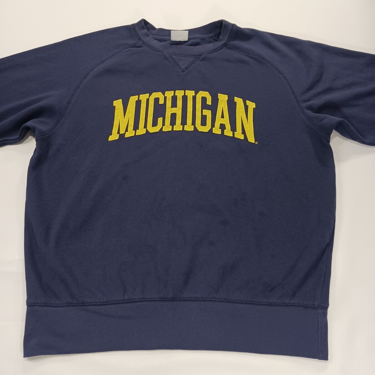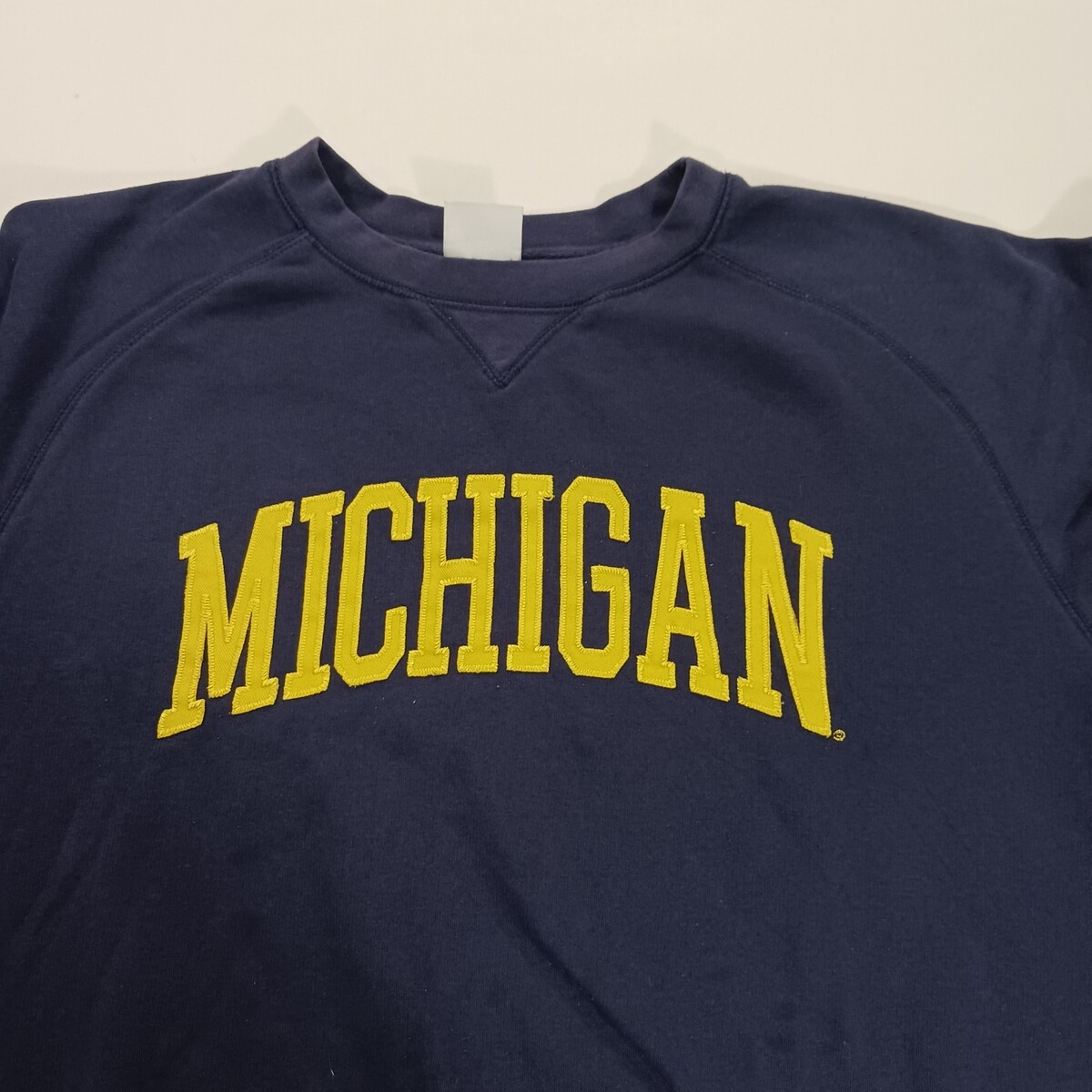 The product is a mens pullover sweatshirt featuring the Michigan Wolverines logo, designed by Knights Apparel. It is in size L and the color is blue, making it a perfect piece of fan apparel for football enthusiasts. The sweatshirt is officially licensed for the Michigan Wolverines team and is perfect for wearing during the regular season games. Made in Bangladesh, this sweatshirt combines quality and style for any fan of the team, particularly those who support Joe Montana.