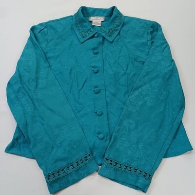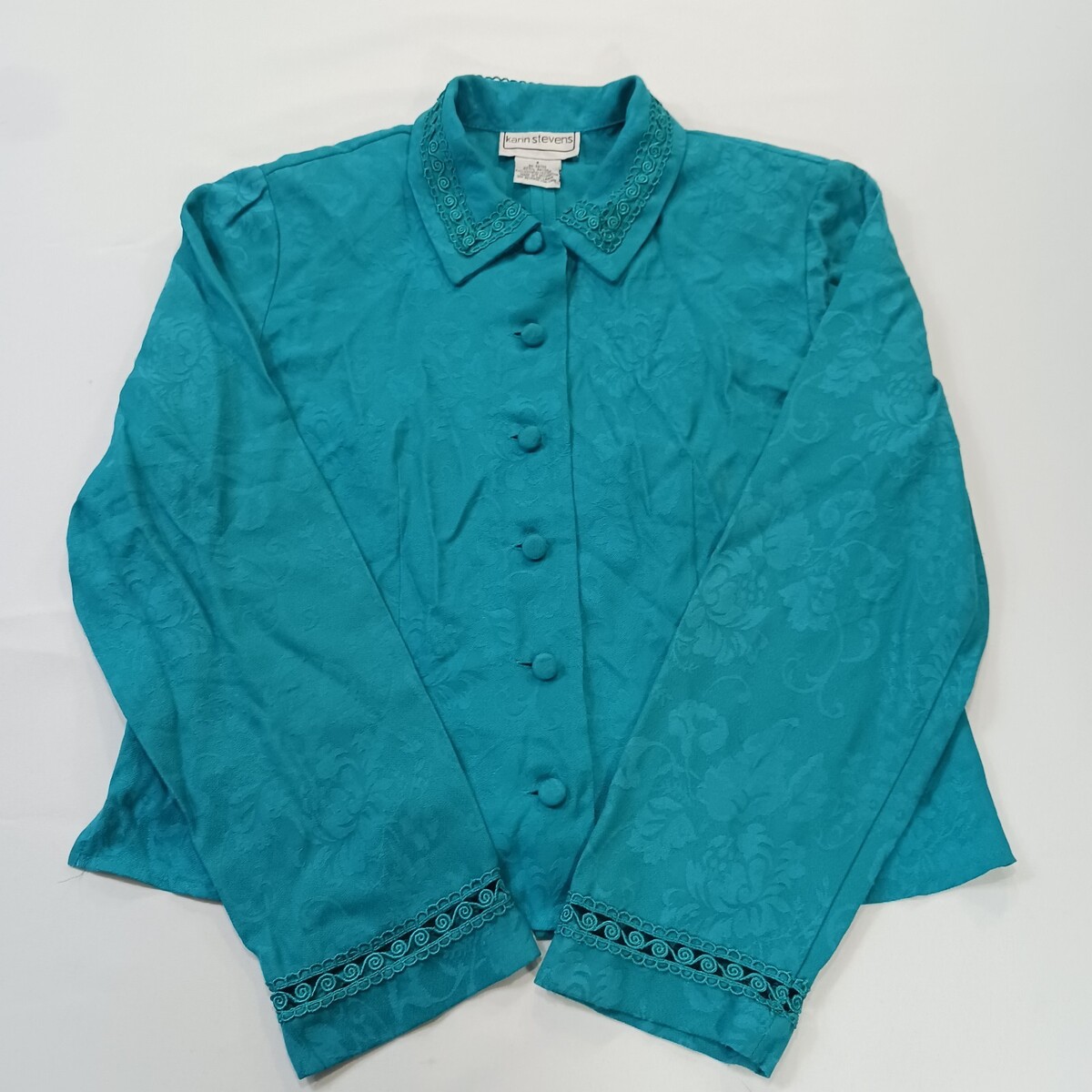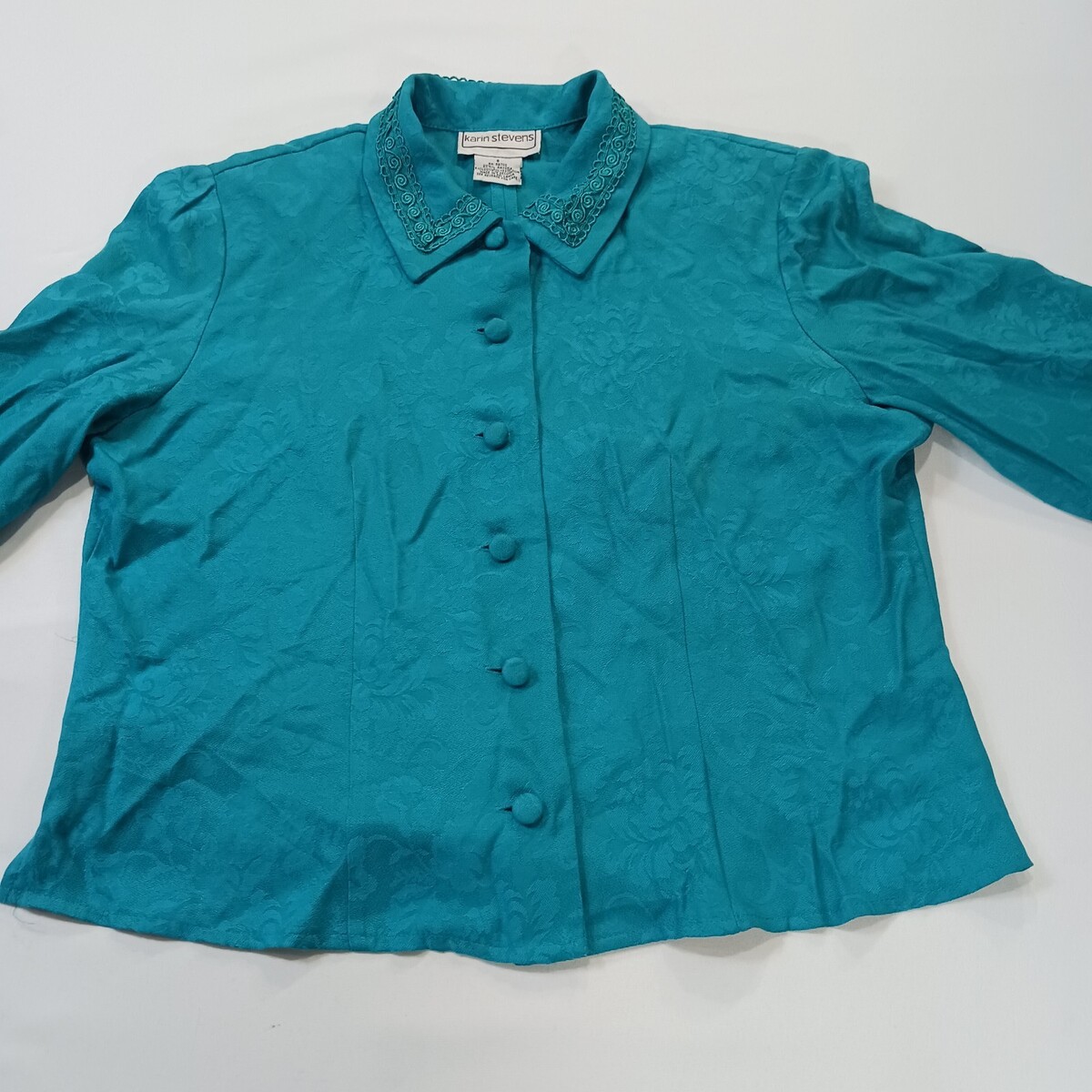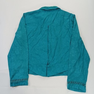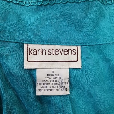 The Karin Stevens Women's Turquoise Open Back Front Button Blazer Jacket in size 8 is a stylish and sophisticated outerwear piece for women. Made from a rayon blend outer shell material and lined with polyester, this blazer features a solid turquoise color and long sleeves with buttons for closure. The jacket has a length of 21 inches and a regular fit, making it a versatile and fashionable addition to any woman's wardrobe. Perfect for both casual and formal occasions, this blazer from the Karin Stevens brand is a timeless and elegant choice for the modern woman.