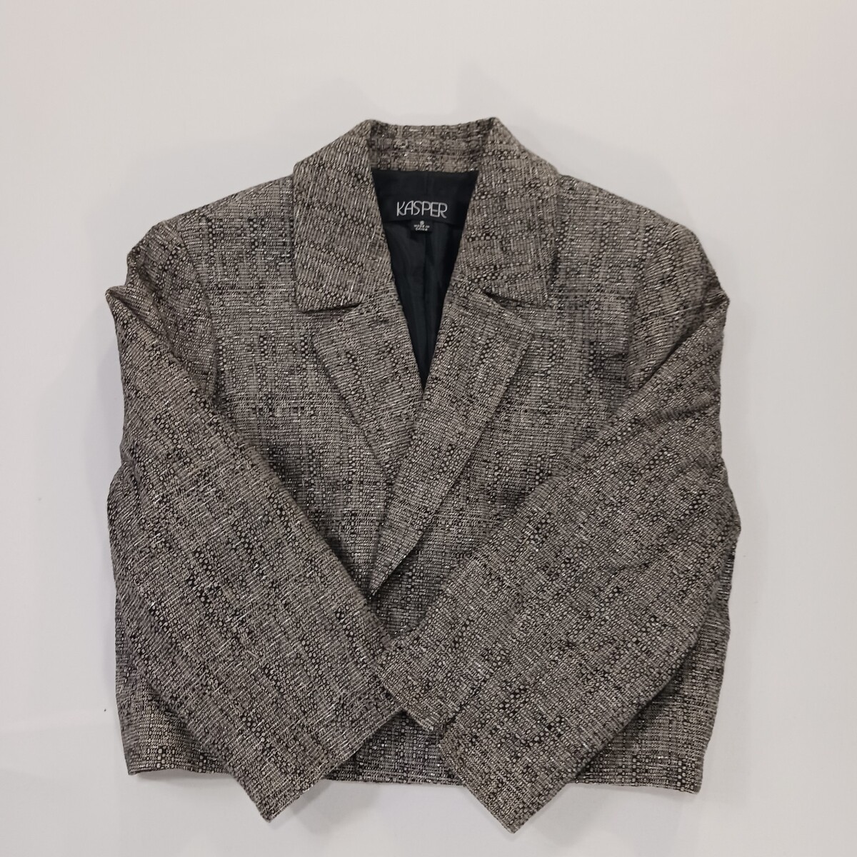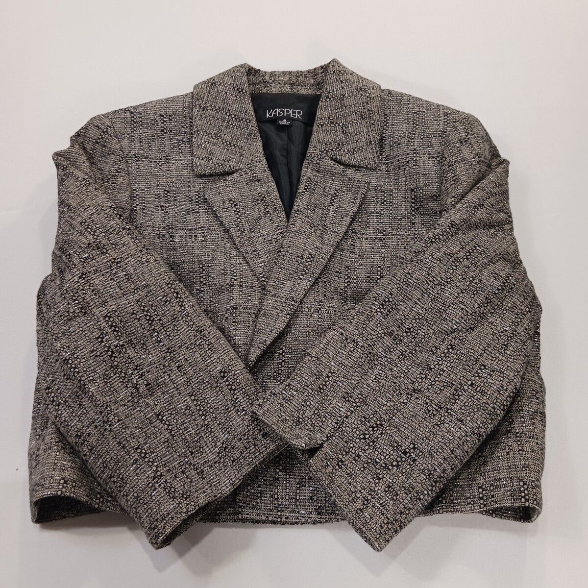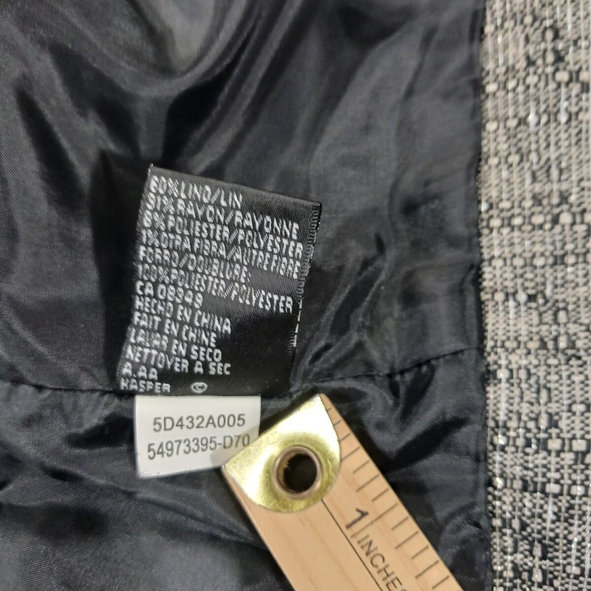 The Kasper Blazer in women's size 8 is a stylish and versatile career jacket made from a linen blend material in a sophisticated gray color. This cropped open front blazer features long sleeves and a regular fit, making it perfect for formal occasions or parties. With a classic and timeless design, this blazer is suitable for the winter, fall, and spring seasons, adding a touch of elegance to any outfit. Made in China by the reputable brand Kasper, this blazer is a must-have addition to any woman's wardrobe.