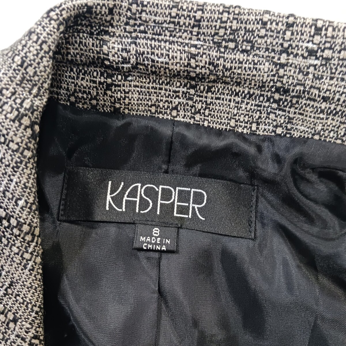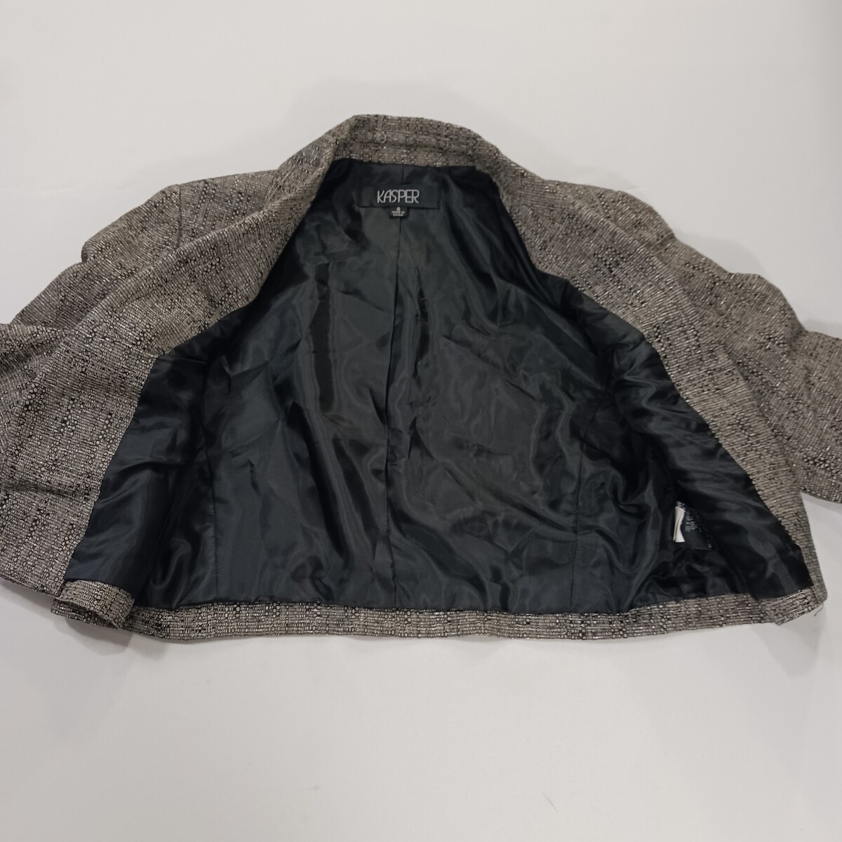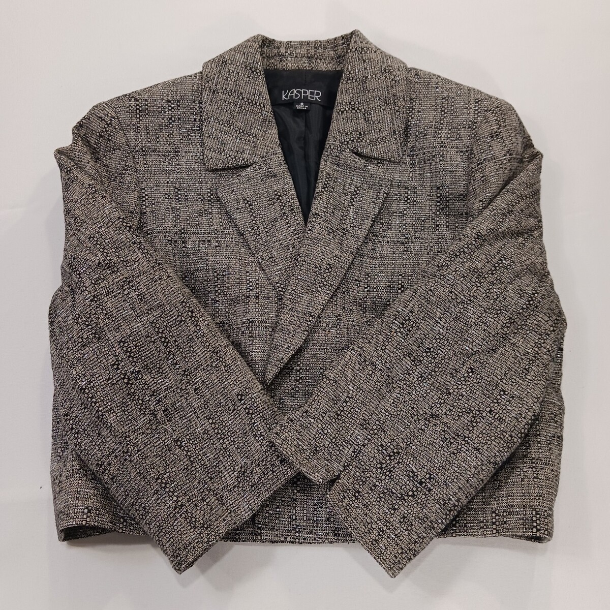 The Kasper Blazer in women's size 8 is a stylish and versatile career jacket made from a linen blend material in a sophisticated gray color. This cropped open front blazer features long sleeves and a regular fit, making it perfect for formal occasions or parties. With a classic and timeless design, this blazer is suitable for the winter, fall, and spring seasons, adding a touch of elegance to any outfit. Made in China by the reputable brand Kasper, this blazer is a must-have addition to any woman's wardrobe.