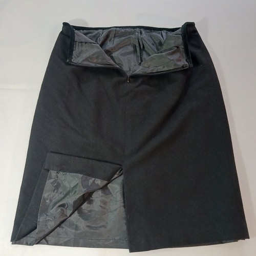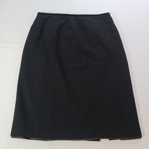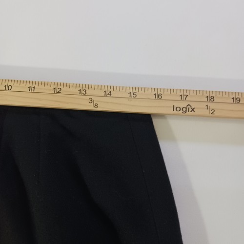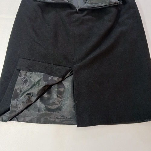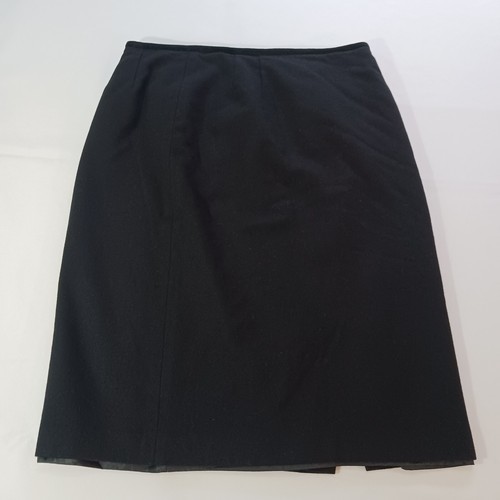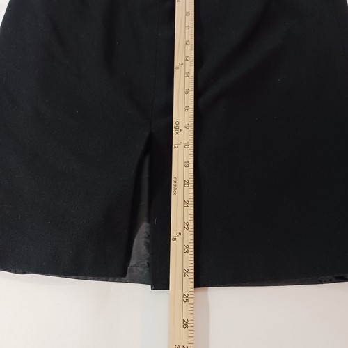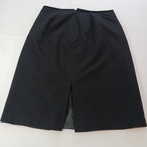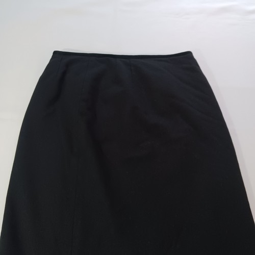 This Kasper skirt is a classic and versatile piece for work or business attire. It is a black A-line skirt made from a blend of polyester and wool, featuring a rear zip closure and a slit detail. The skirt is size 12 with a waist measurement of 31 inches and a length of 24.5 inches, making it suitable for various occasions throughout the year. With its solid pattern, lined interior, and zipper accents, this skirt offers a stylish and comfortable option for professional settings.