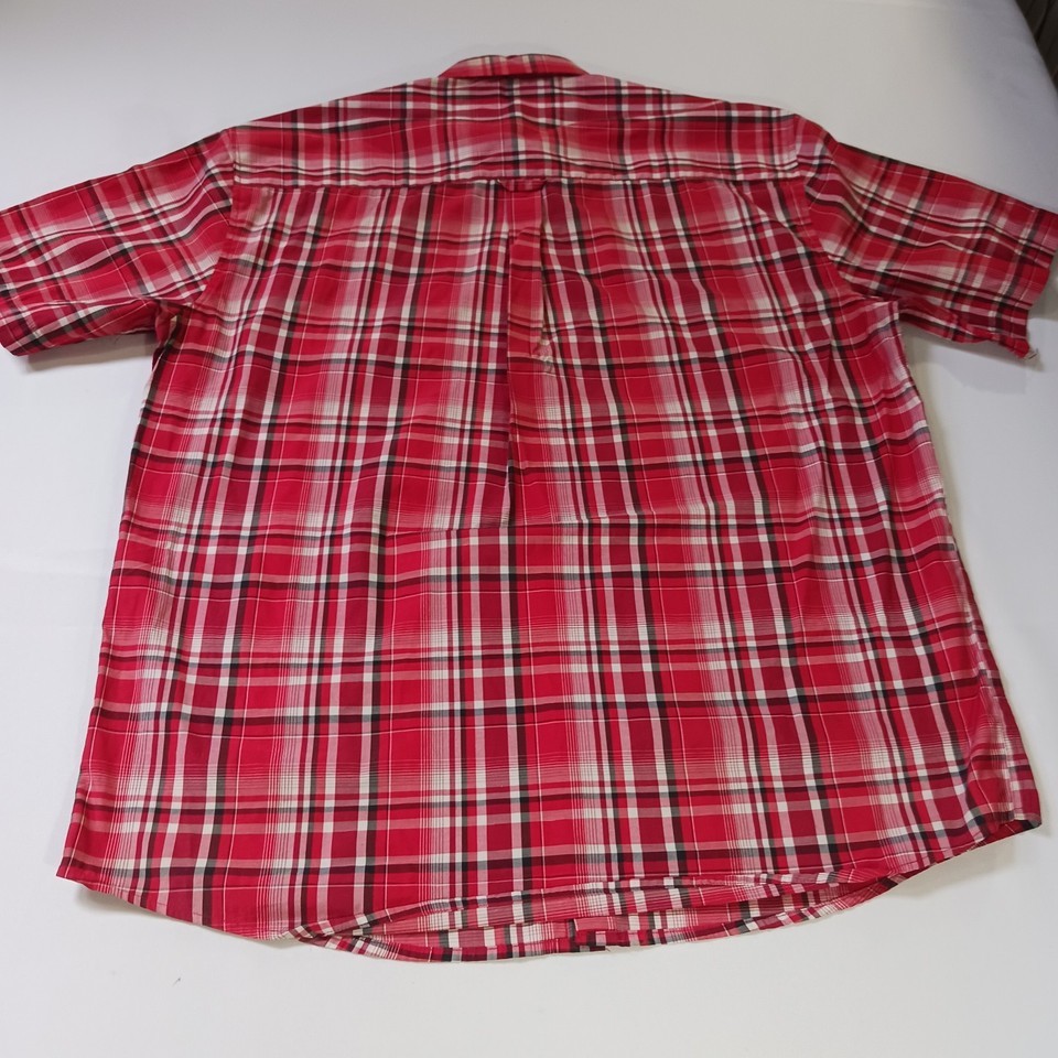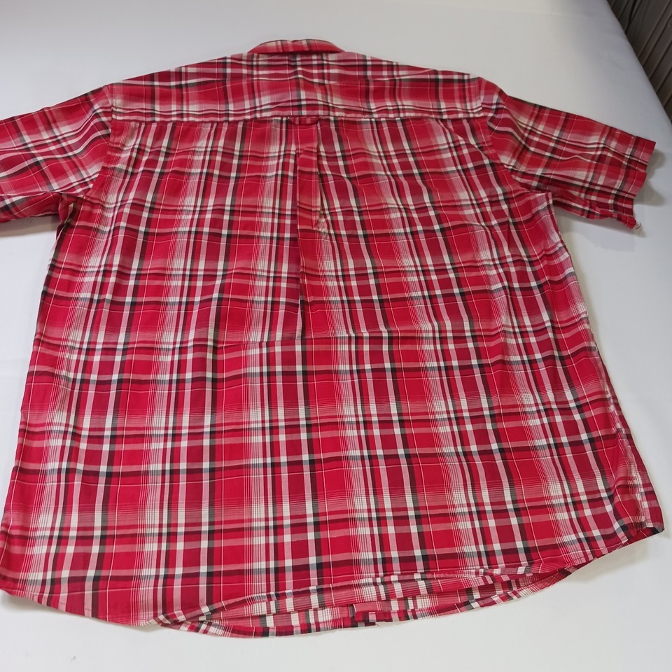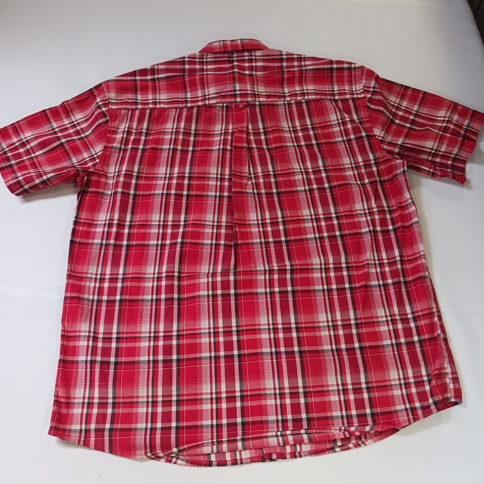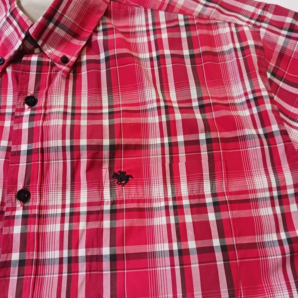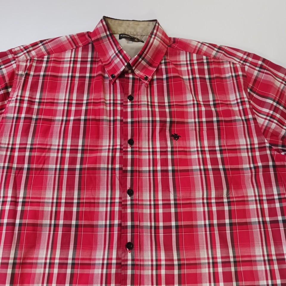 The Kings Club Sportswear Men's Red/White Plaid Short Sleeve Button-Down Shirt in size L is a stylish and versatile piece perfect for casual occasions. Made from polyester fabric, this shirt features a button front closure, short sleeves, and a regular fit. The red and white plaid pattern adds a colorful touch to your outfit, making it a great choice for all seasons. With a chest size of 50 inches, this shirt is machine washable and designed by the brand Kings Club, offering quality and style for the modern man.