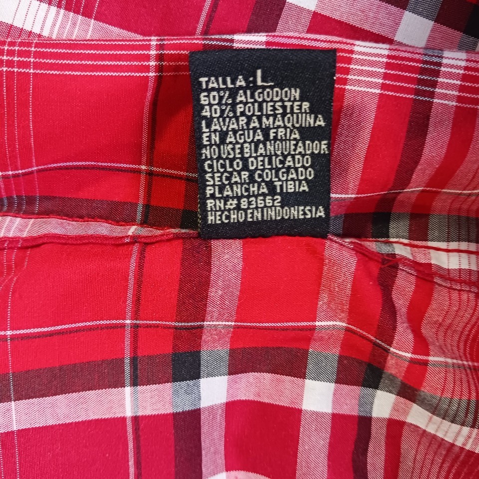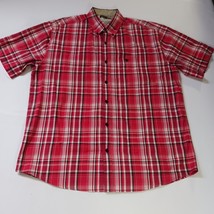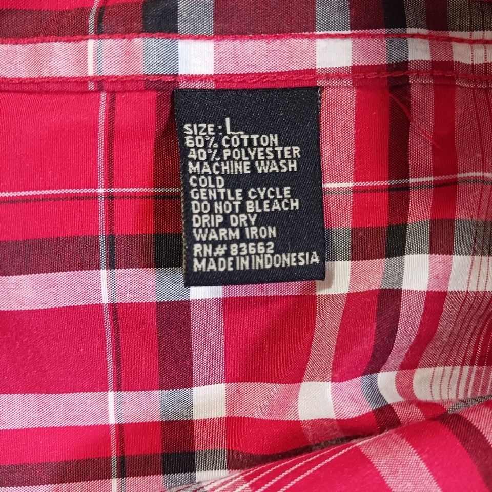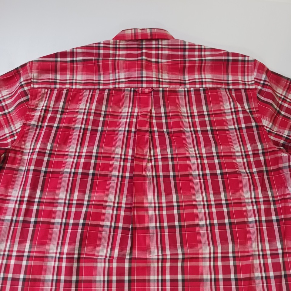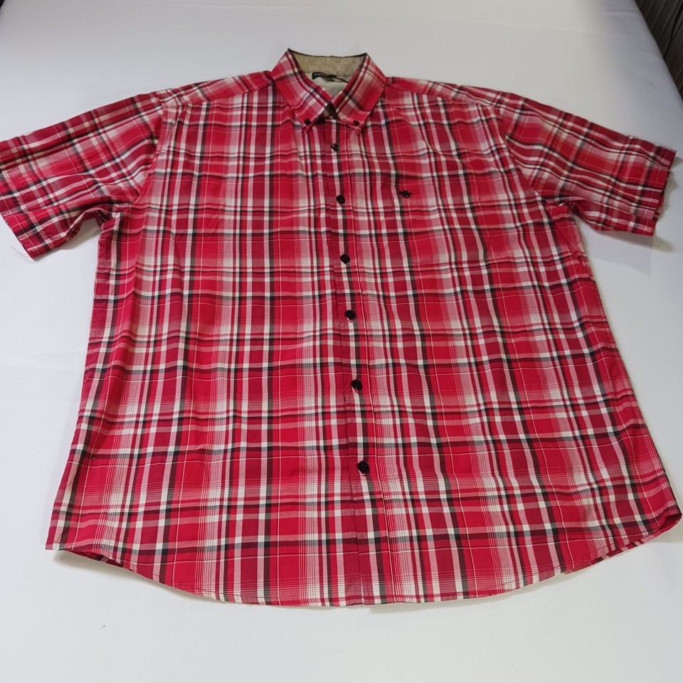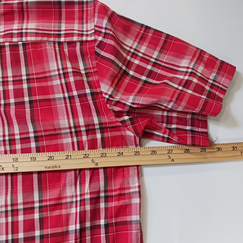 The Kings Club Sportswear Men's Red/White Plaid Short Sleeve Button-Down Shirt in size L is a stylish and versatile piece perfect for casual occasions. Made from polyester fabric, this shirt features a button front closure, short sleeves, and a regular fit. The red and white plaid pattern adds a colorful touch to your outfit, making it a great choice for all seasons. With a chest size of 50 inches, this shirt is machine washable and designed by the brand Kings Club, offering quality and style for the modern man.