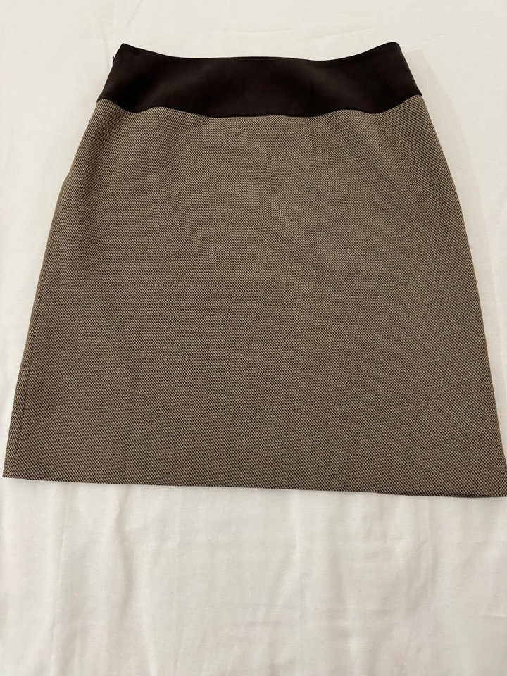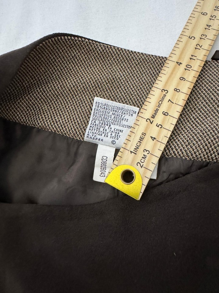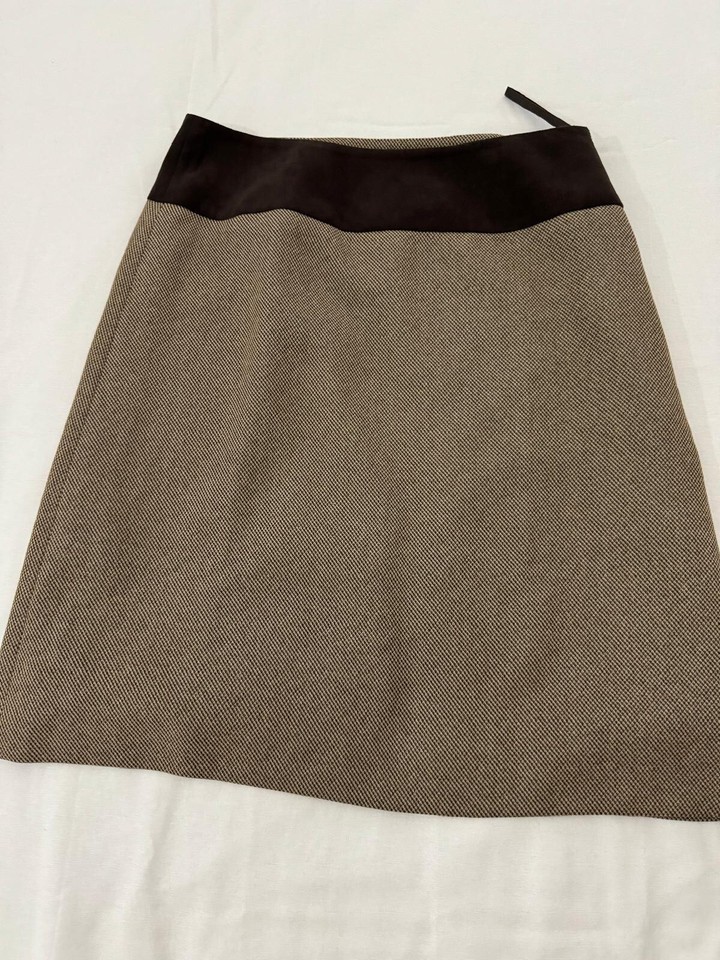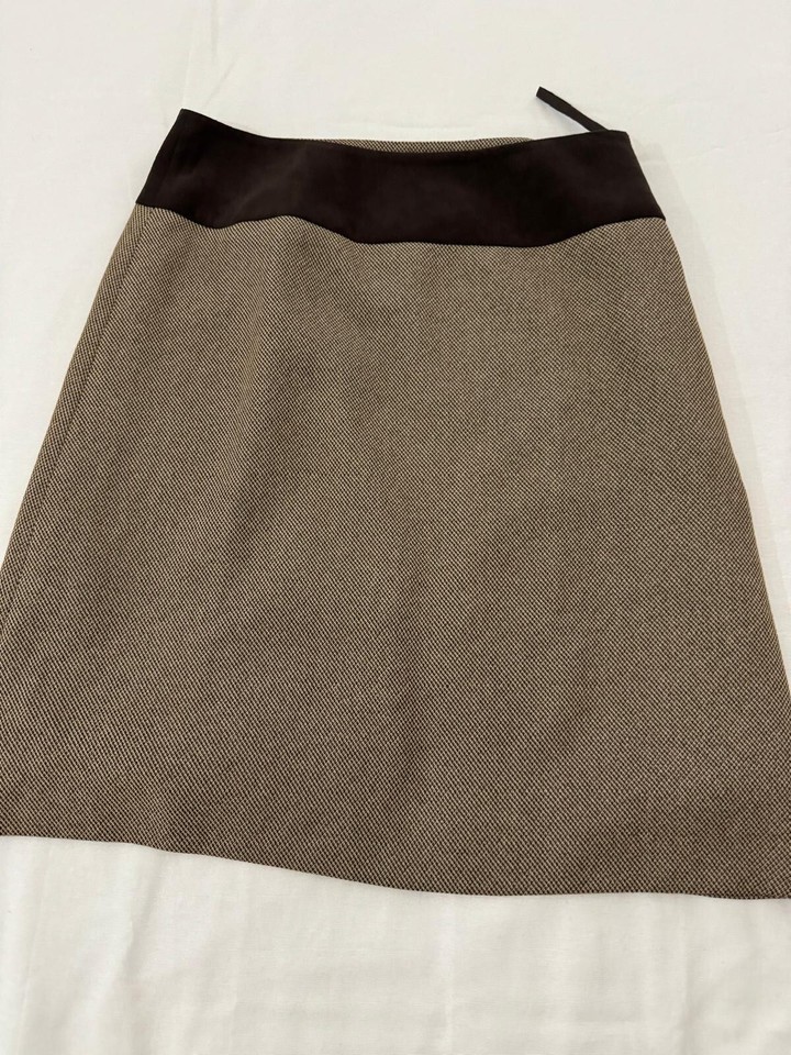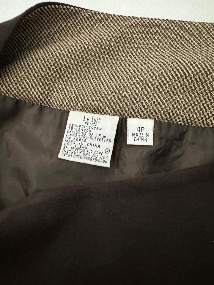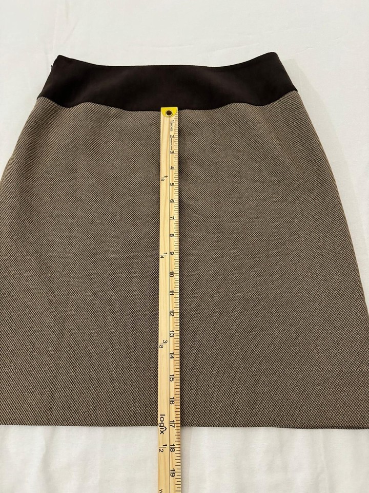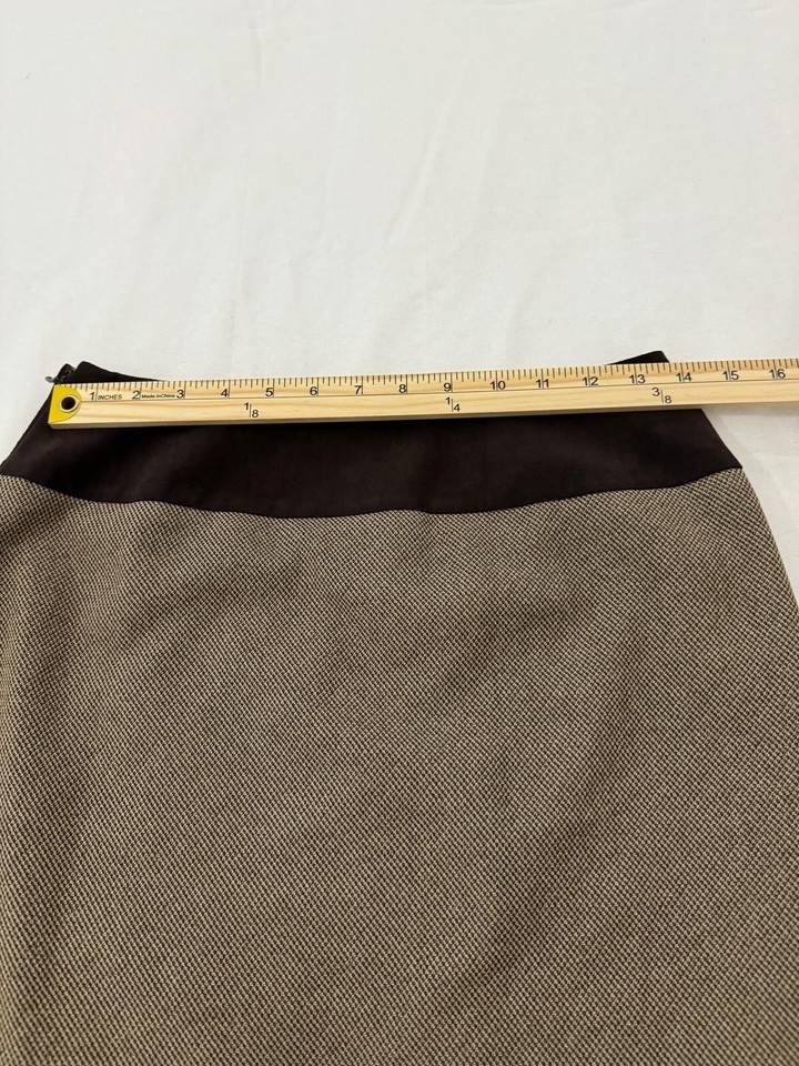 This Le Suit Petite women's A-line skirt in brown is designed in a knee-length style with a pull-on closure for ease of wear. Made of a blend of polyester and rayon, the skirt features a zipper accent and is lined for added comfort. The size is 4P with a measured waist of 28 inches, suitable for petites. This versatile and stylish skirt is ideal for professional or casual occasions.