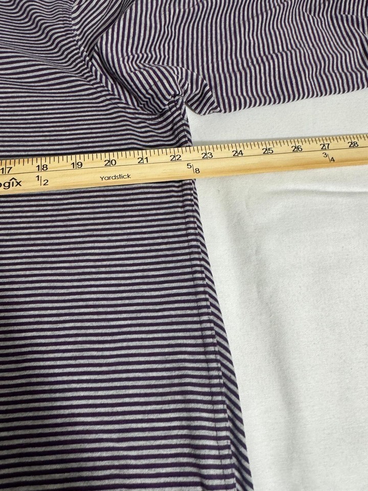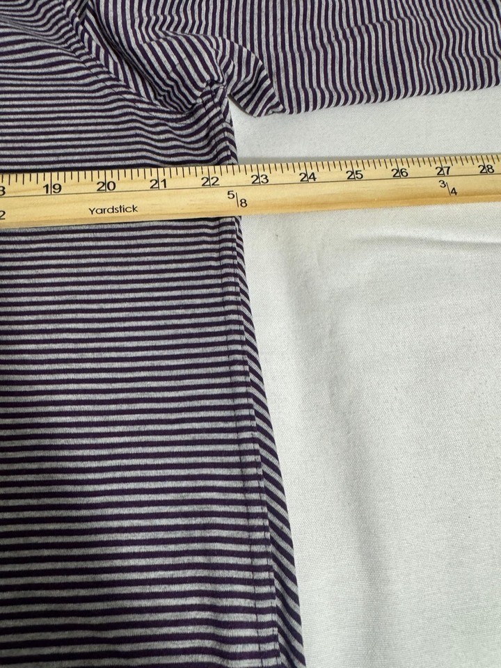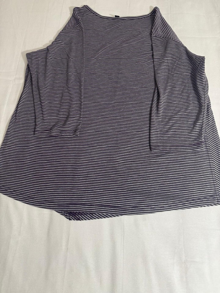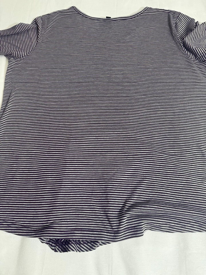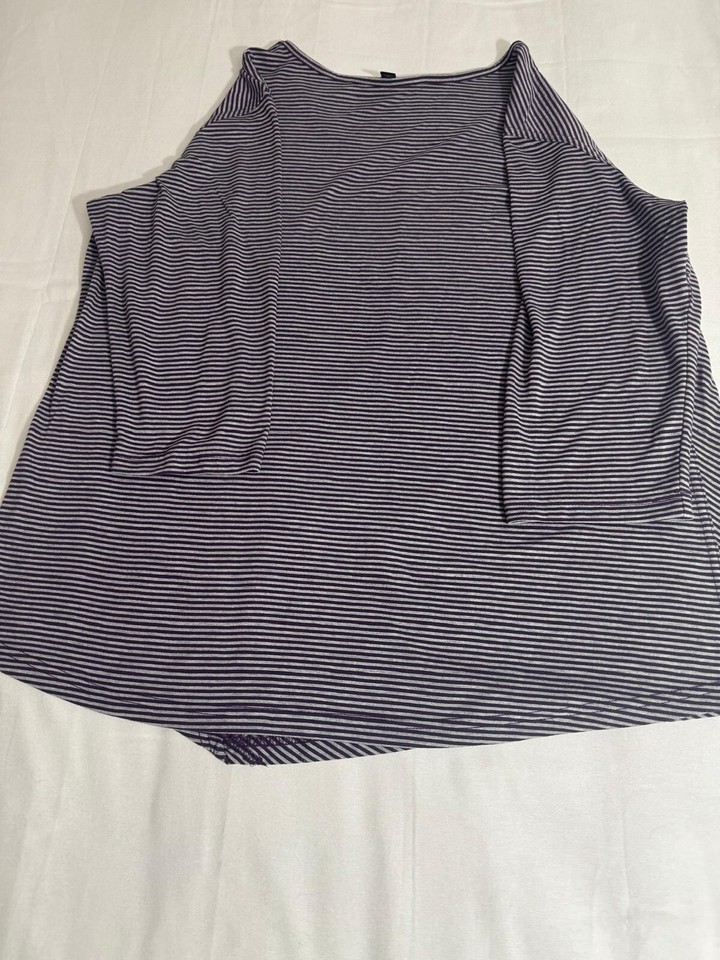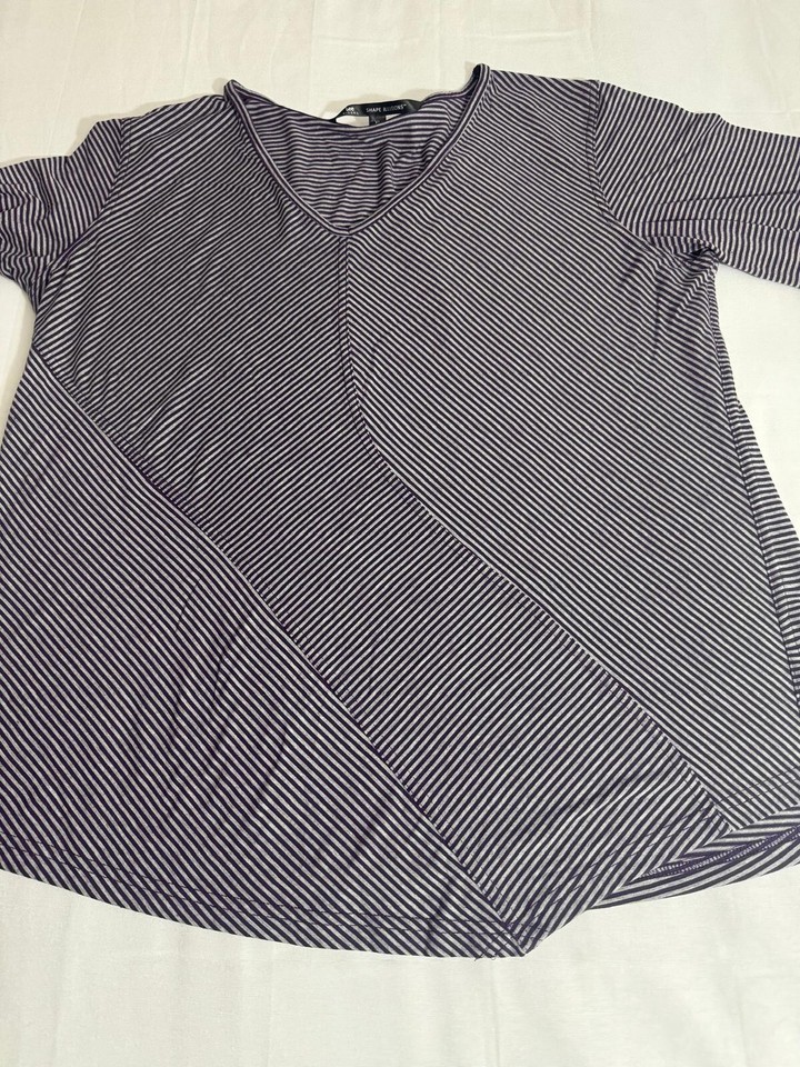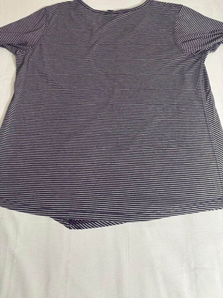 This Lee Riders Shape Illusions top is a XL size blouse with a scoop neck and long sleeves. It features purple and white stripes with a draped left side for a stylish accent. Made from polyester, rayon, and polyester blend, this top offers a regular fit and is from the brand Lee. Perfect for women looking for a comfortable and trendy addition to their wardrobe.