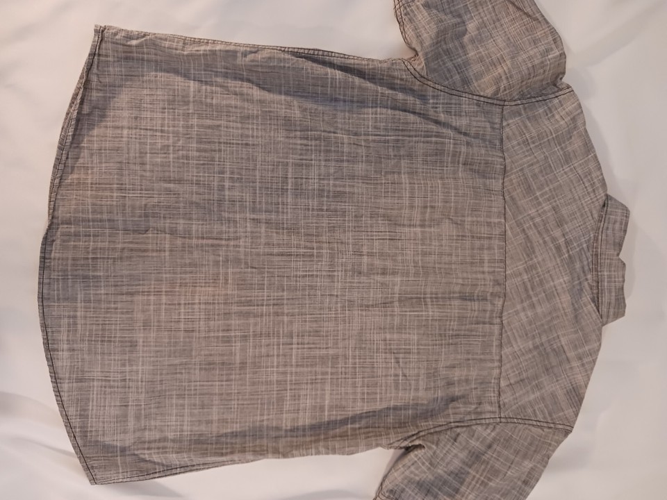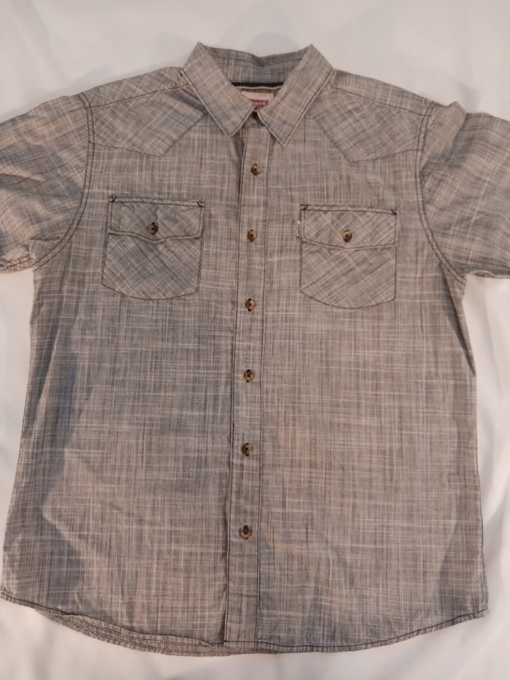 This Levi Strauss & Co men's shirt features a stylish spread collar and short sleeves, making it perfect for both casual and business occasions. The gray color and solid pattern are versatile, and the cotton fabric is comfortable and machine washable. The button closure and 2 pockets with pleated accents add functional and fashionable elements to this shirt.