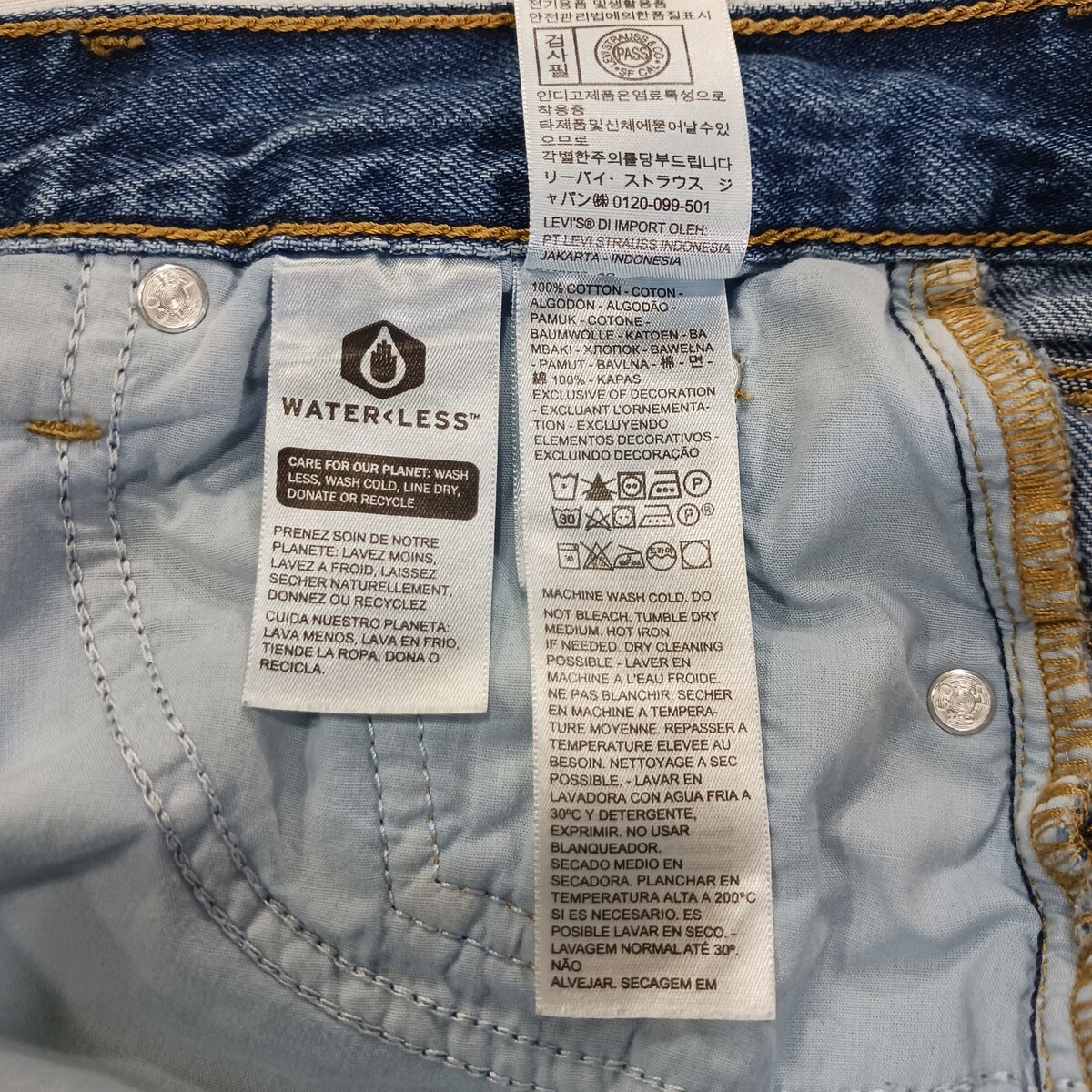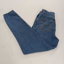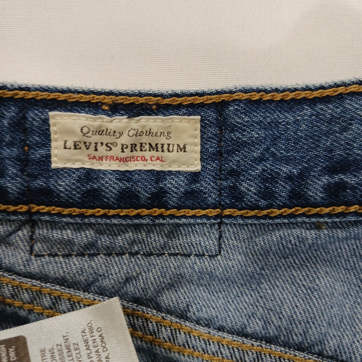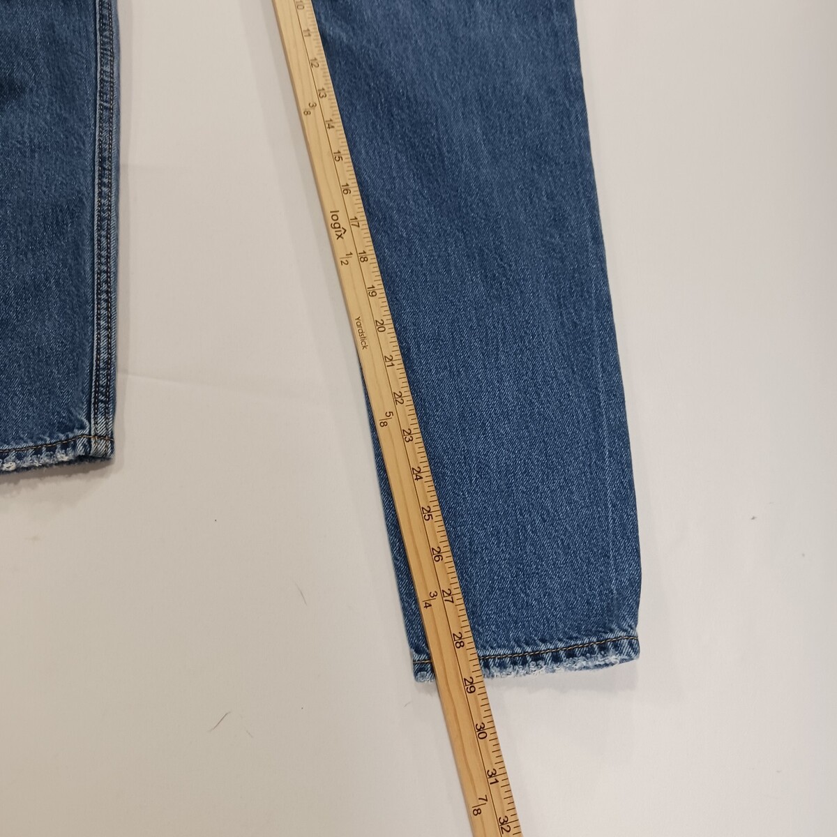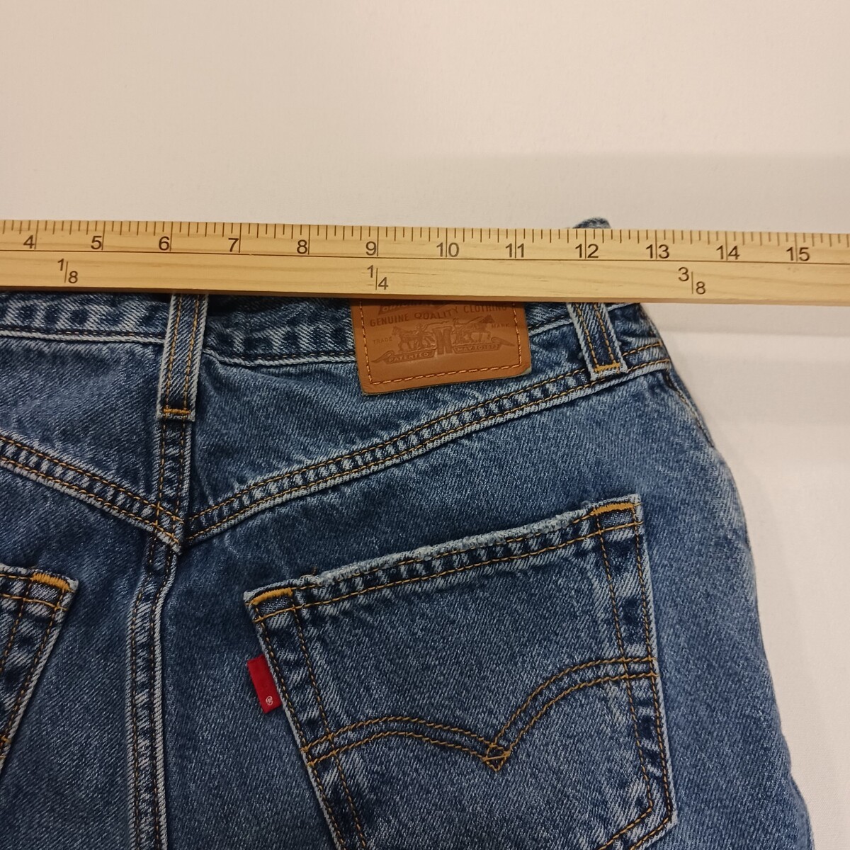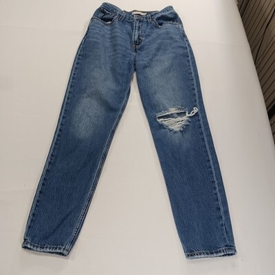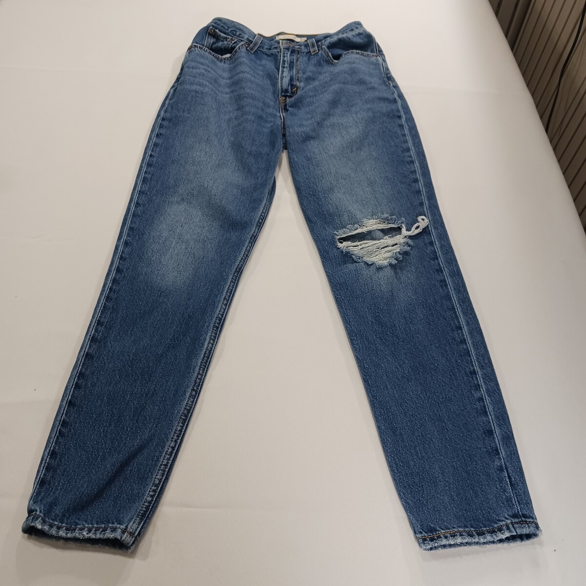 The product is a pair of Levi's Premium Women's Blue Denim 80s Mom Distressed Jeans in size W26×L30. These jeans are made with a mix of spandex and cotton, featuring a solid pattern and a high-rise fit for a relaxed, retro look. The denim fabric wash is medium, with a 5-pocket design and a zip closure. Perfect for all seasons, these jeans are machine washable and designed to last. The black distressed detailing adds a trendy touch to this classic wardrobe staple.