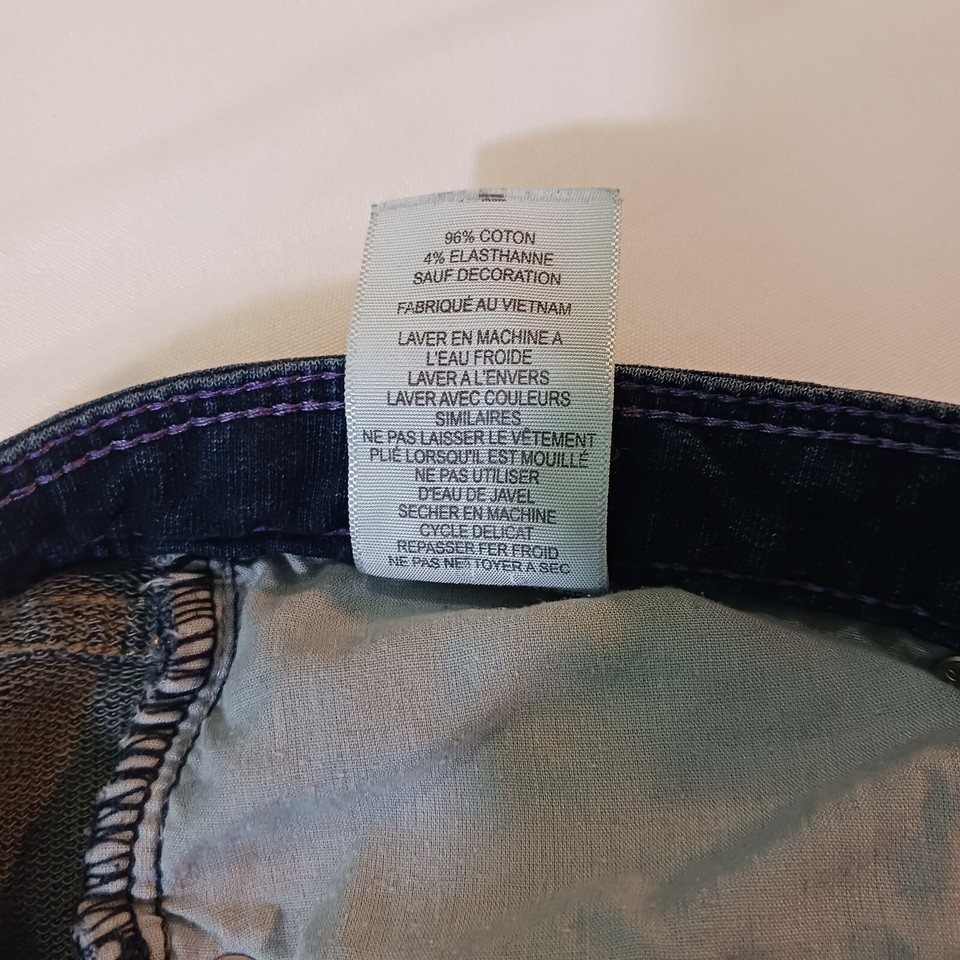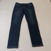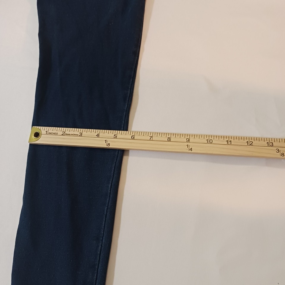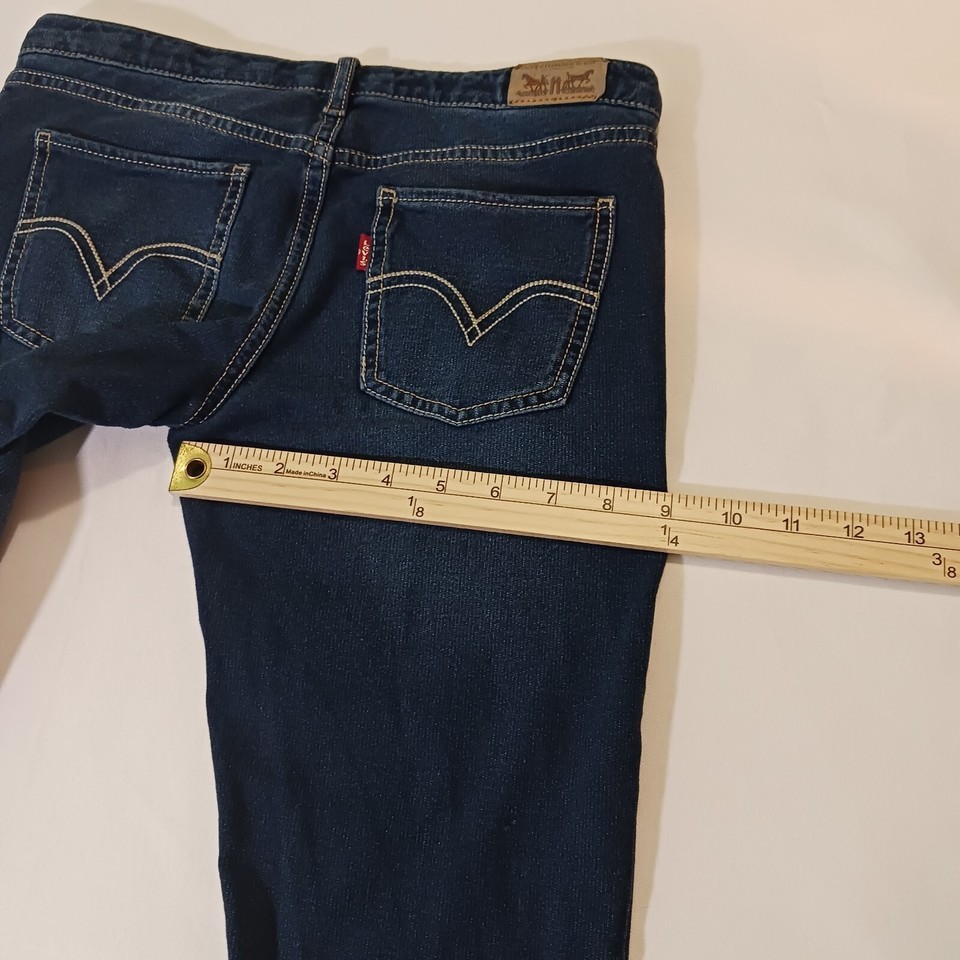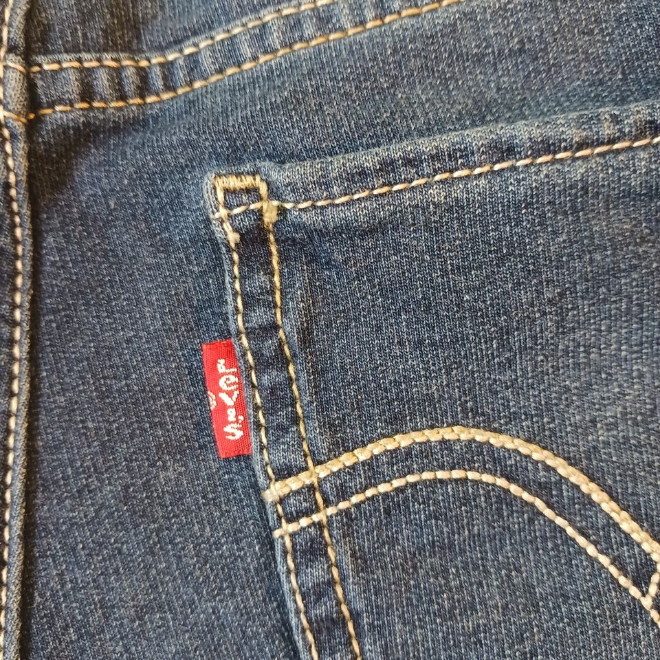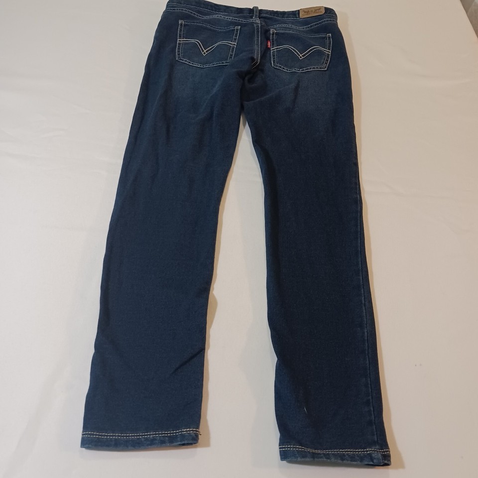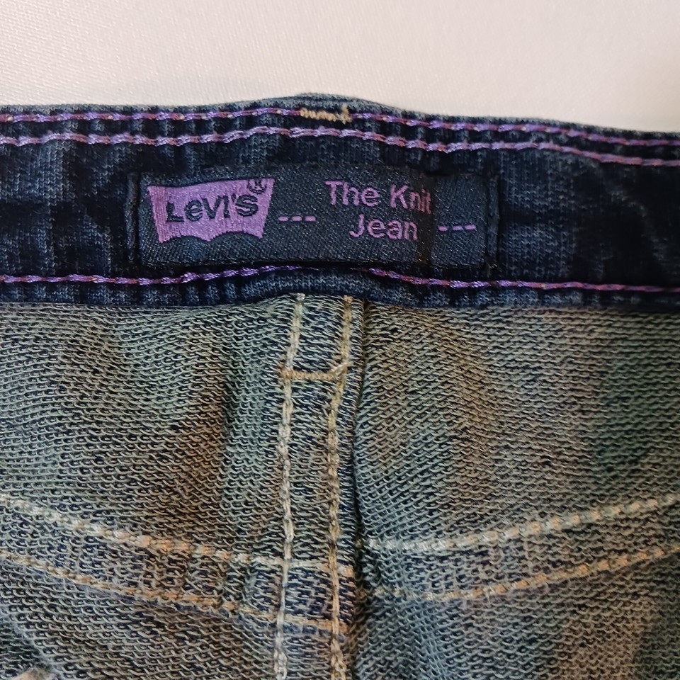 Elevate your wardrobe with these Levi's Knit Jeans in Blue Denim. These pants are made with a spandex and cotton blend that stretches for a comfortable fit. The elastic waist provides an added level of comfort for everyday wear. The solid pattern and tapered style create a classic American look, and the crop length and button accents add a touch of uniqueness. These pre-owned jeans are perfect for teens and women alike.