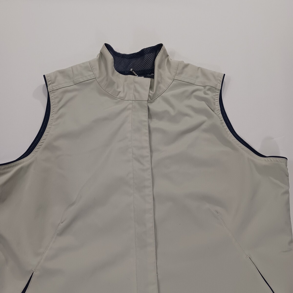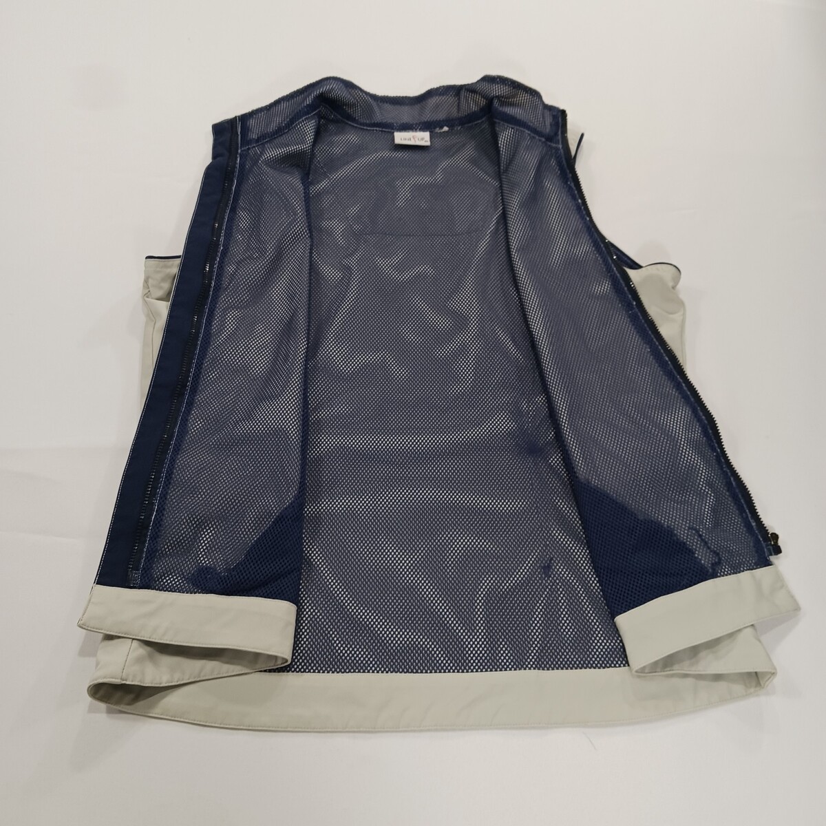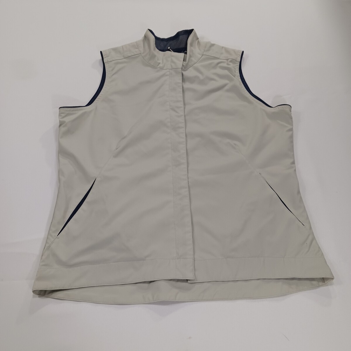 The Line Up For Sports Men's Beige/Cream Full Zip Sleeveless Golf Vest in size Medium with a chest measurement of 41 inches is a stylish and functional activewear piece perfect for golf enthusiasts. Made from a comfortable cotton blend outer shell material, this vest features a solid beige color and a vintage theme, adding a classic touch to your sports wardrobe. The button closure, lined interior, and sleeveless design make it practical and suitable for active occasions such as golfing. Representing the brand Line-Up, this vest is a great addition to any unisex adult's collection for those who appreciate quality athletic apparel.